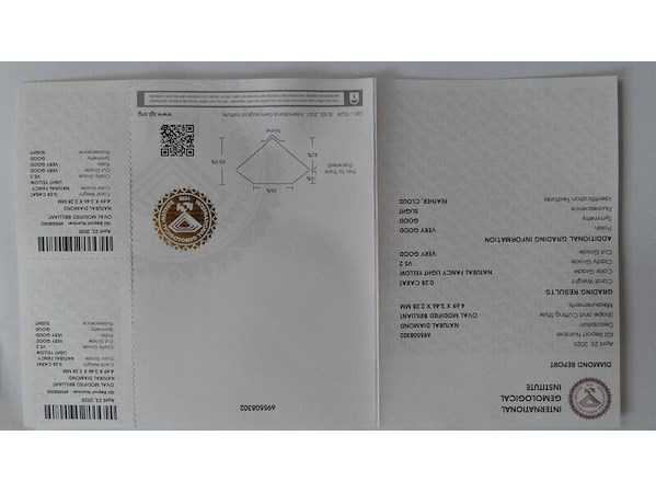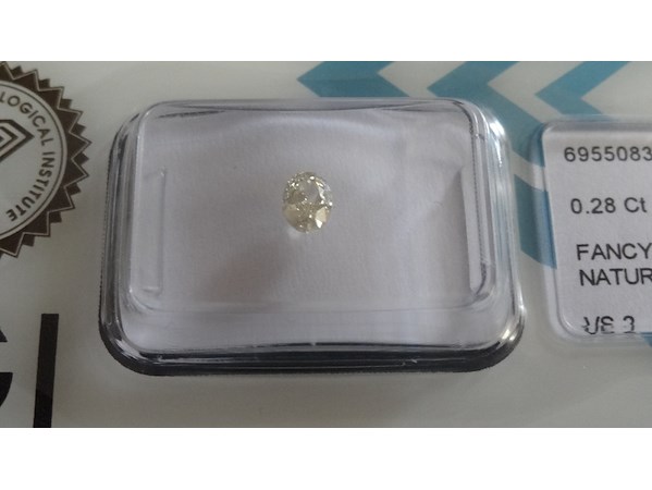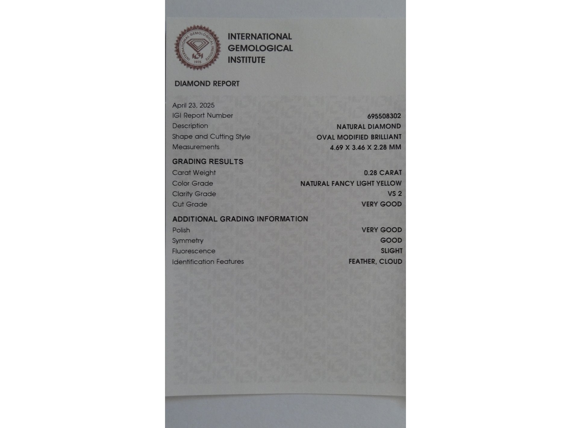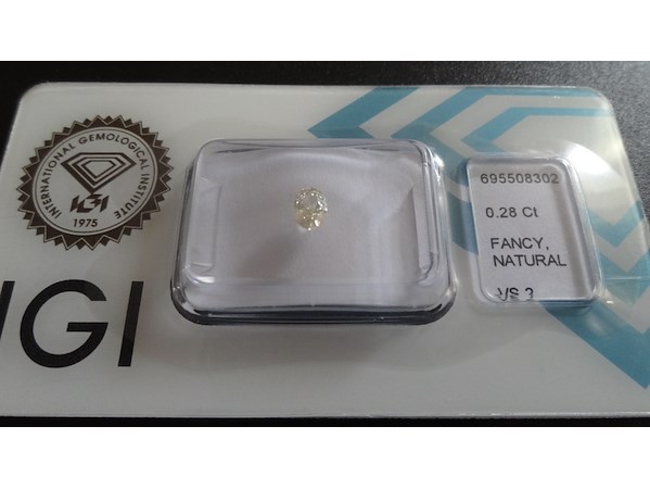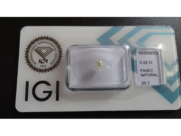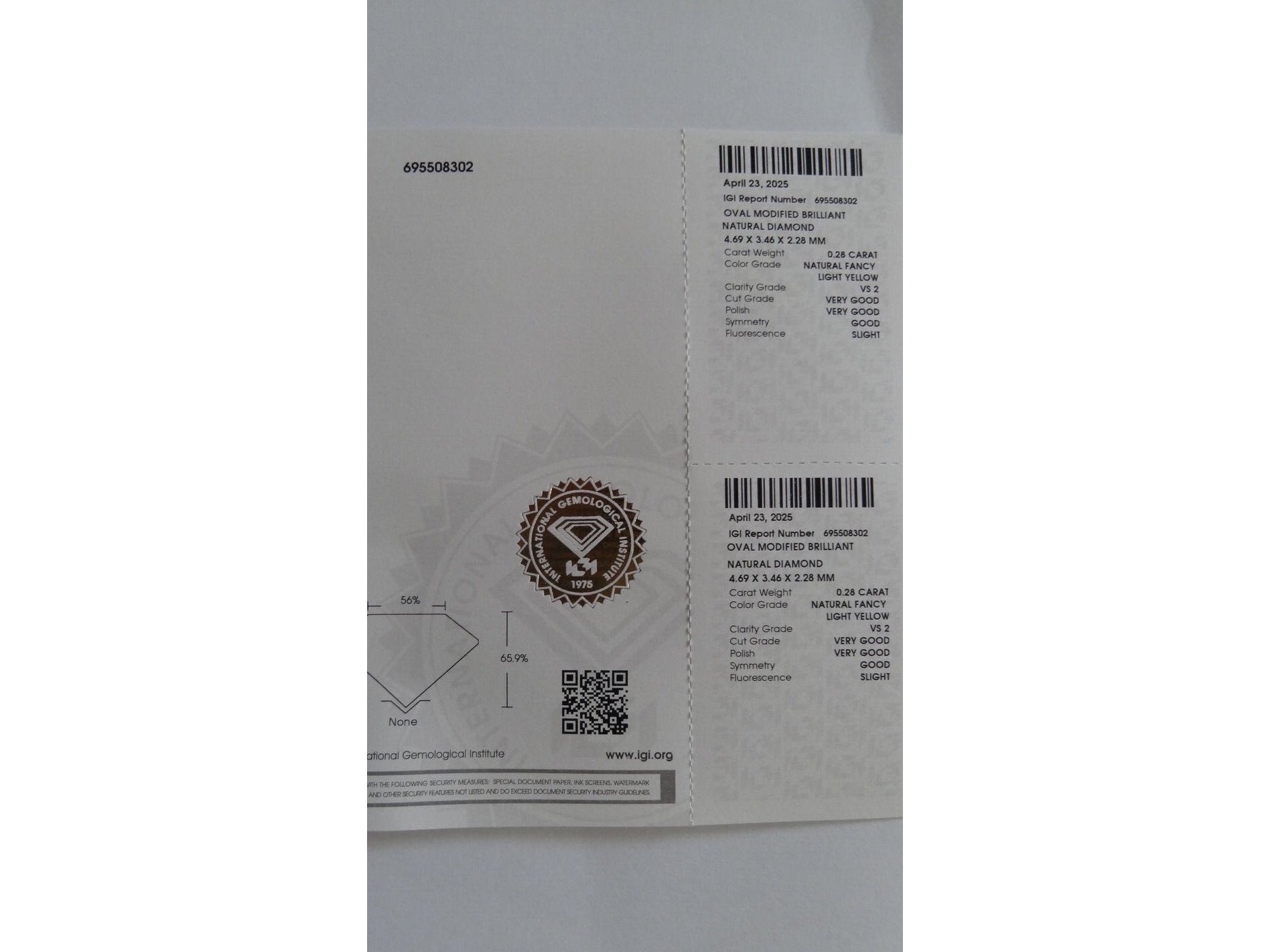 Product: Natural Diamond | 0.28ct ( IGI Gecertificeerd ) Conditie: Nieuw Specificaties: Natural diamond. Weight : 0.28 ct Shape : Oval modified brilliant Color : Fancy light yellow Clarity : VS 2 Sealed : Ja Dimensions : 4.69 x 3.46 x 2.28 mm Compleet met IGI certificaat