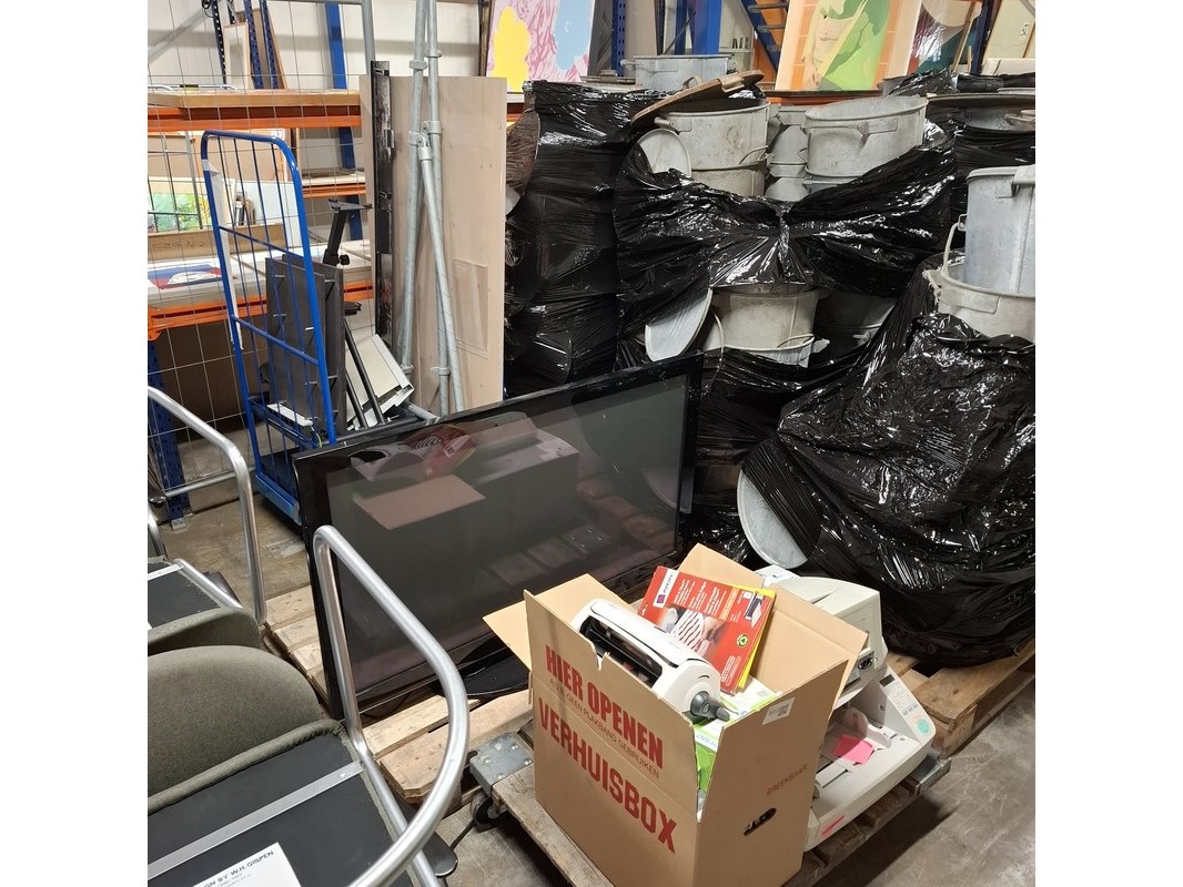 Product: Diverse multimedia en bedrijfsinventaris Afmeting: Diverse maten Conditie: gebruikt Specificaties: Bestaande uit: televisie, printer, lamineerapparaat, metalen poten, ladeblok en etc. De items hebben diverse beschadigingen en gebreken, technische staat en compleetheid onbekend.
