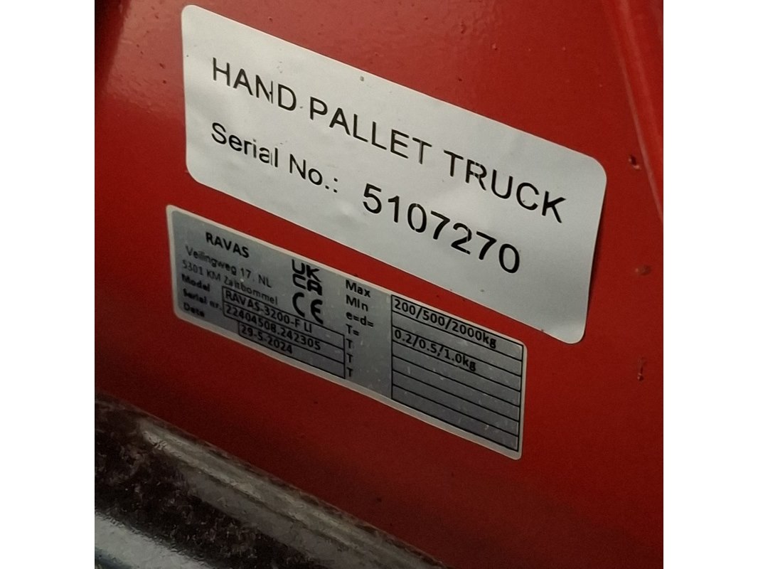 Merk: Ravas Product: Palletwagen met weegschaal Afmeting: Lepellengte ca. 115 cm. BouwJaar: 2024 Conditie: gebruikt Specificaties: Max. 2000 Kg. Bouwjaar: 2024 Exclusief lader t.b.v. weegschaal Technische staat en compleetheid onbekend