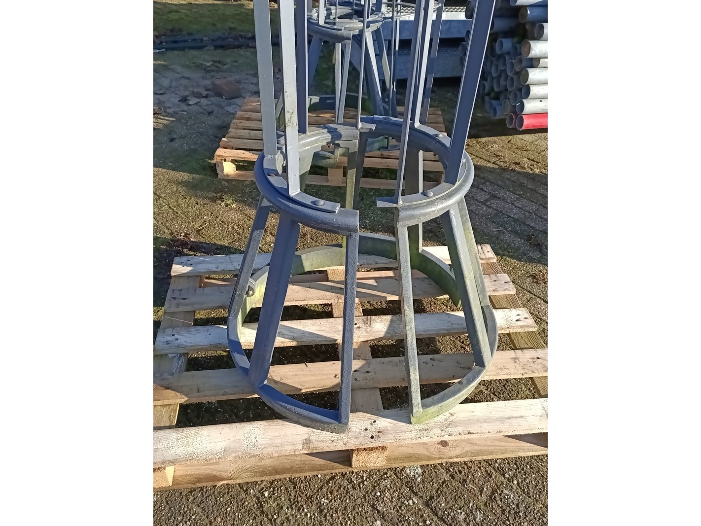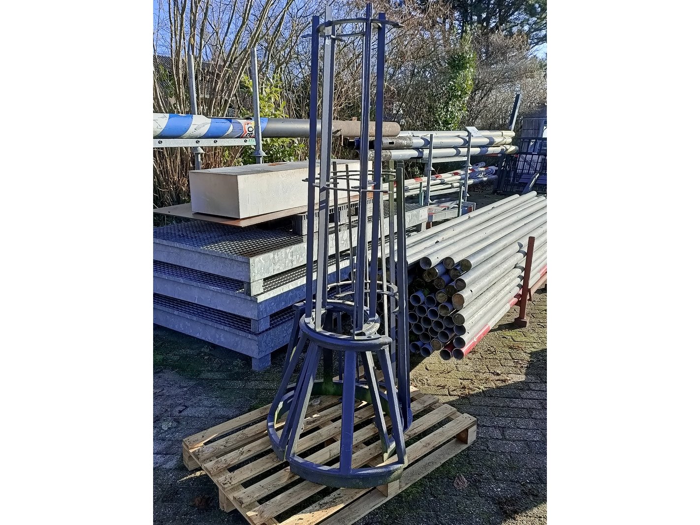 Product: Boomkorf Materiaal: metaal Afmeting: hxd ca. 185x45 cm Conditie: Gebruikt