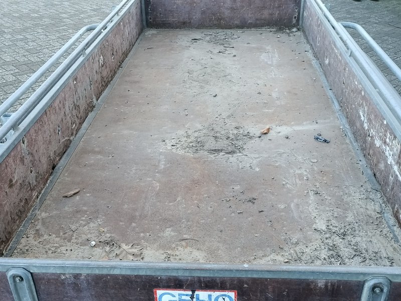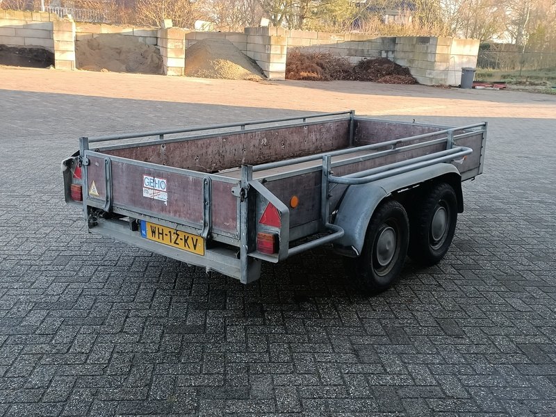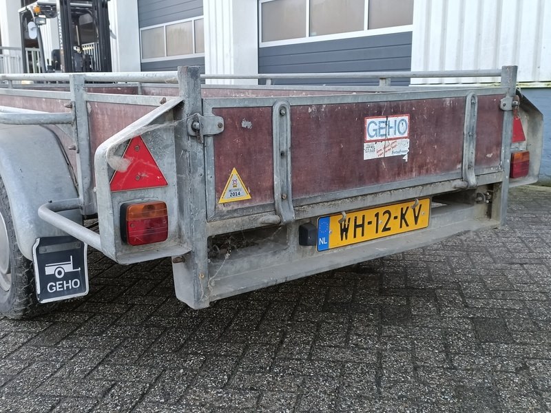 Merk: Geho Product: Aanhanger Afmeting: afmeting laadvloer ca. 300x130 cm BouwJaar: 1991 Conditie: Gebruikt Specificaties: Kenteken WH-12-KV Datum eerste toelating: 31 januari 1992 Laadvermogen: 1500 kg