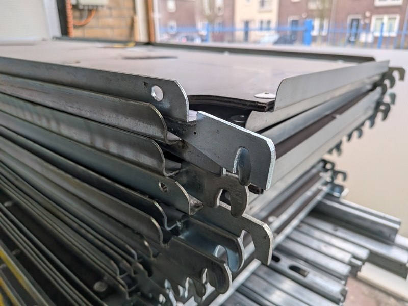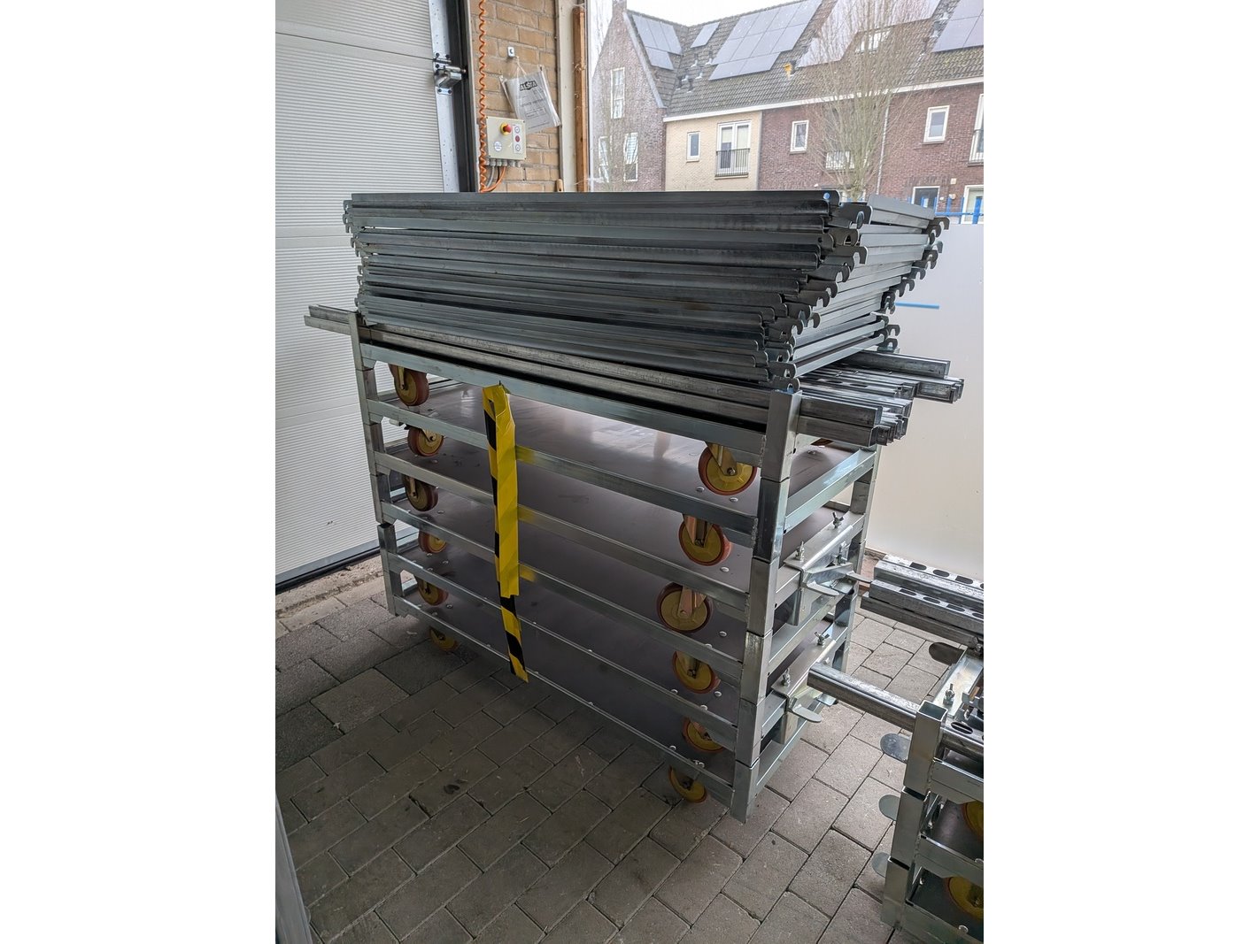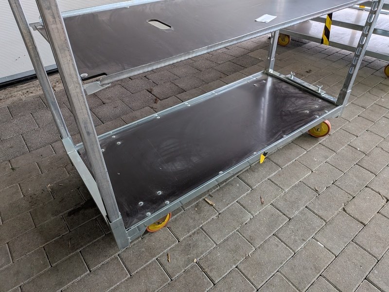Product: Deense kar Afmeting: (lxbxh) 1350 x 565 x 1900 mm Specificaties: Per kar opgebouwd met 3x legbord, 4x staander Voorzien van rem