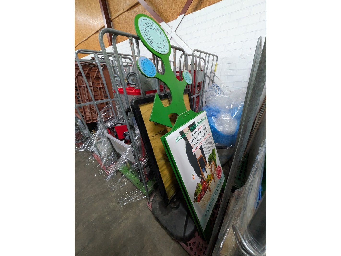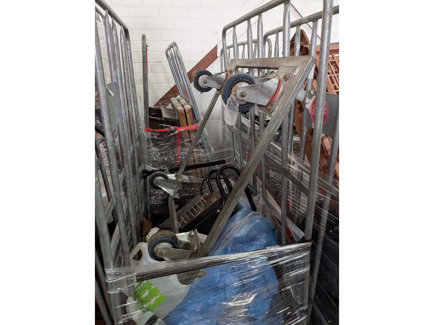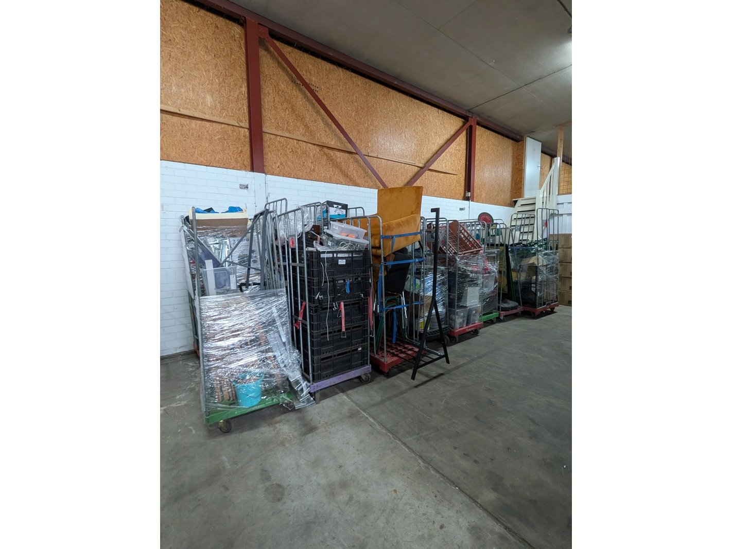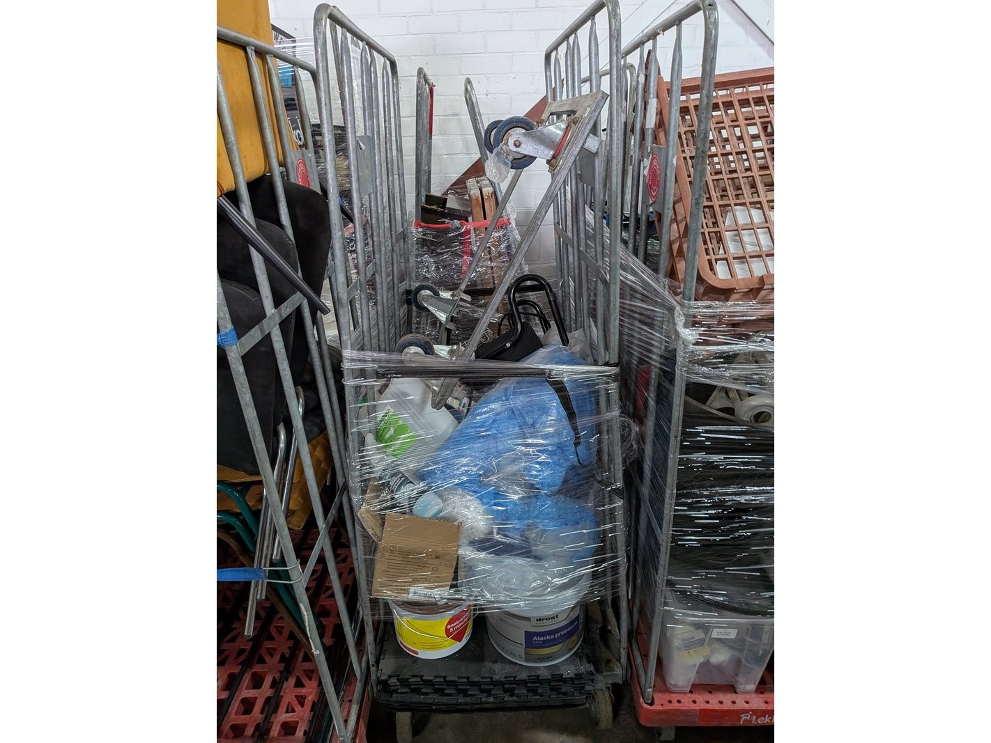 Product: Rolcontainer gevuld met diverse kantoor en magazijn goederen Conditie: gebruikt Specificaties: Bestaande uit o.a.: houten schragen, hotpot, diverse bekabeling, wielen, kratten, meubels, vloeistoffen, trap, reclameborden, veiligeheidsbril, kantoorkast, koffiemachine, 16x rolcontainer, etc.