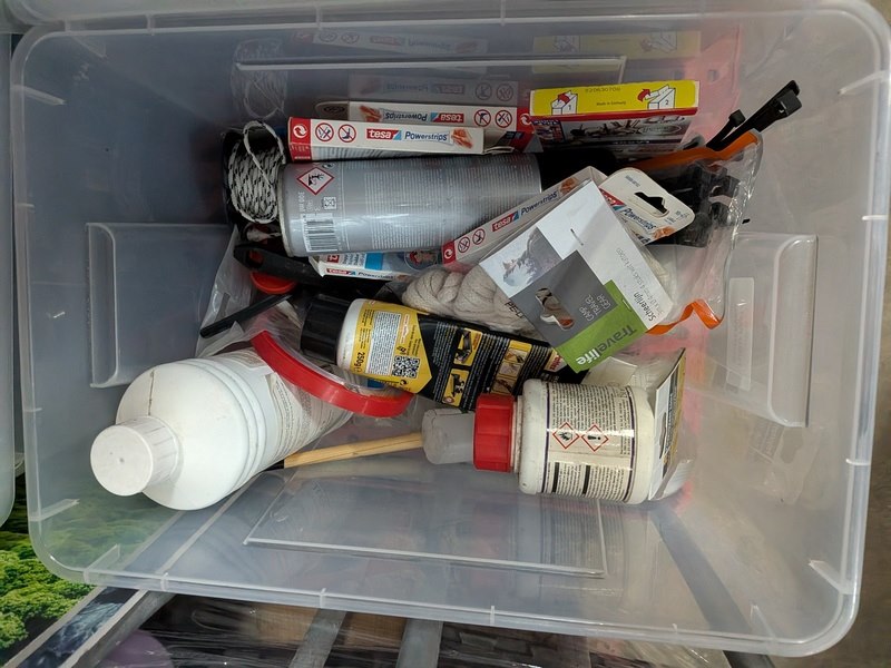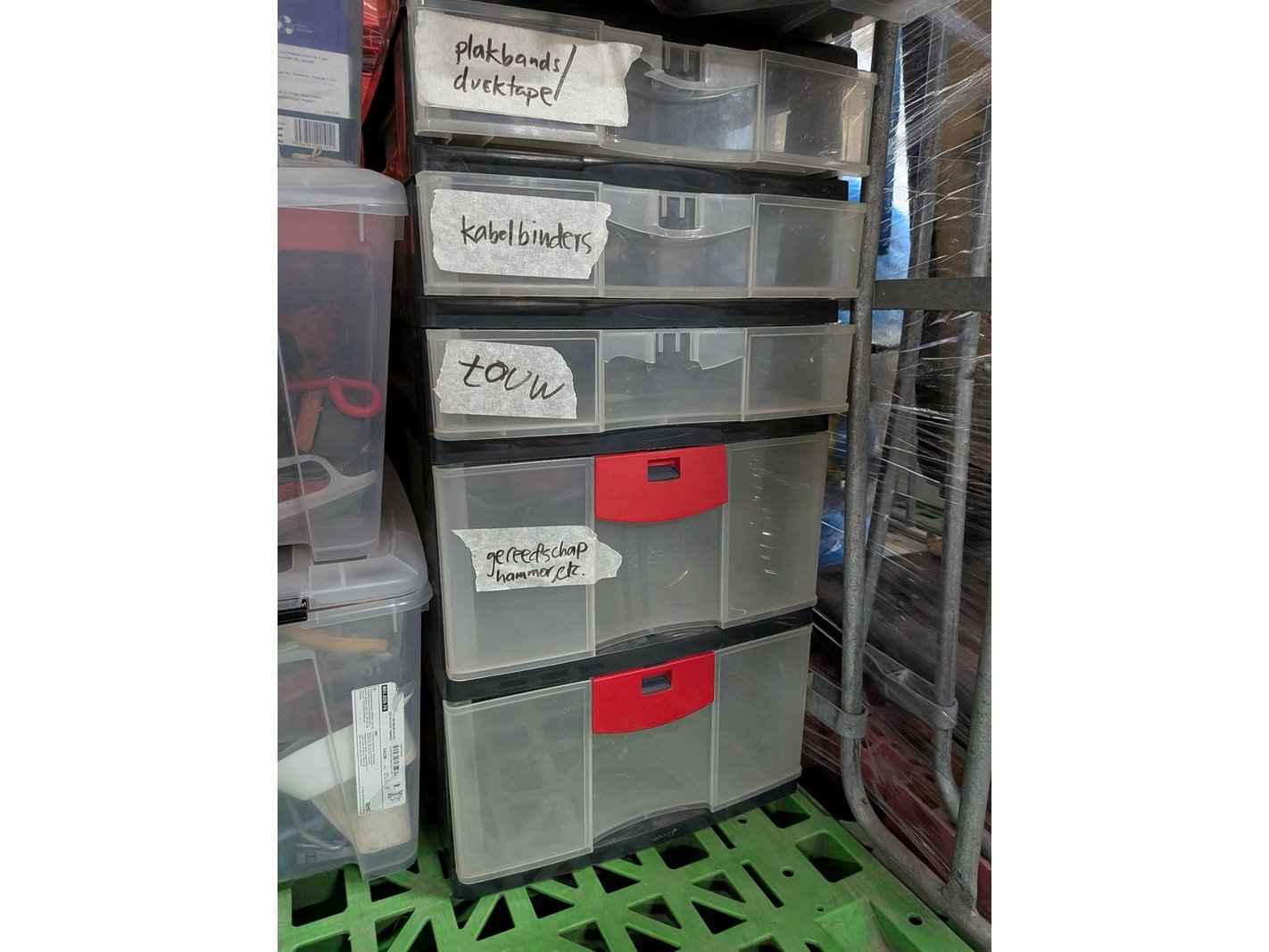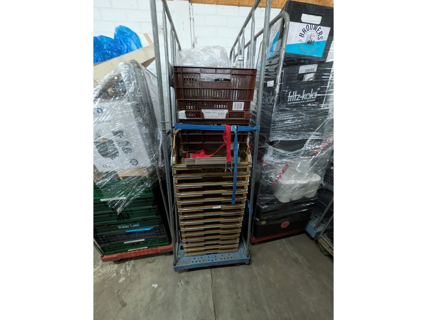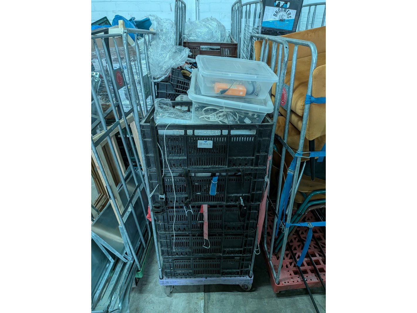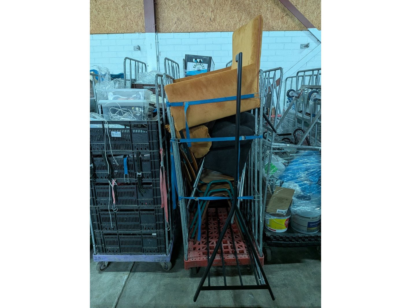 Product: Rolcontainer gevuld met diverse kantoor en magazijn goederen Conditie: gebruikt Specificaties: Bestaande uit o.a.: houten schragen, hotpot, diverse bekabeling, wielen, kratten, meubels, vloeistoffen, trap, reclameborden, veiligeheidsbril, kantoorkast, koffiemachine, 16x rolcontainer, etc.