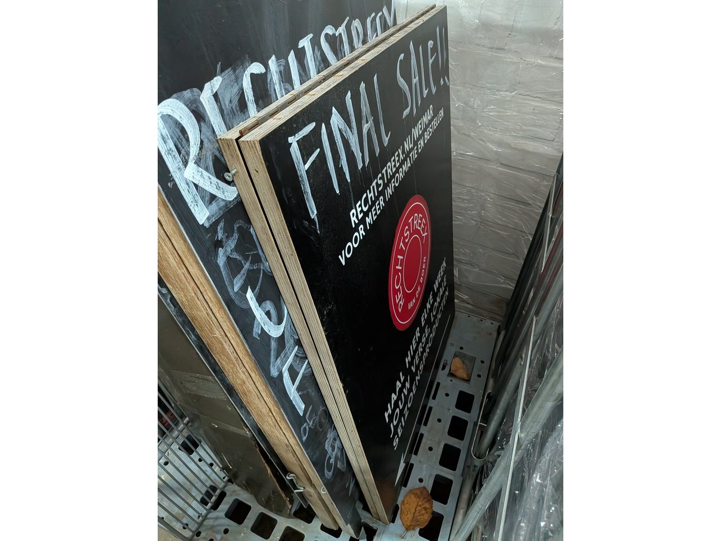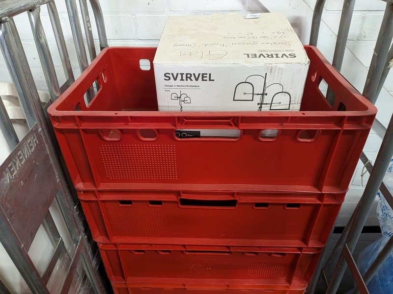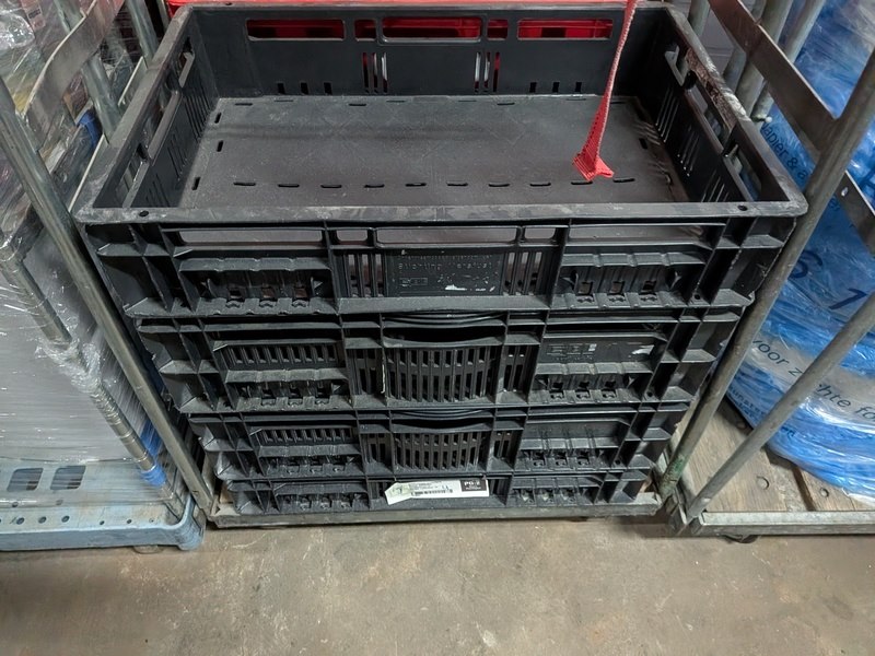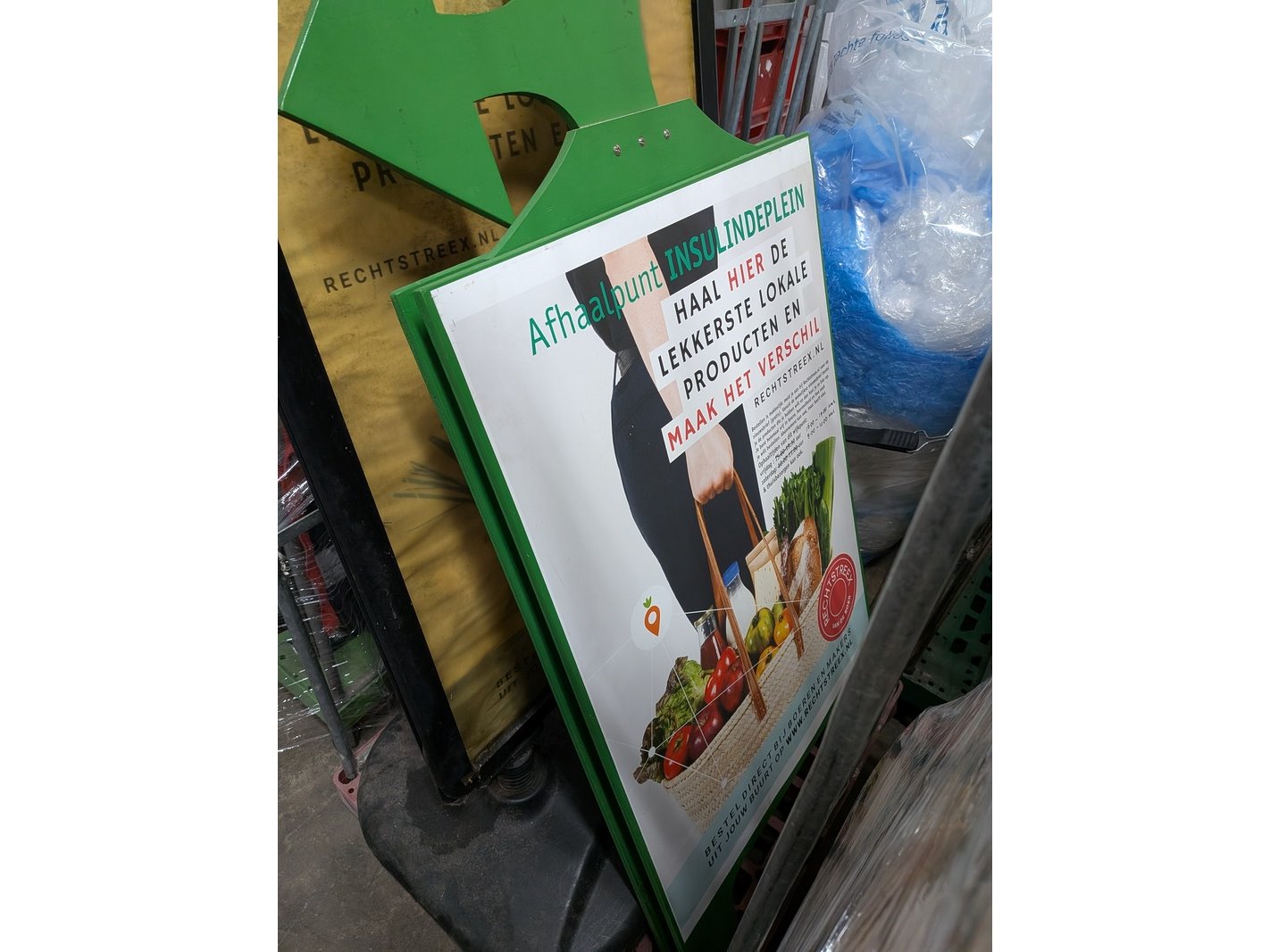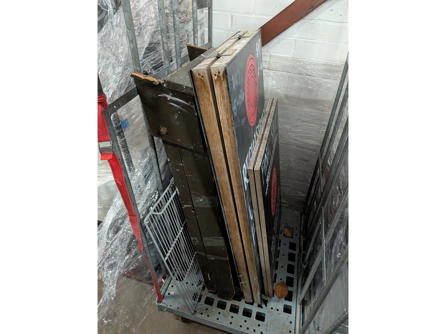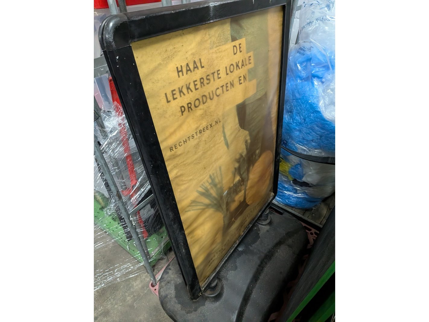 Product: Rolcontainer gevuld met diverse kantoor en magazijn goederen Conditie: gebruikt Specificaties: Bestaande uit o.a.: houten schragen, hotpot, diverse bekabeling, wielen, kratten, meubels, vloeistoffen, trap, reclameborden, veiligeheidsbril, kantoorkast, koffiemachine, 16x rolcontainer, etc.