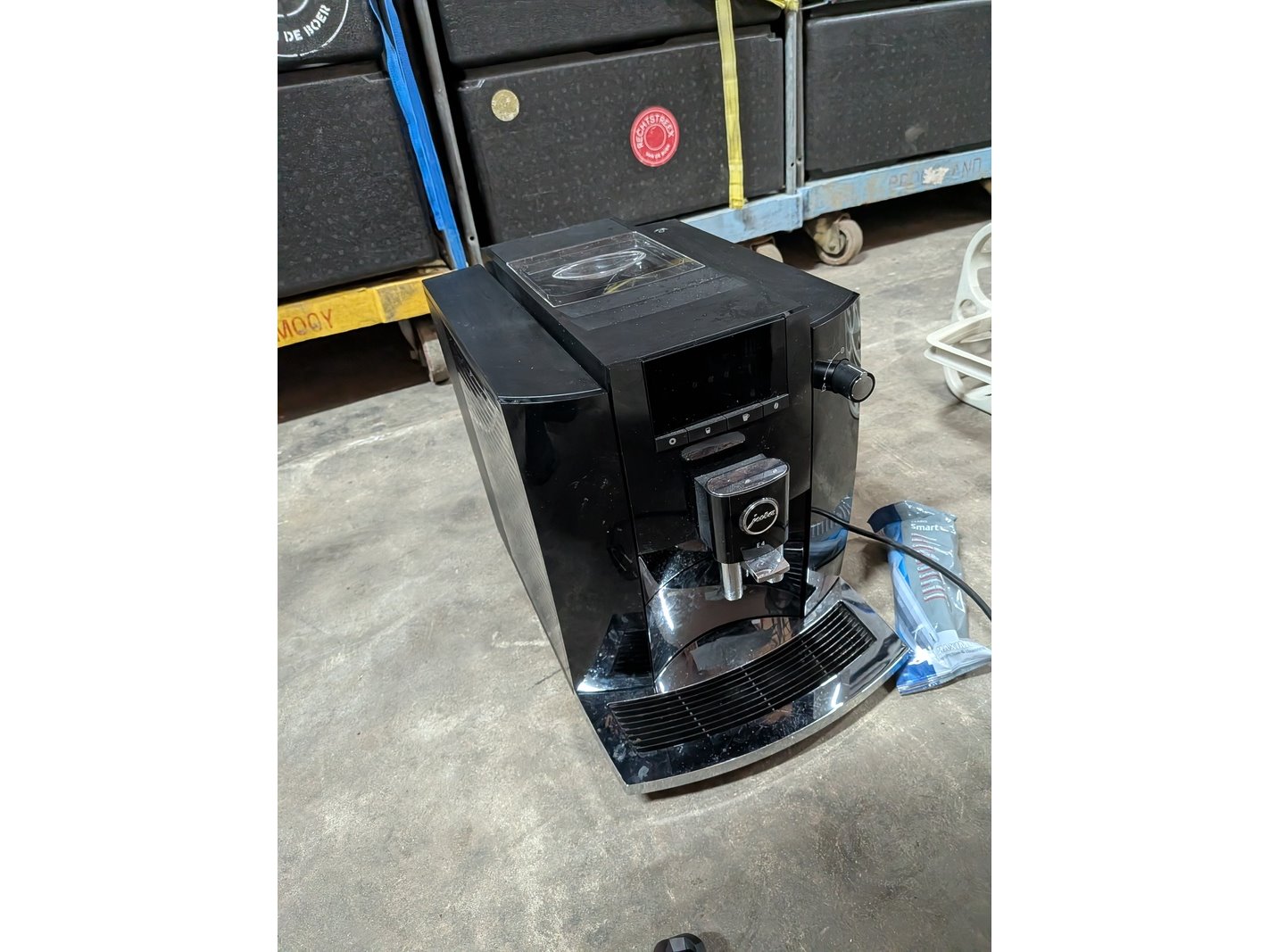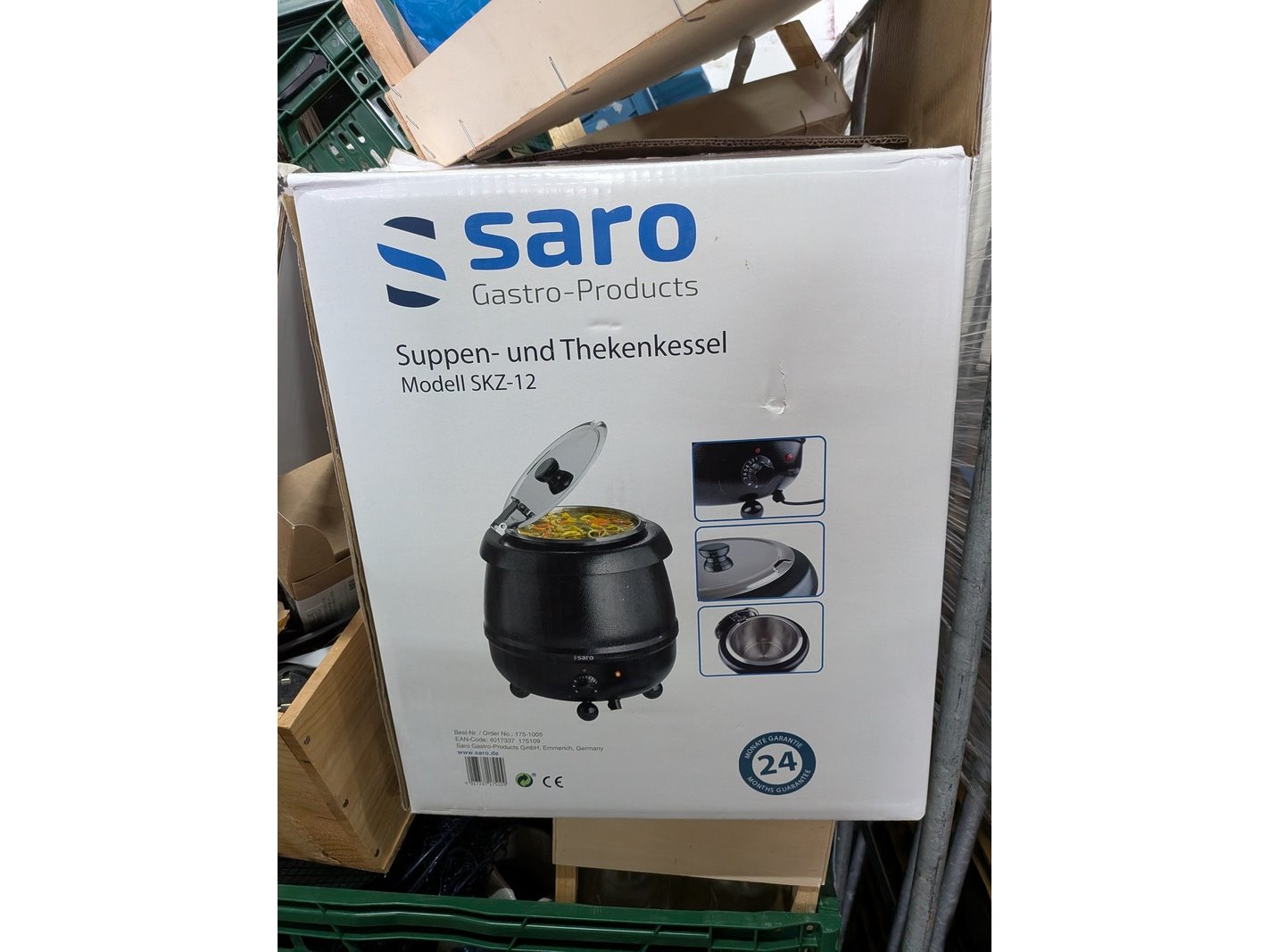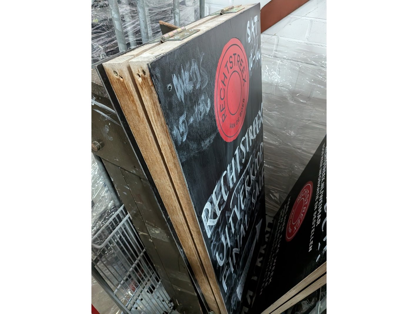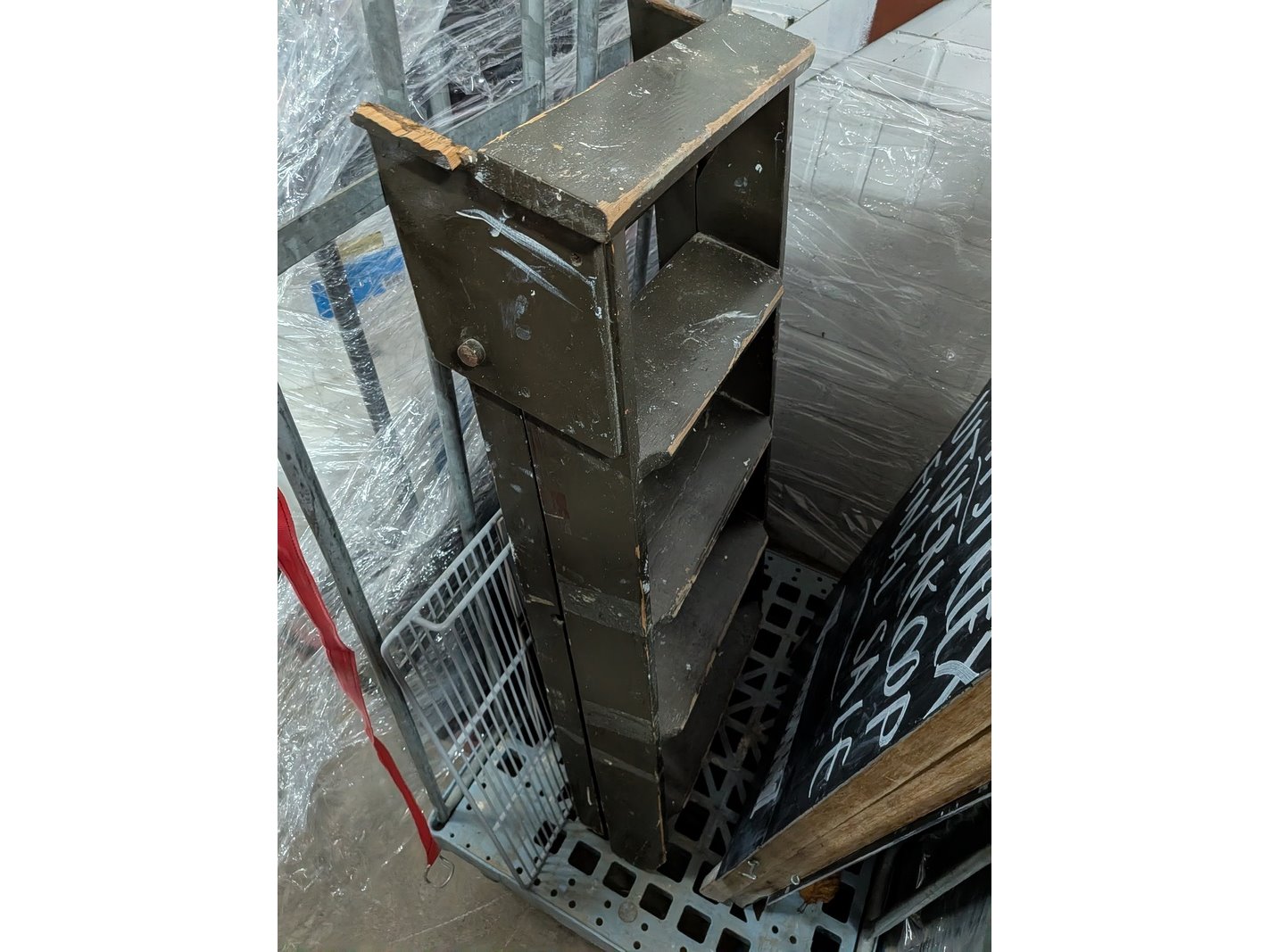 Product: Rolcontainer gevuld met diverse kantoor en magazijn goederen Conditie: gebruikt Specificaties: Bestaande uit o.a.: houten schragen, hotpot, diverse bekabeling, wielen, kratten, meubels, vloeistoffen, trap, reclameborden, veiligeheidsbril, kantoorkast, koffiemachine, 16x rolcontainer, etc.