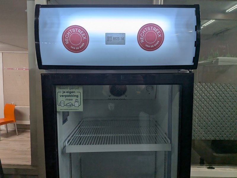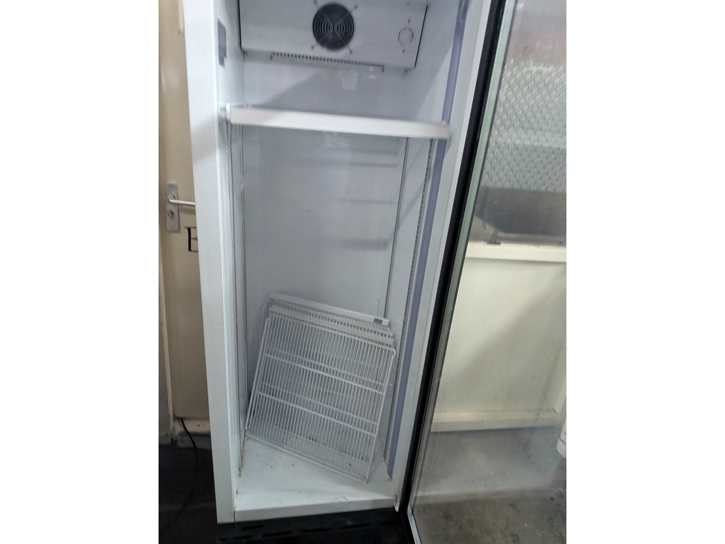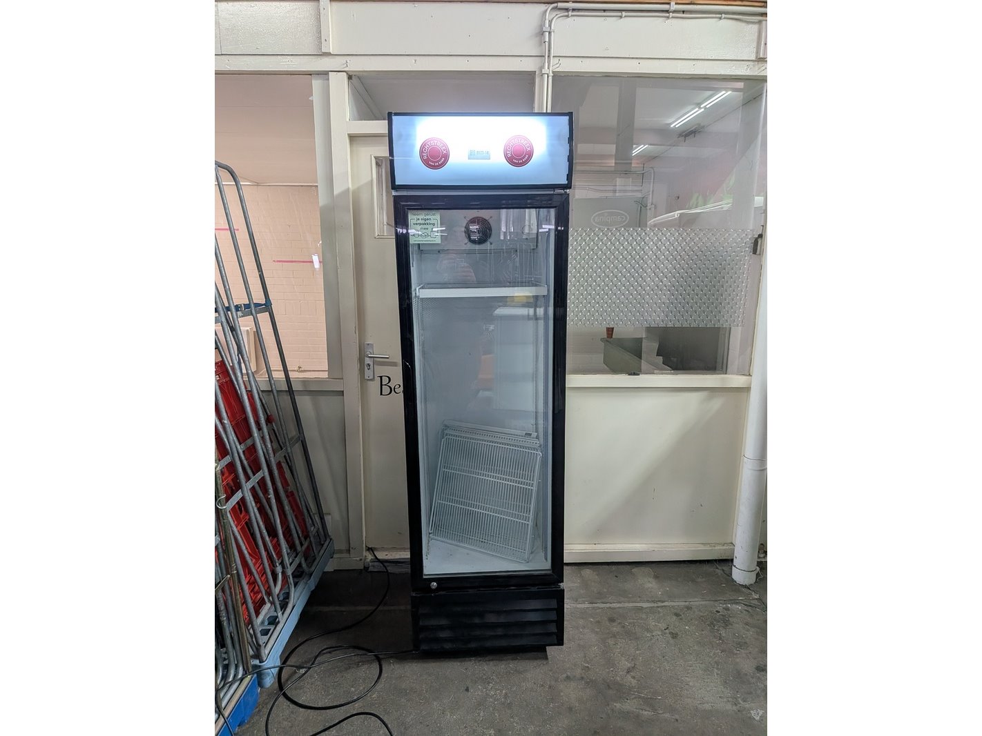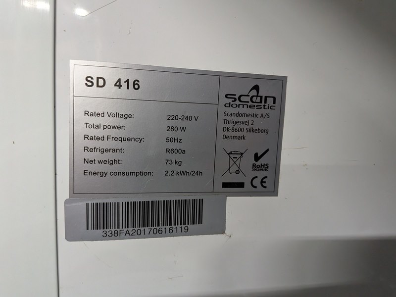 Merk: Scandomestic Product: Vitrinekoelkast Afmeting: hoogte ca. 197 cm Conditie: gebruikt Specificaties: Nominale spanning: 220-240 V Totaal vermogen: 280 W Nominale frequentie: 50 Hz Koelmiddel: R600a Netto gewicht: 73 kg Energieverbruik: 2,2 kWh/24h Fabrikant: Scandomestic A/S, Thrigesvej 2, DK-8600 Silkeborg, Denemarken Serienummer: 338FA20170616119