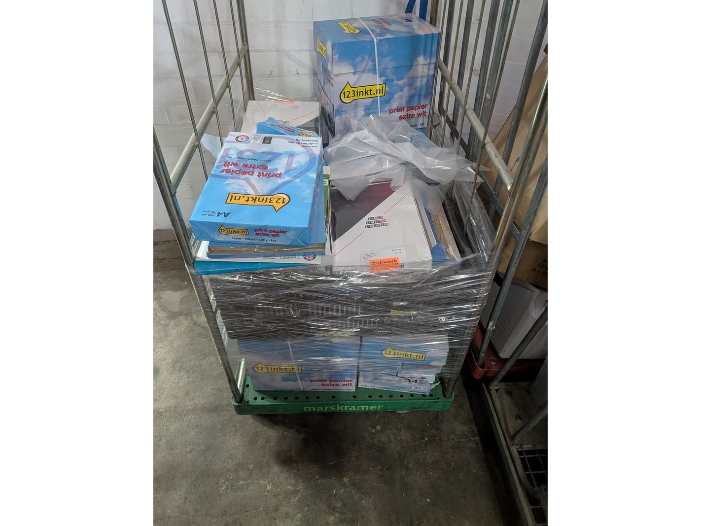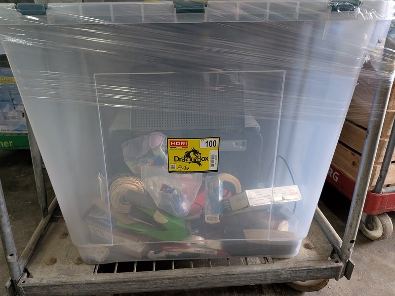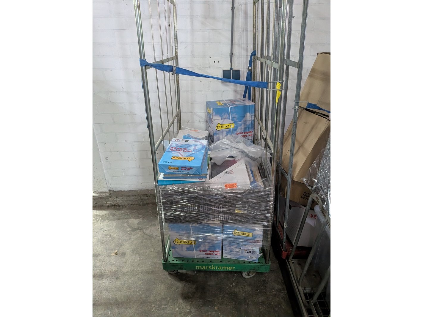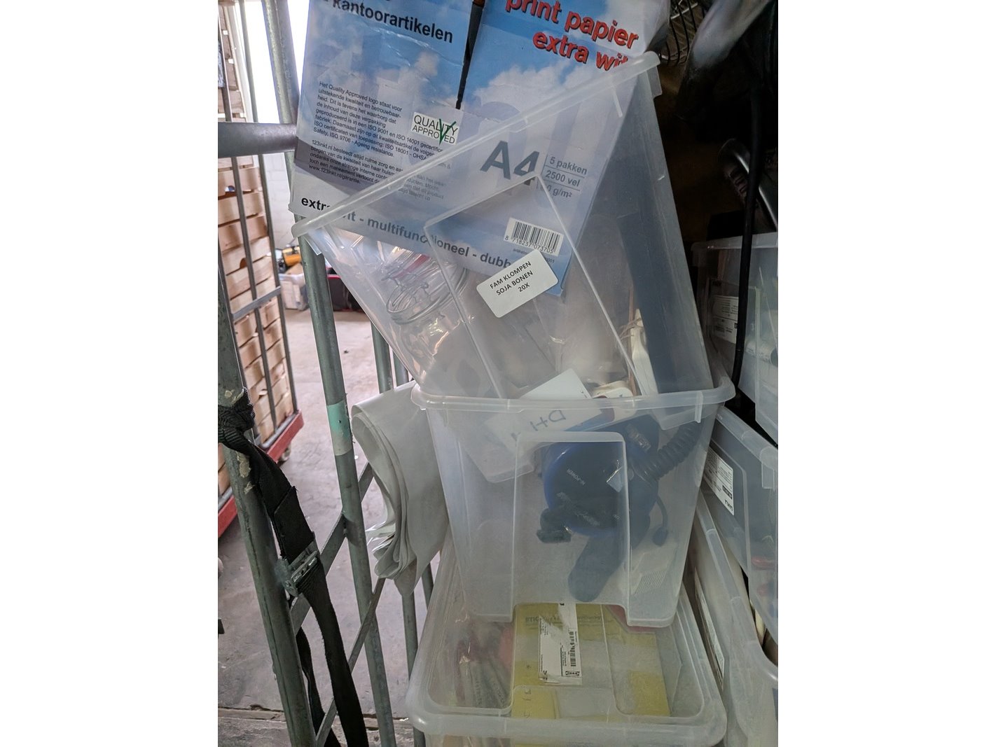 Product: Assortiment kantoorartikelen in 4x rolcontainer Conditie: gebruikt Specificaties: Bestaande uit o.a.: A4 printer papier, ventilator, meubelhondjes, plasticzakken, megafoons, koelbox, etc.