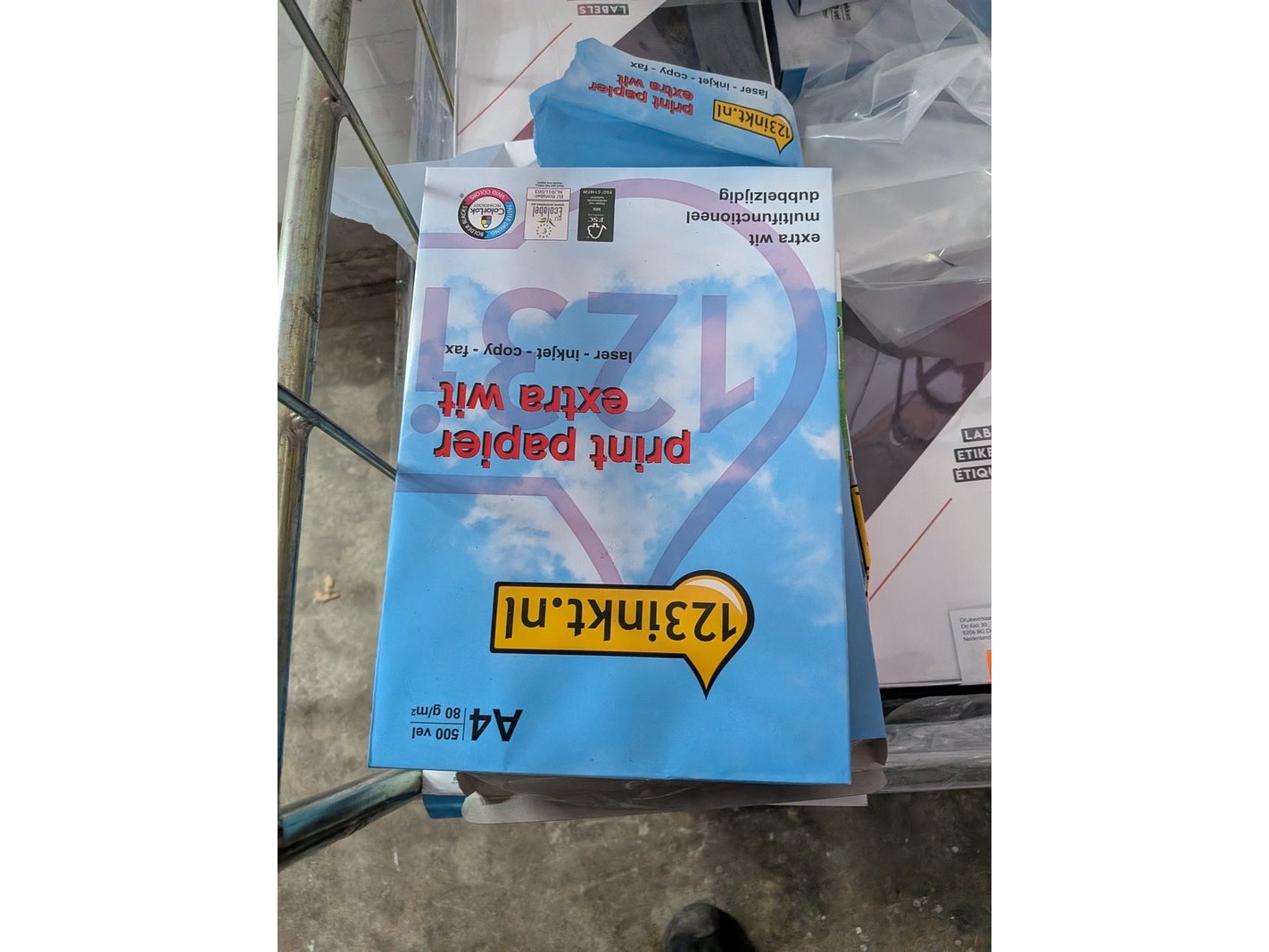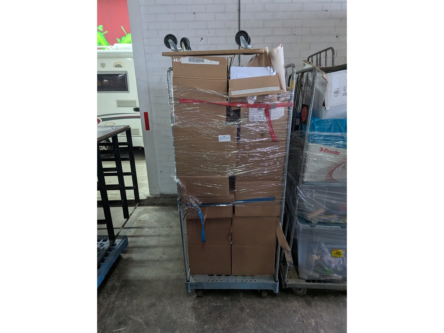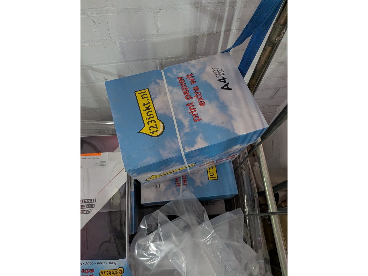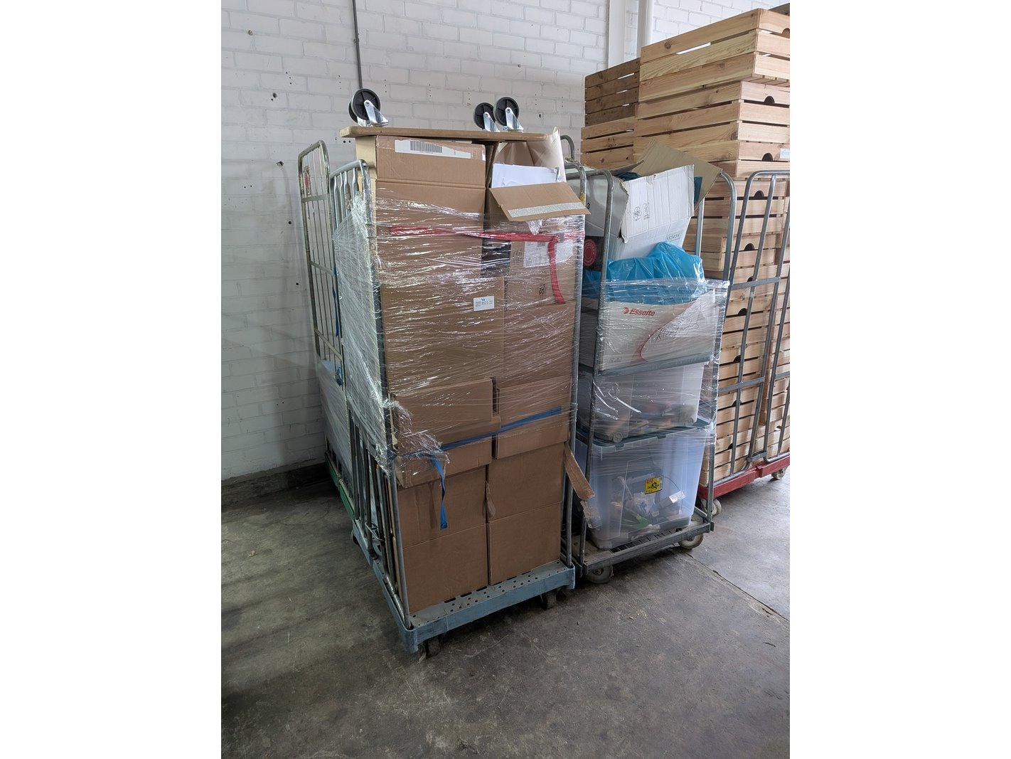 Product: Assortiment kantoorartikelen in 4x rolcontainer Conditie: gebruikt Specificaties: Bestaande uit o.a.: A4 printer papier, ventilator, meubelhondjes, plasticzakken, megafoons, koelbox, etc.