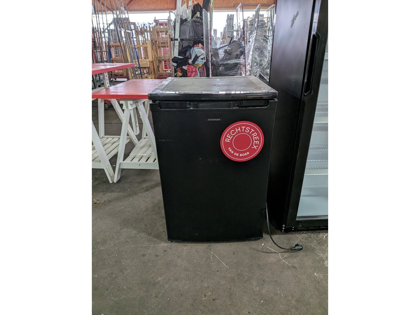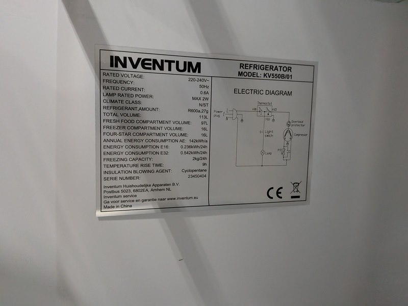 Merk: Inventum Product: Koelkast Afmeting: 113L, hoogte ca. 85 cm Conditie: gebruikt Specificaties: Model: KV550B/01 Nominale spanning: 220-240V~ Frequentie: 50Hz Nominale stroom: 0,6A Vermogen lamp: Max 2W Klimaatklasse: N/ST Koelmiddel, hoeveelheid: R600a, 27g Totaal volume: 113L Volume koelcompartiment: 97L Volume vriescompartiment: 16L Volume 4-sterren compartiment: 16L Jaarlijks energieverbruik: 142 kWh/jaar Energieverbruik E16: 0,236 kWh/24h Energieverbruik E32: 0,542 kWh/24h Vriescapaciteit: 2 kg/24h Temperatuurstijgtijd: 9h Isolatieblaasmiddel: Cyclopentaan Serienummer: 23450404
