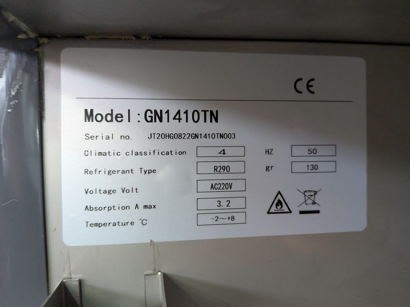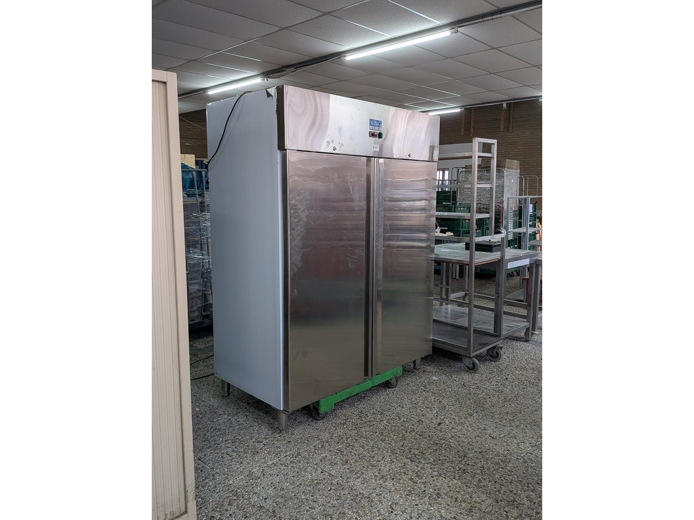 Merk: King Cold Product: Horeca koeler Afmeting: (hxbxd) ca. 200 x 150 x 83 cm, inhoud ca. 1400 L Conditie: gebruikt Specificaties: Model: GN1410TN Serienummer: JT20HGO822GN1410TN003 Klimaatklassificatie: 4 Frequentie (Hz): 50 Koelmiddel Type: R290 Gewicht (gram): 130 Spanning (Volt): AC220V Maximale stroomopname (A): 3,2 Temperatuur (°C): -2 tot +8