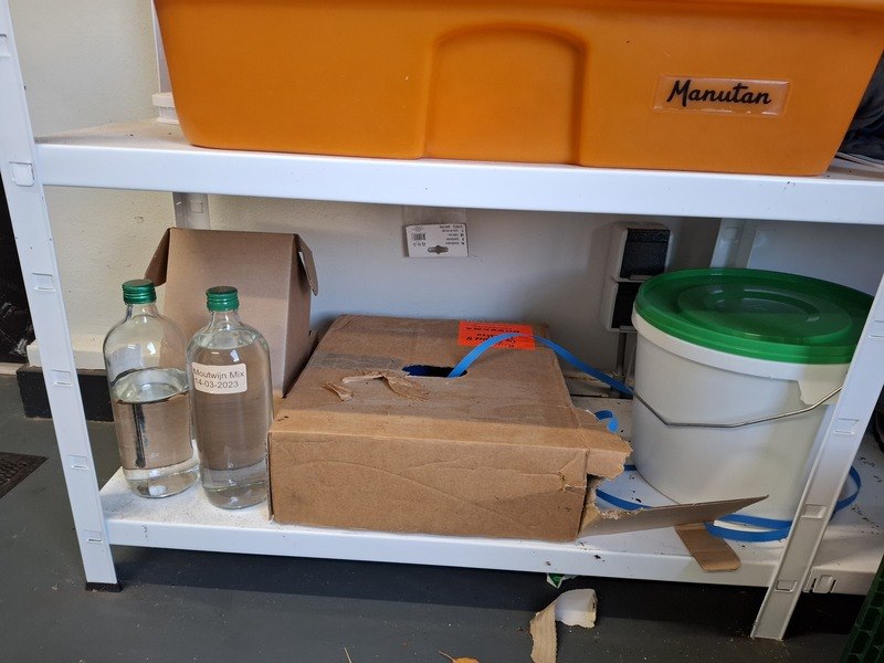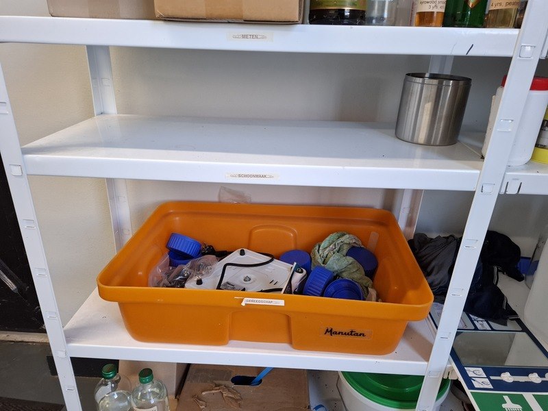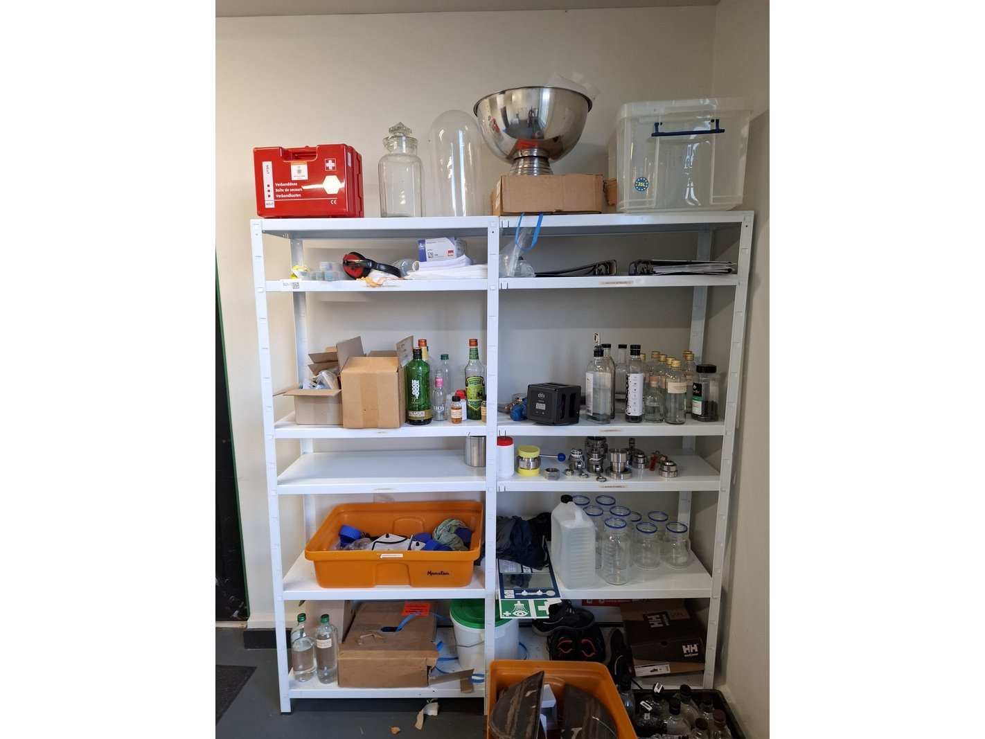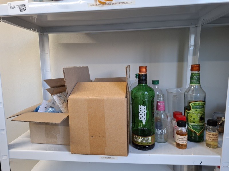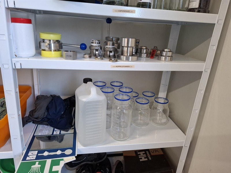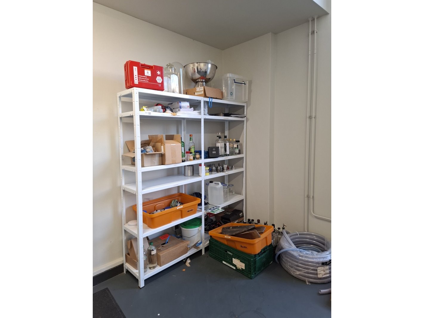 Product: Inhoud opslagruimte Conditie: gebruikt Specificaties: bestaande uit o.a. afvalbak, garderobe rek verrijdbaar, spiegel, stelling met inhoud, industriële slang, lekbak, brouwbenodigdheden koppelingen, etc.