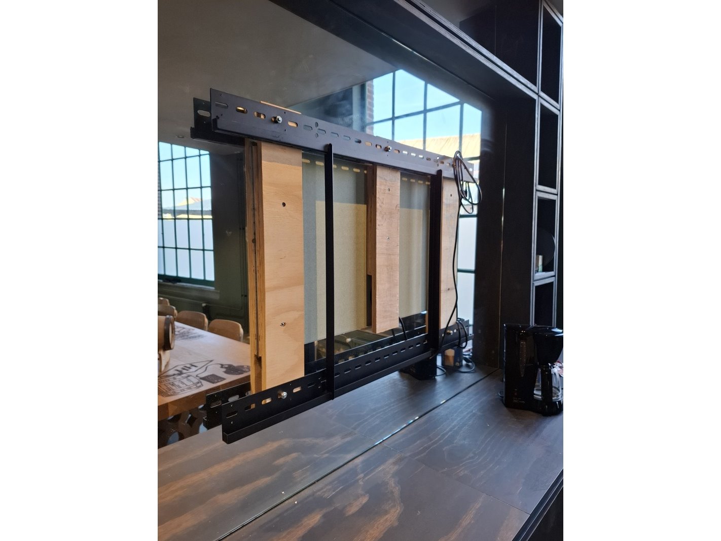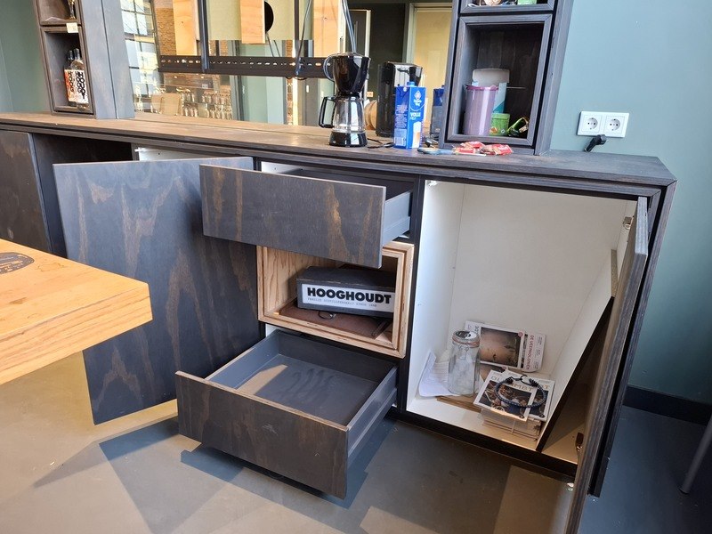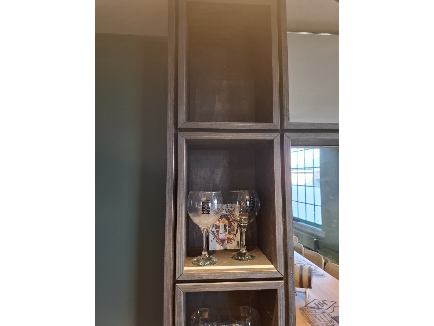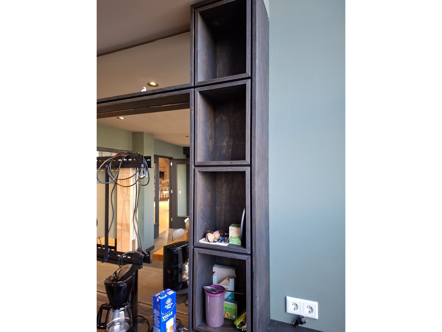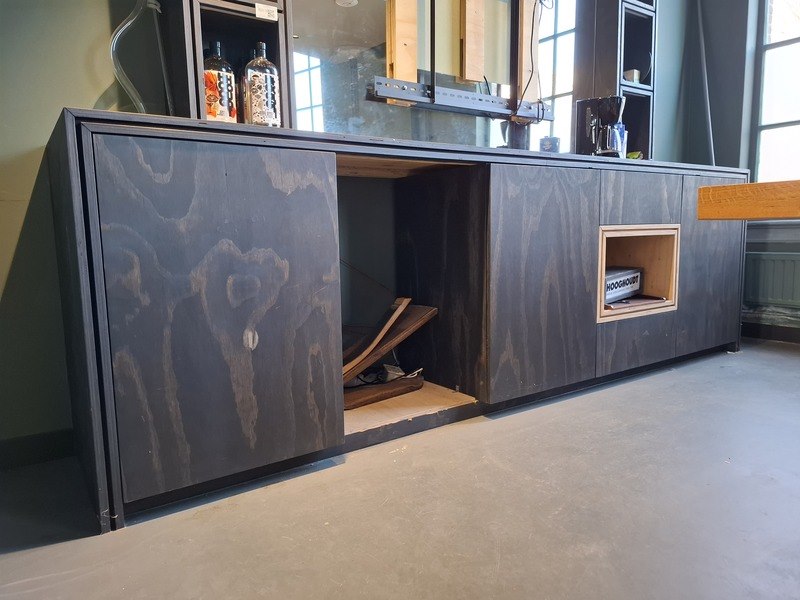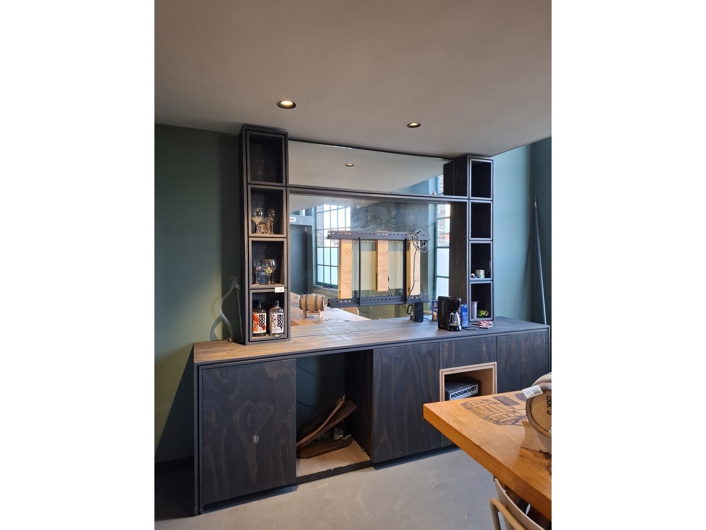 Product: Wandmeubel met spiegel Materiaal: hout Afmeting: H262cm x B 310cm x D60 Conditie: gebruikt Specificaties: inclusief inhoud met glaswerk e.d., spiegel, TV drager