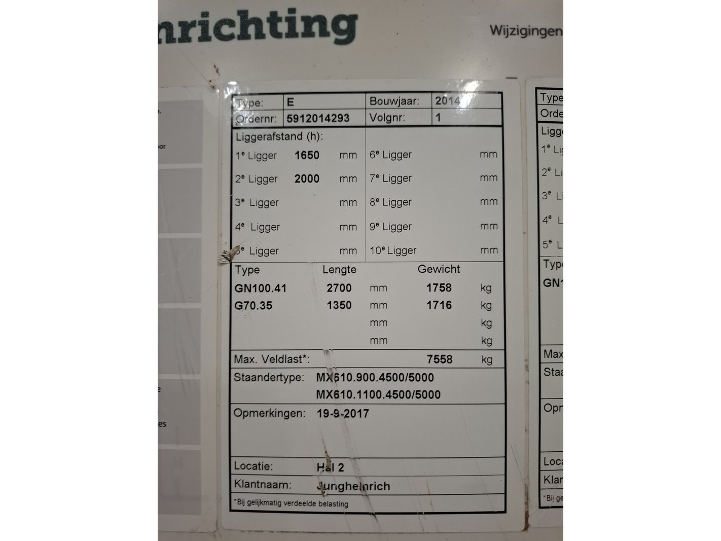 Merk: Jungheinrich Product: Palletstelling BouwJaar: 2014 Specificaties: bestaande uit: 6x juk , hxb ca 450x110cm, 4x juk 450x90cm en 36x ligger, lengte ca 277cm; 5x juk, hxb ca 500x90cm en 12x ligger, lengte ca 277cm, 4x ligger 142cm; 12x juk, hxb ca 450x110cm en 40x ligger, lengte ca 277cm; 4x juk, hxb ca 500x90cm en 12x ligger, lengte ca 277cm; 10x juk, hxb ca 450x110cm en 36x ligger, lengte ca 277cm, incl. aanrijbeveiliging en gaaswand