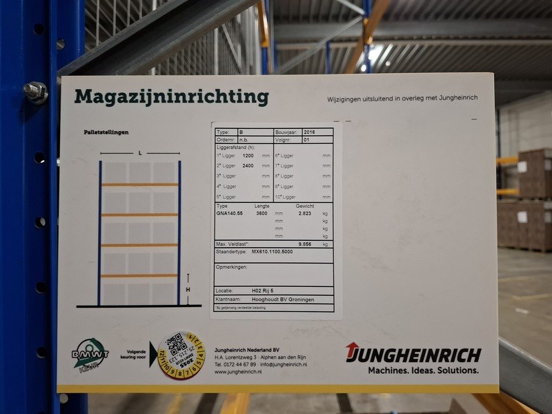 Merk: Jungheinrich Product: Palletstelling BouwJaar: 2016 en 2021 Specificaties: bestaande uit: 12x juk, hxb ca 500x110cm en 44x ligger, lengte ca 367cm; 7x juk, hxb ca 600x110cm en 28x ligger, lengte ca 367cm
