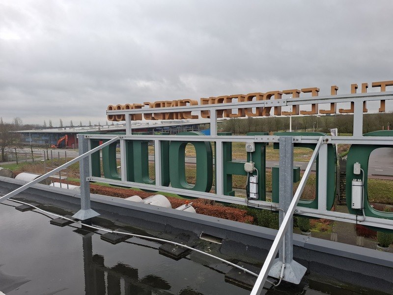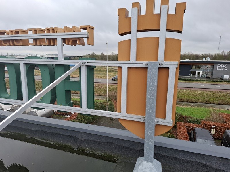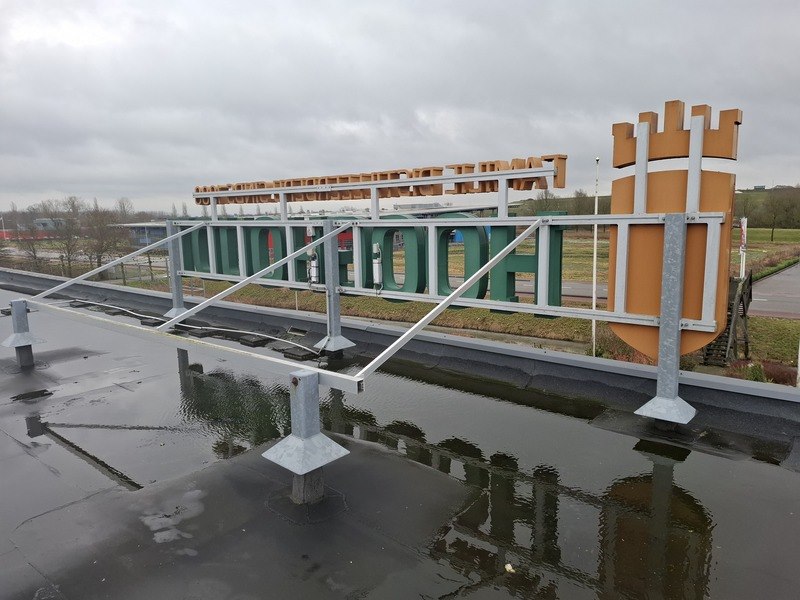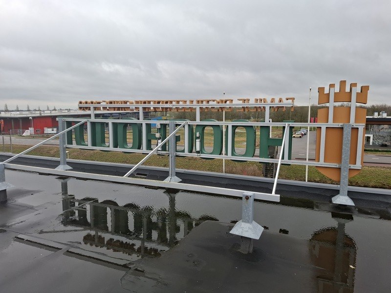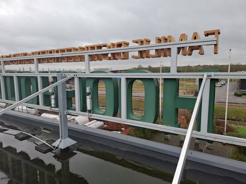 Product: Lichtreclame 'Hooghoudt' Afmeting: hxbxd ca 190x650x235cm Specificaties: bestaat uit letters met verlichting op metalen framewerk