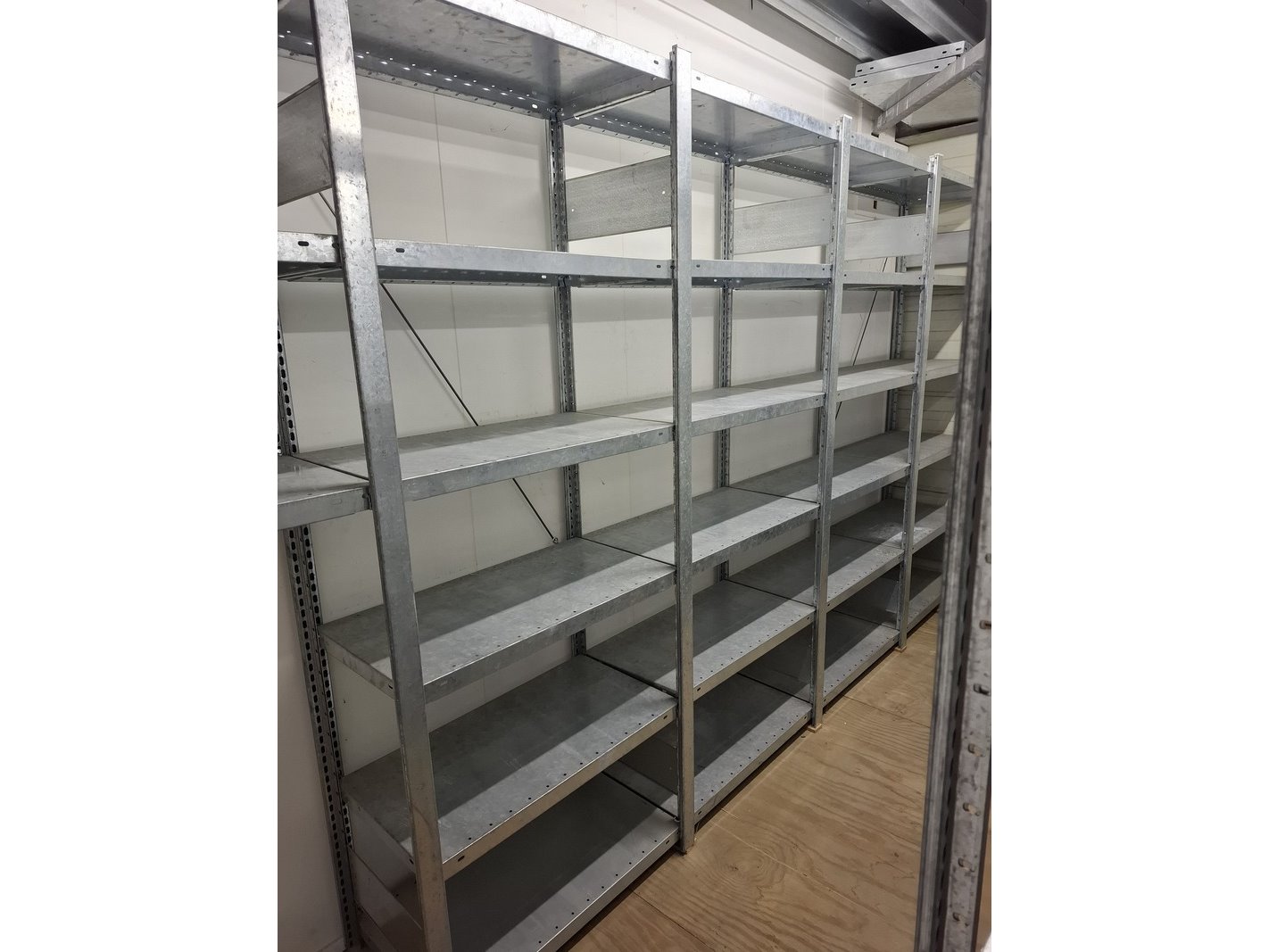Product: Ca 18,75mtr metalen stelling Specificaties: bestaande uit: 16x0,75mtr hxb ca 200x30cm; 9x0,75mtr hxb ca 200x43cm