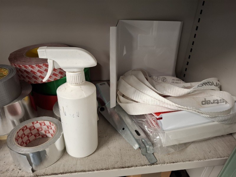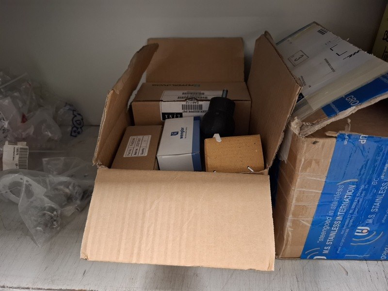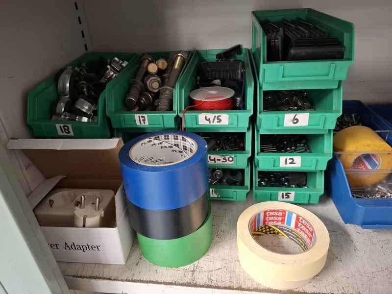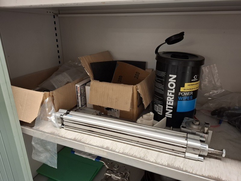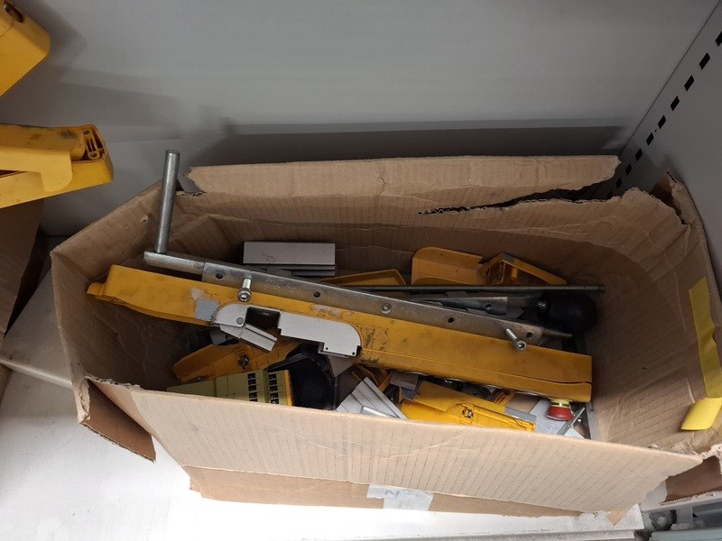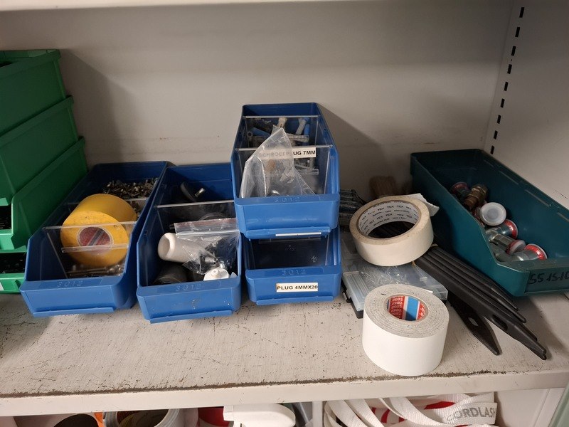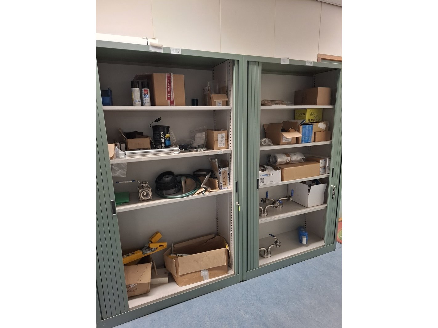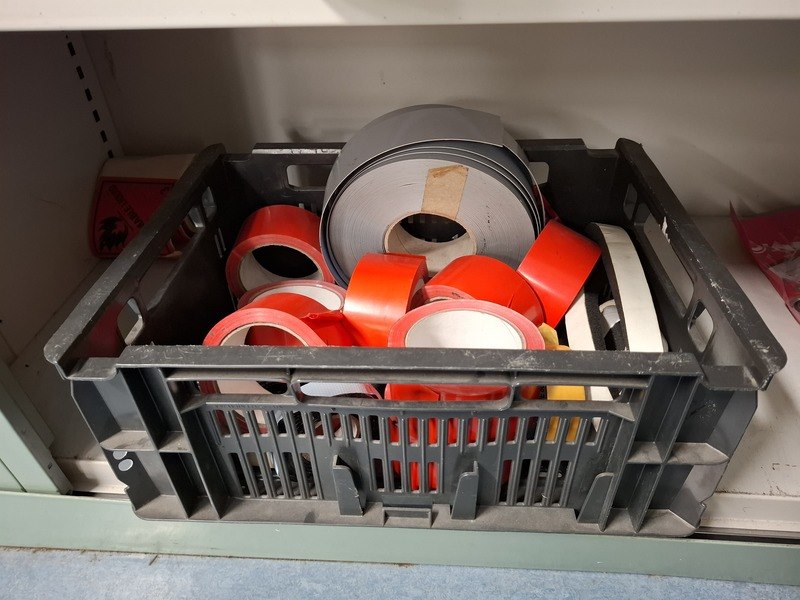 Product: Inhoud 3x kantoorkast Specificaties: o.a. tape, ijzerwaren, afsluiters, kogelkraan, etc.