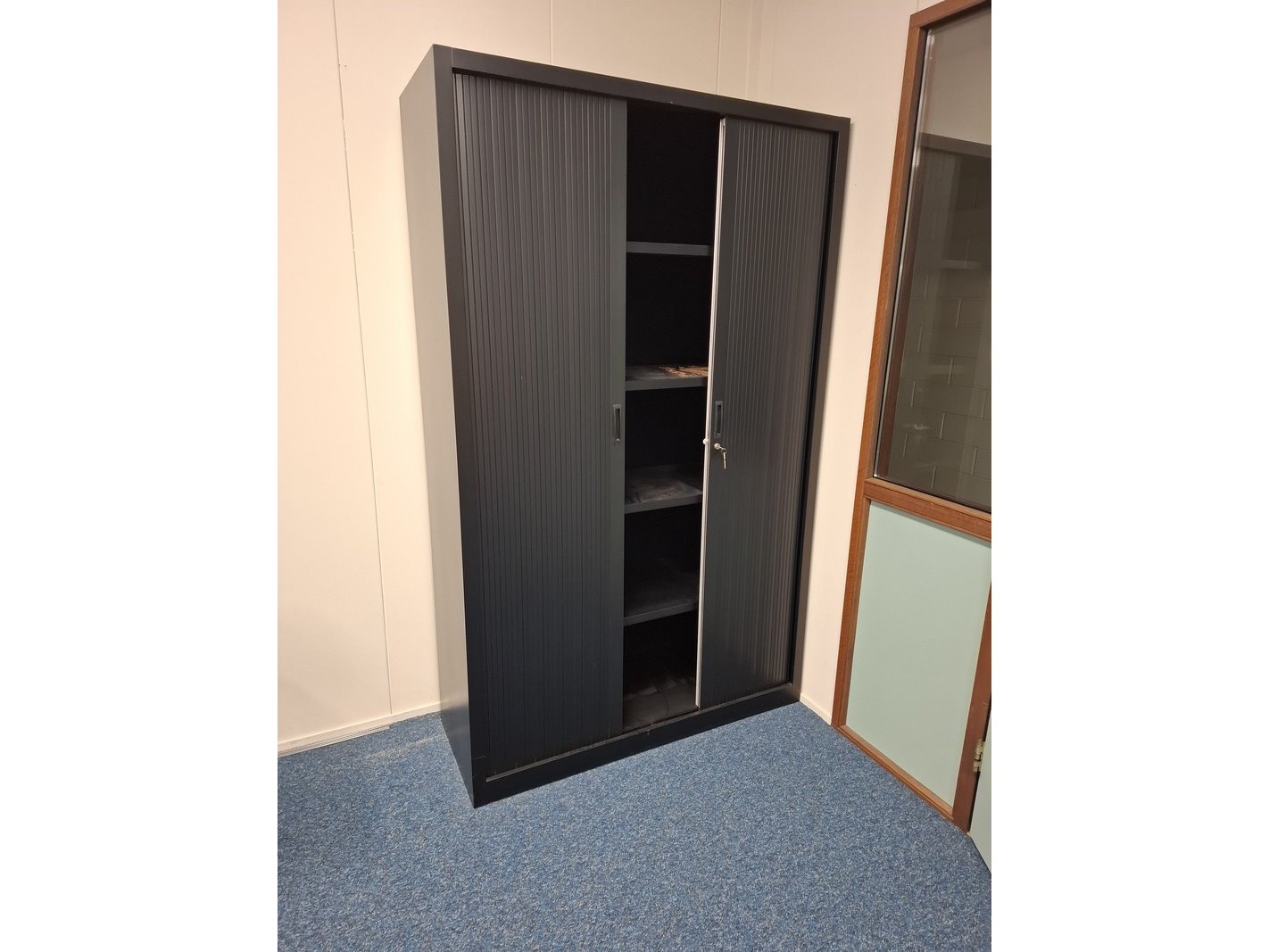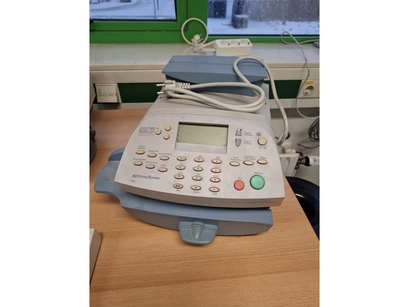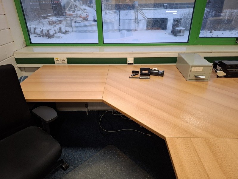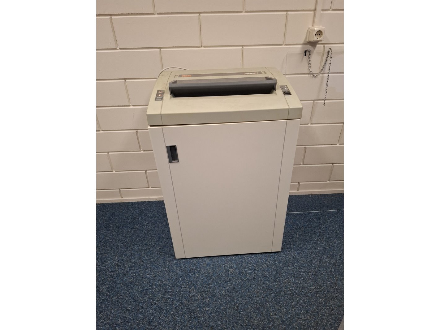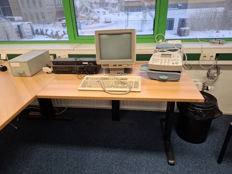 Product: Inhoud kantoor Specificaties: o.a. bureauopstelling afm. ca 320/240x80x75cm; 2x bureaustoel; lameldeurkast afm. ca 195x120x45cm; divers kantoorgerei; papiervernietiger HSM 390.1; papiervernietiger Dahle 20822; nostalgische computer IBM; frankeermachine Bowes; etc.