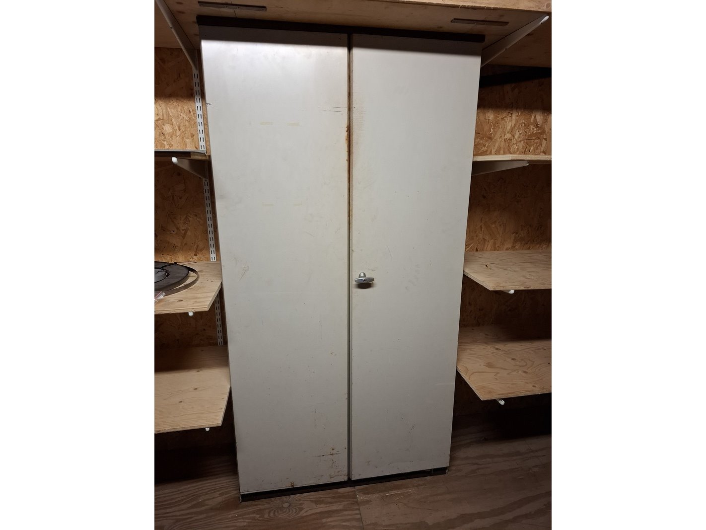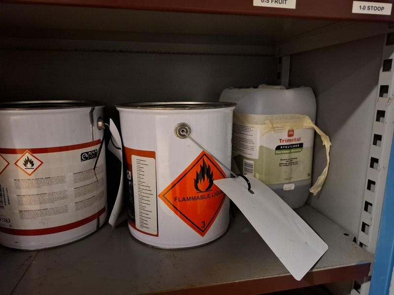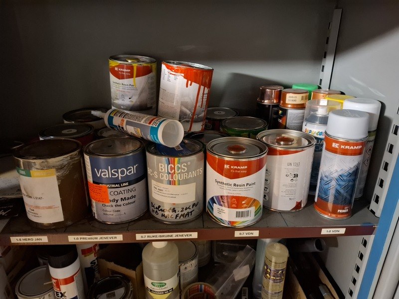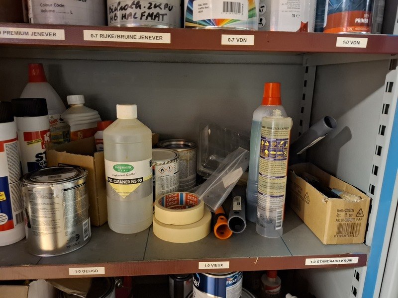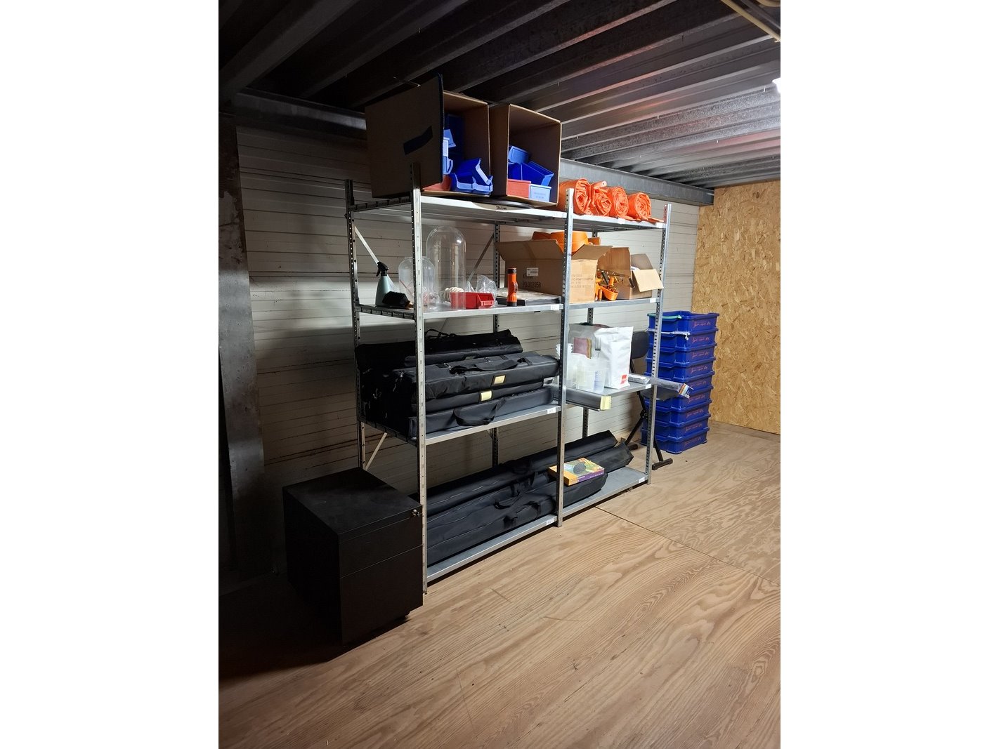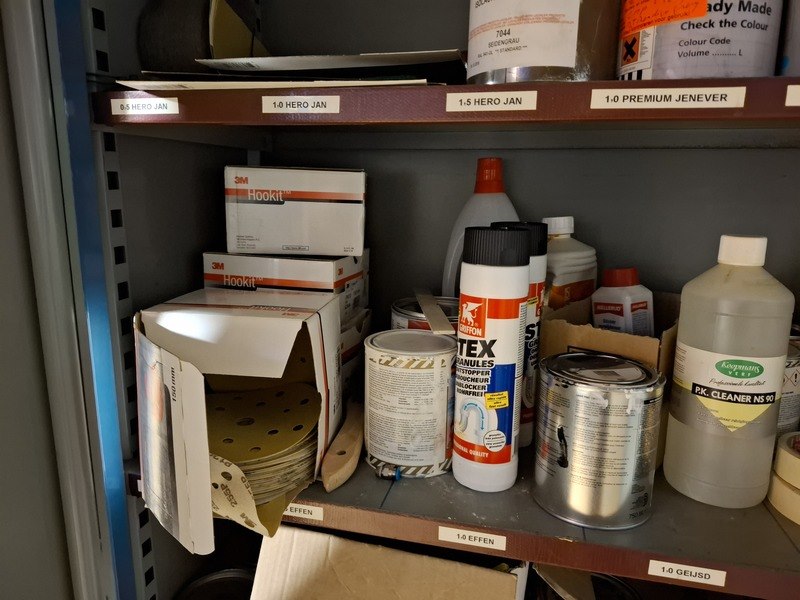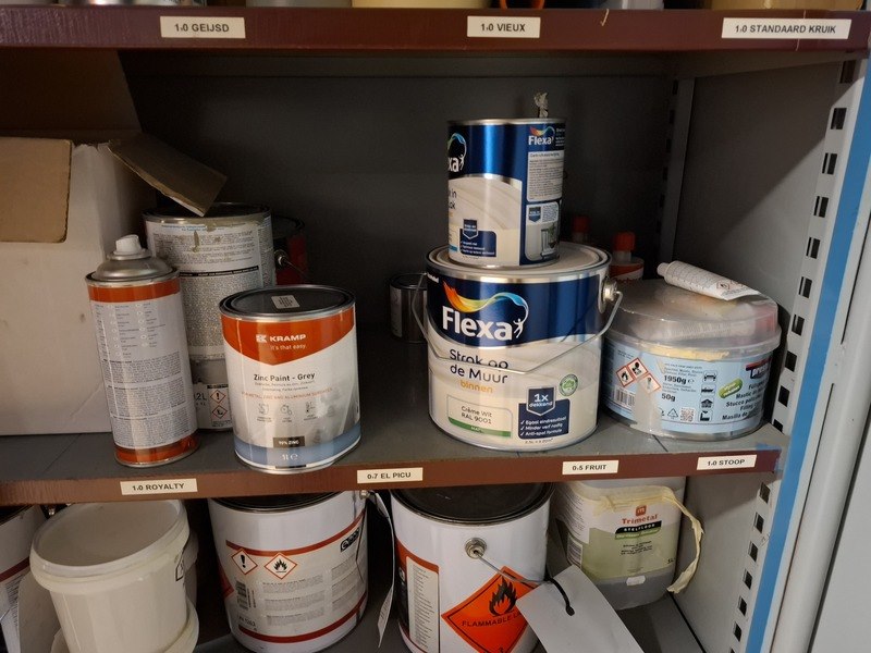Product: Inhoud magazijn Specificaties: o.a. ca 8mtr stelling, hxd ca 200x60cm; 3x lameldeurkast, afm. ca 195x120x47cm; 4x 2-deurskast, afm. ca 195x100x40cm; isolatiemateriaal, promotiemateriaal; etc. (2 kasten gevuld met vloeistoffen, kitten, verf, schuurpads, diverse pvc, etc.) Opmerking: reclame banners staan door het hele pand tijdens de kijkdagen