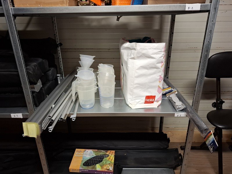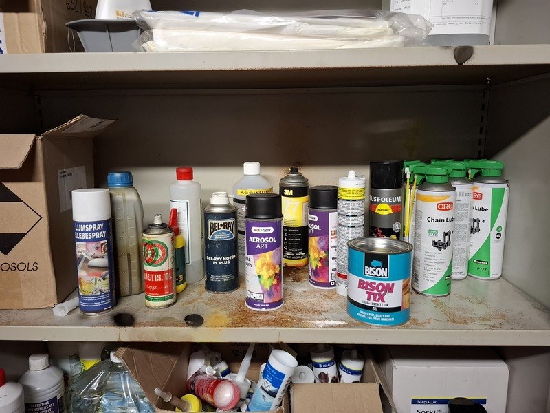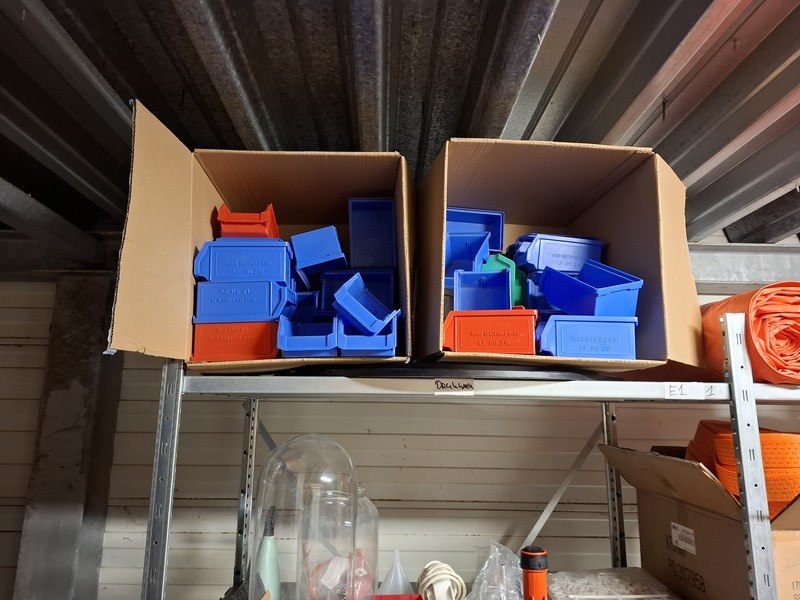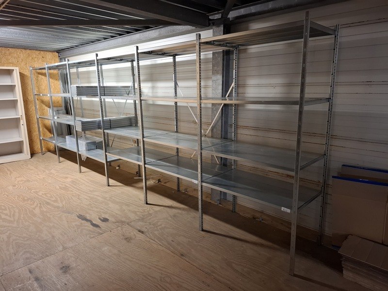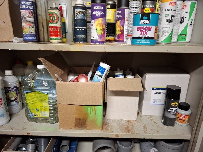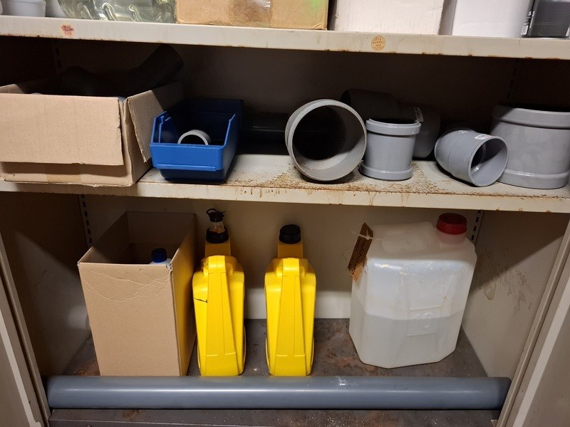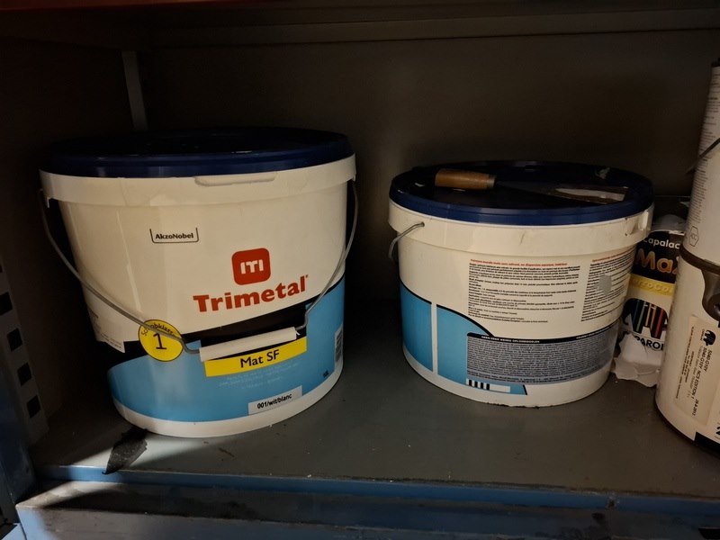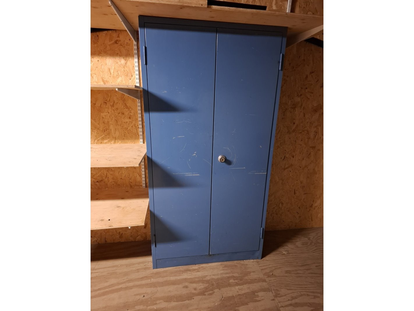Product: Inhoud magazijn Specificaties: o.a. ca 8mtr stelling, hxd ca 200x60cm; 3x lameldeurkast, afm. ca 195x120x47cm; 4x 2-deurskast, afm. ca 195x100x40cm; isolatiemateriaal, promotiemateriaal; etc. (2 kasten gevuld met vloeistoffen, kitten, verf, schuurpads, diverse pvc, etc.) Opmerking: reclame banners staan door het hele pand tijdens de kijkdagen