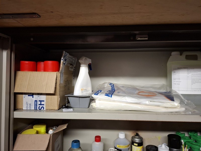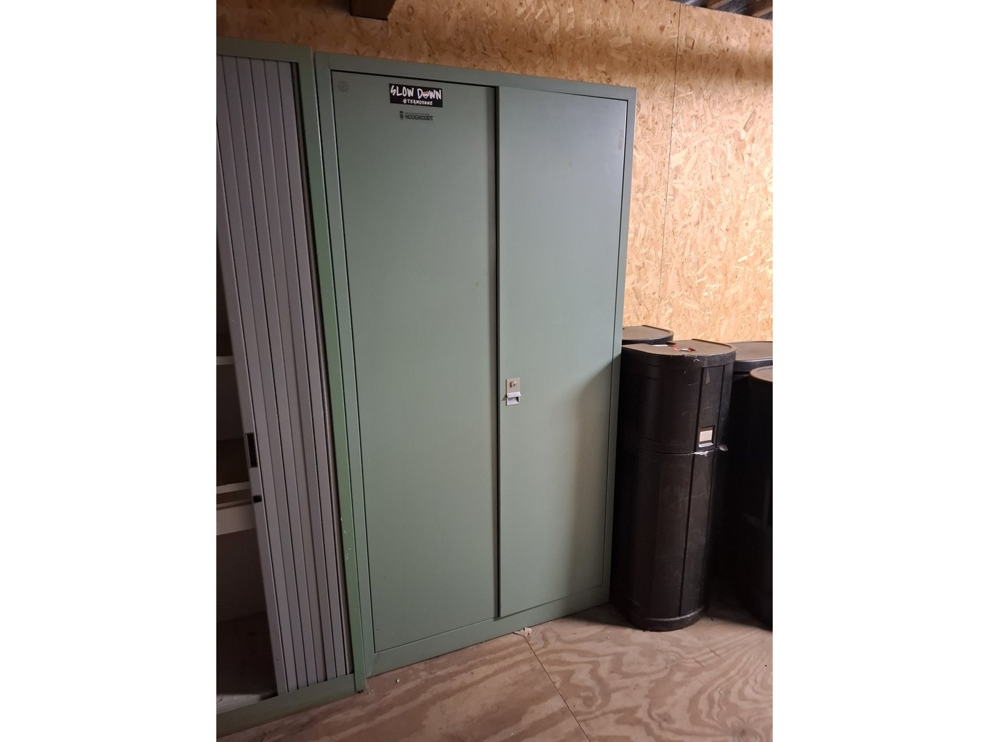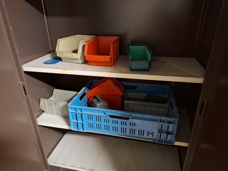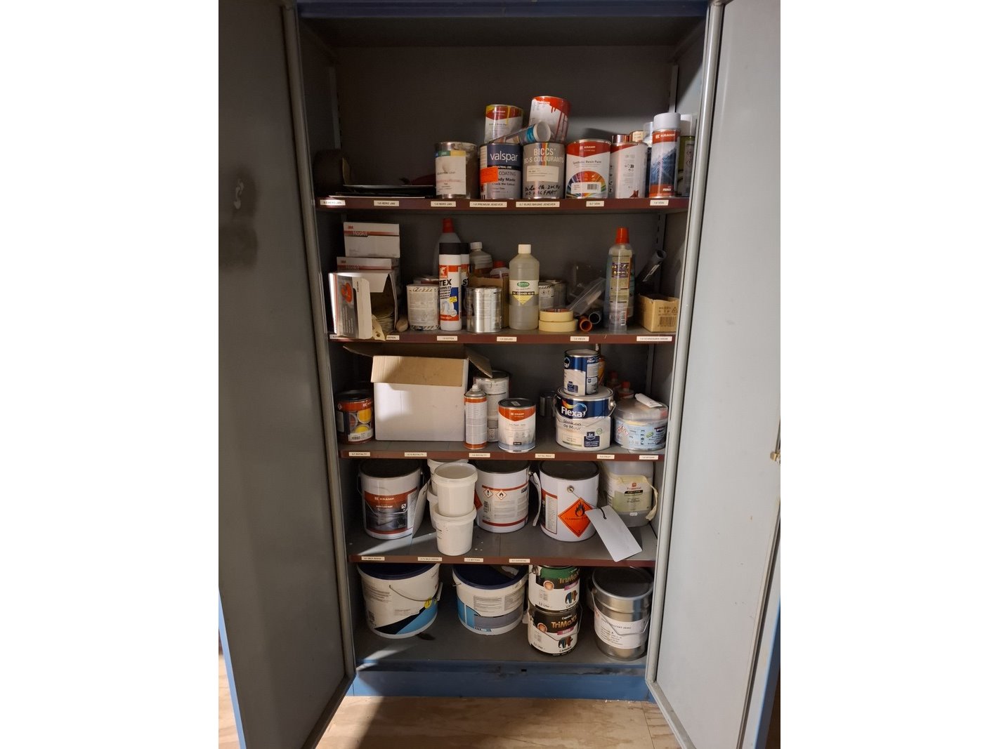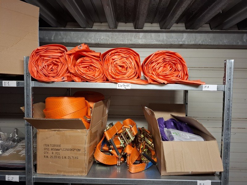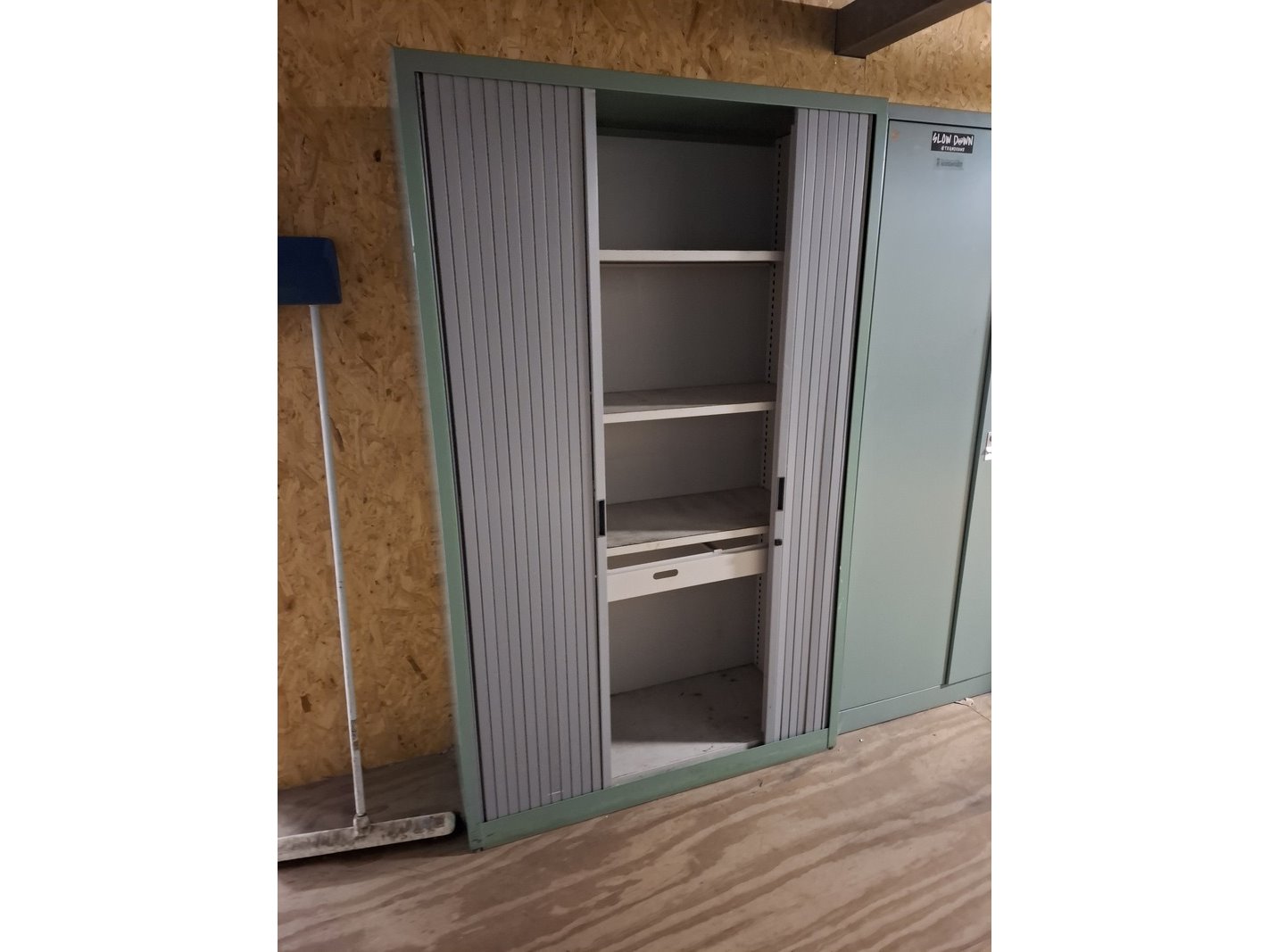 Product: Inhoud magazijn Specificaties: o.a. ca 8mtr stelling, hxd ca 200x60cm; 3x lameldeurkast, afm. ca 195x120x47cm; 4x 2-deurskast, afm. ca 195x100x40cm; isolatiemateriaal, promotiemateriaal; etc. (2 kasten gevuld met vloeistoffen, kitten, verf, schuurpads, diverse pvc, etc.) Opmerking: reclame banners staan door het hele pand tijdens de kijkdagen