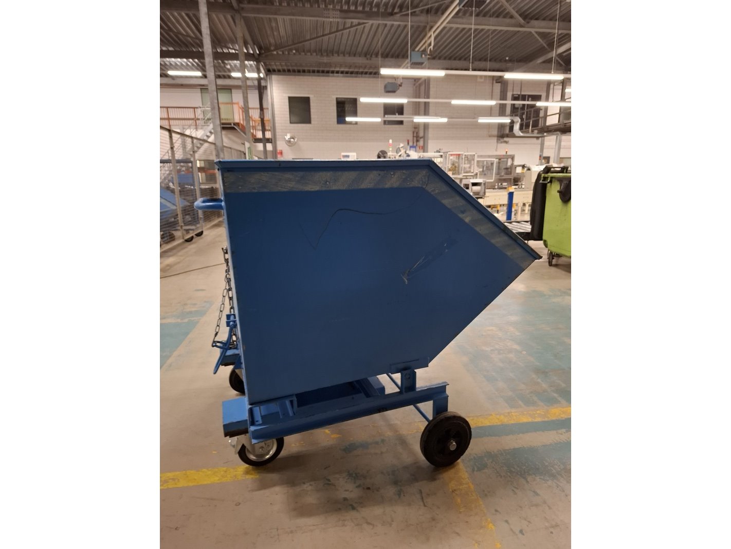 Product: Mobiele kantelbak Afmeting: afm. ca 140x105x130cm BouwJaar: 2008 Specificaties: max 1000ltr, met heftrucksledes