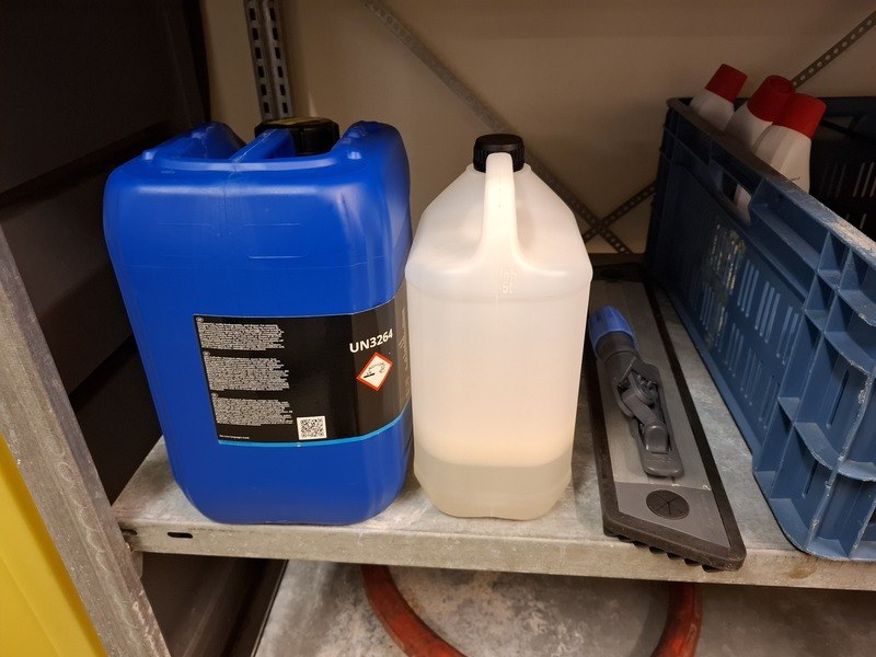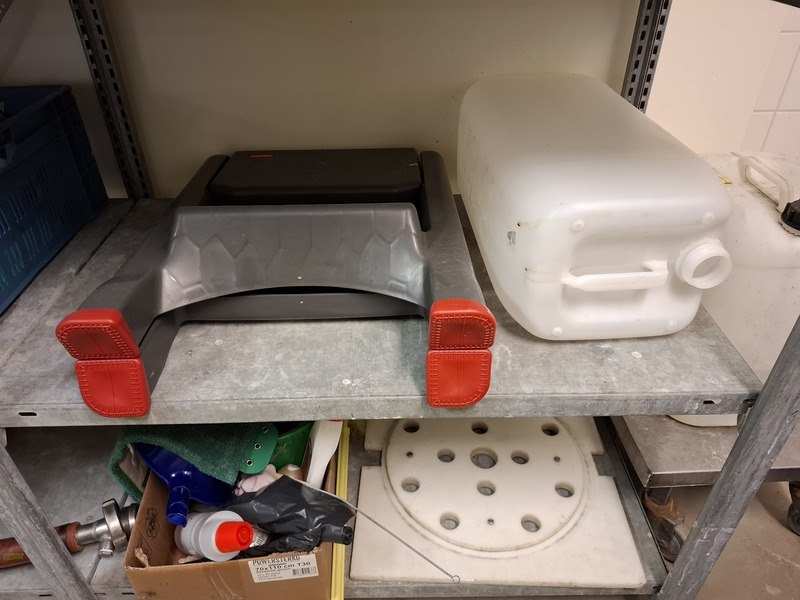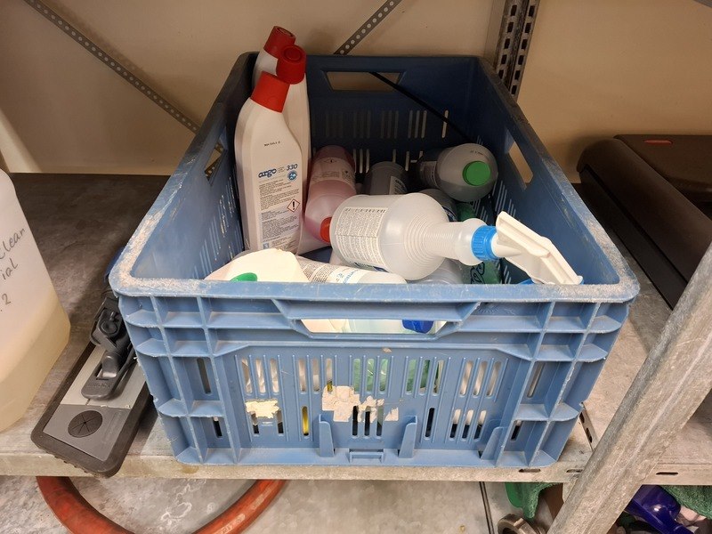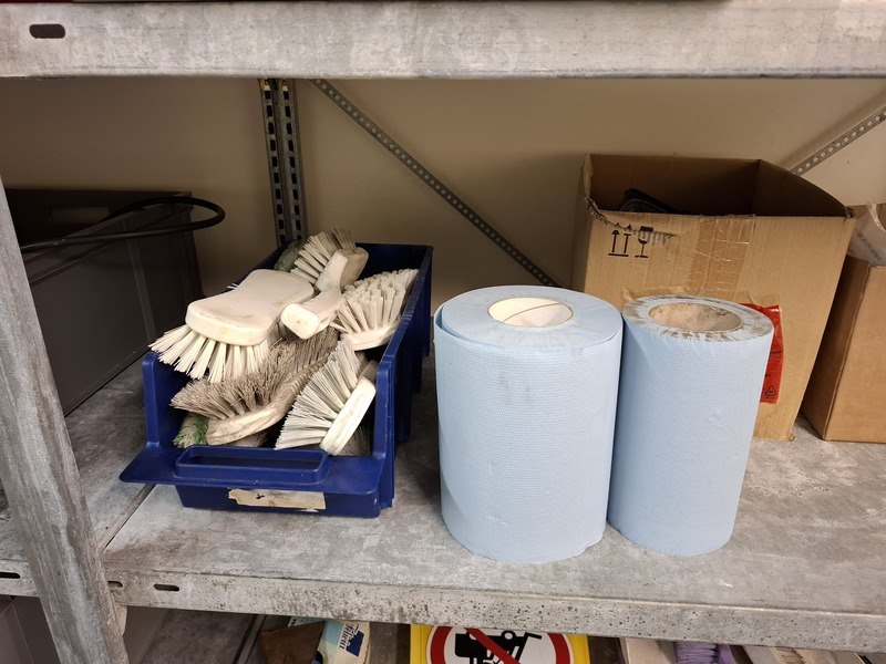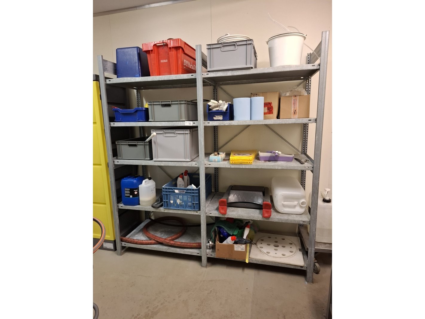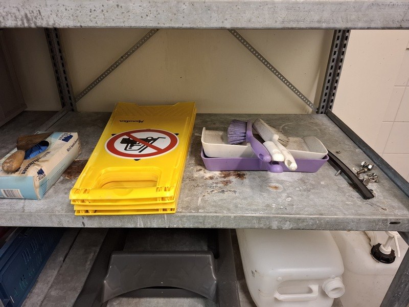 Product: Metalen stelling met diverse schoonmaaktoebehoren Afmeting: afm. ca 215x200x65cm Specificaties: o.a. opstapje, borstels, kratten, reinigingsmiddel, emmers, doeken, etc.