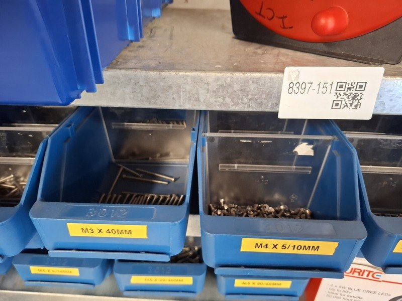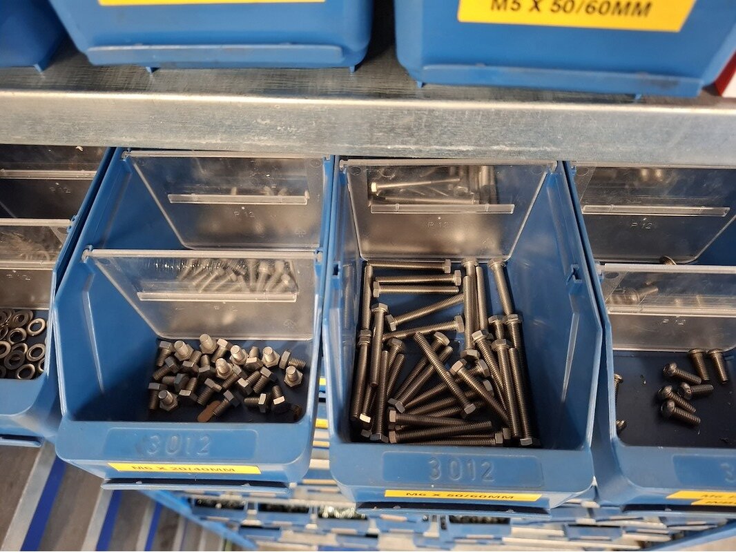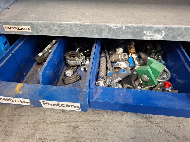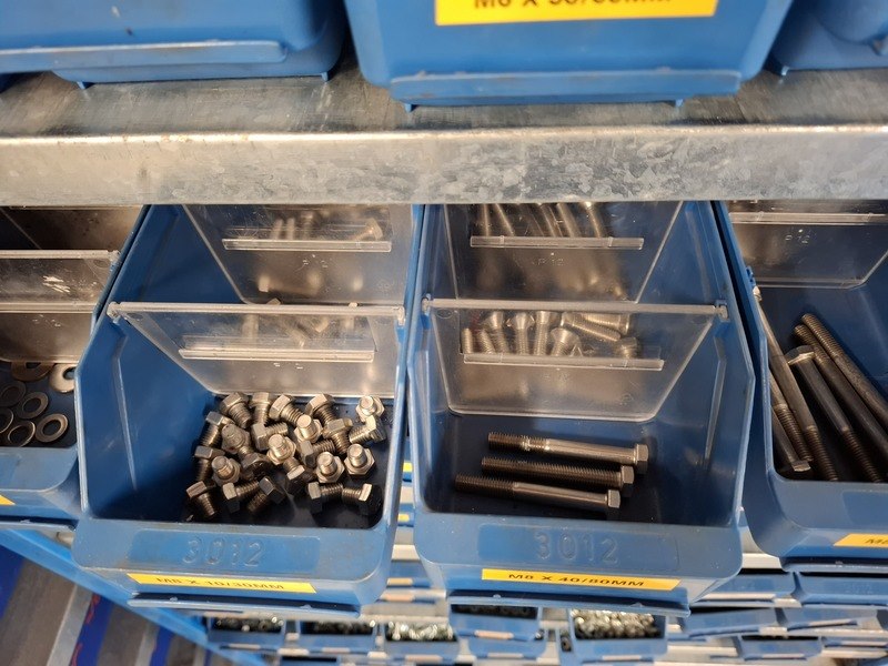 Product: Magazijnstelling met bevestigingsmateriaal Afmeting: afm. ca 200x103x32cm Specificaties: o.a. bouten, moeren, ringen, etc.