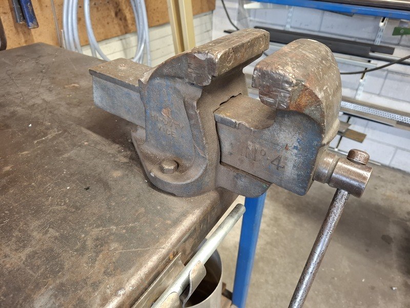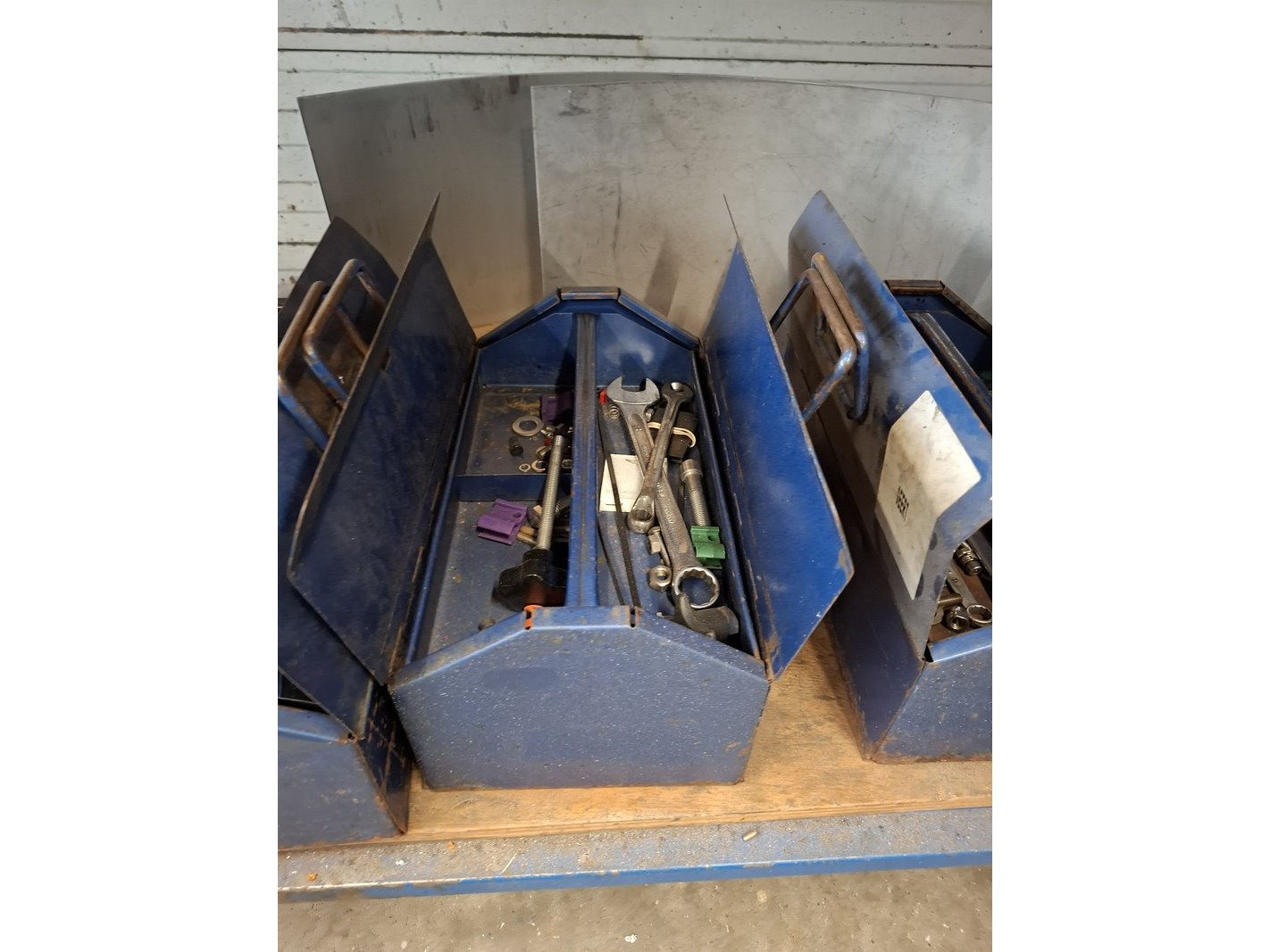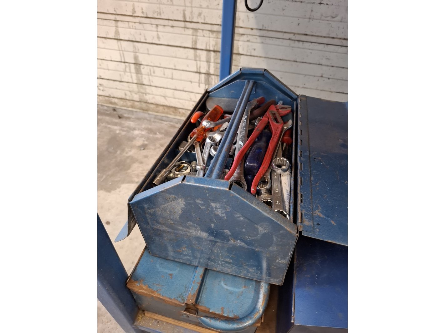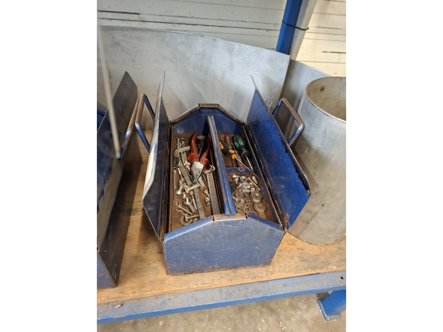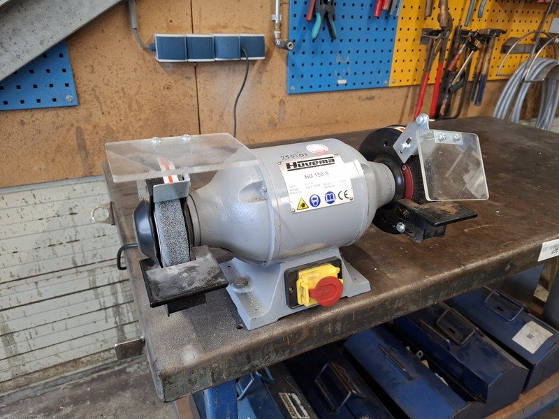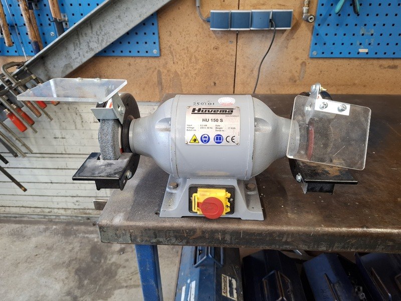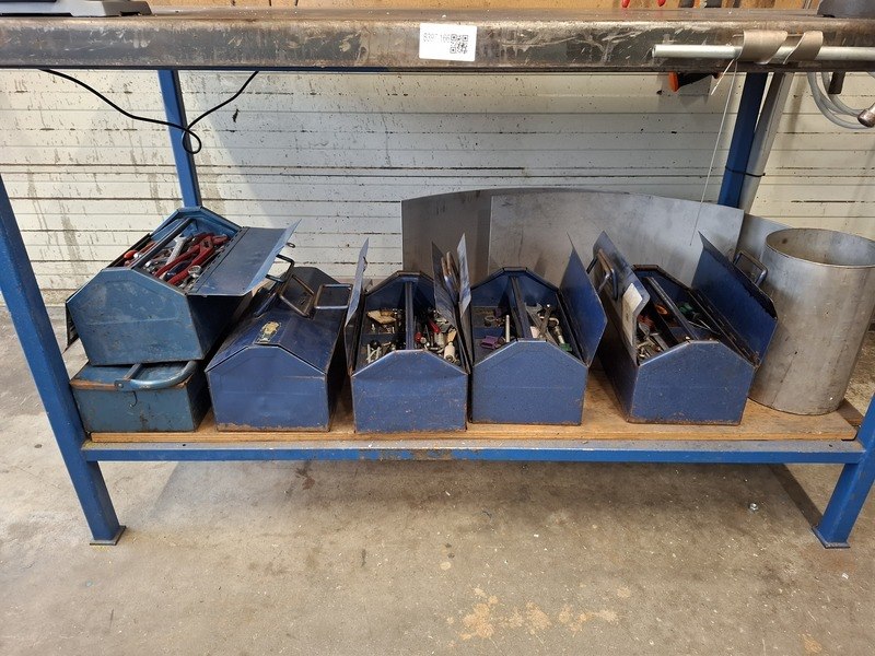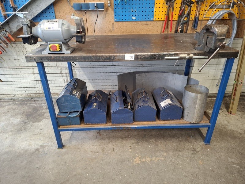 Product: Werkbank met bankschroef en slijper Afmeting: afm. ca 155x80x93cm Specificaties: werkbankslijper Huvema HU150S; bankschroef bekbreedte ca 11cm; incl. 6x gereedschapskist