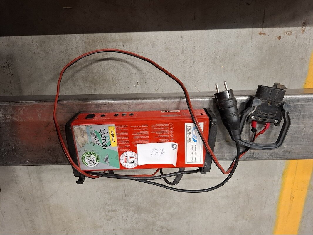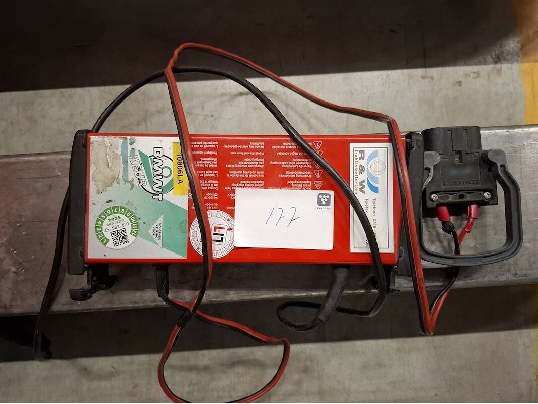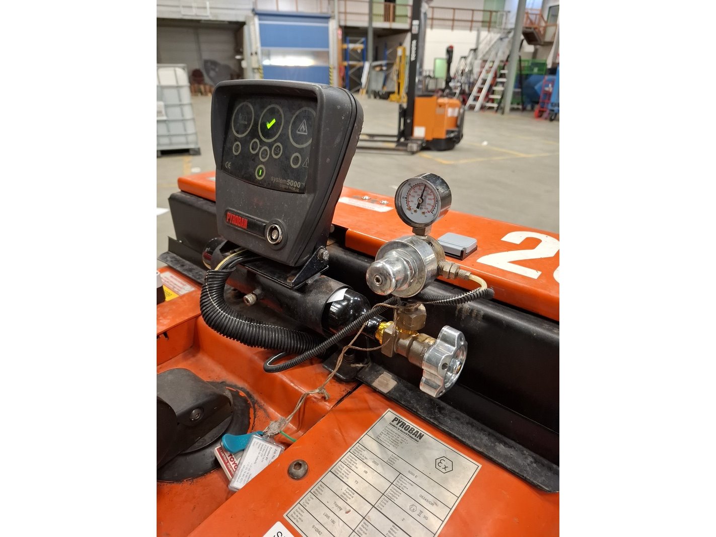 Merk: Toyota Product: Elektrische pallettruck v.v. Pyroban systeem BouwJaar: 2005 Specificaties: afgelezen urenstand 929; max 1800kg; lepellengte ca 100cm; 24V; incl. lader Pyroban systeem 5000, geschikt voor Atex omgeving (vonkvrij)