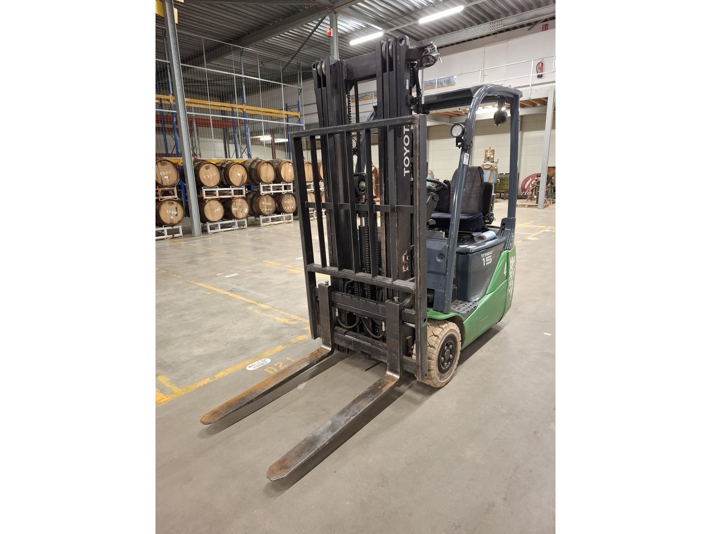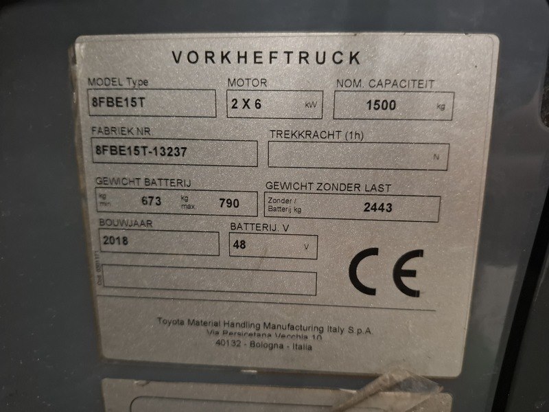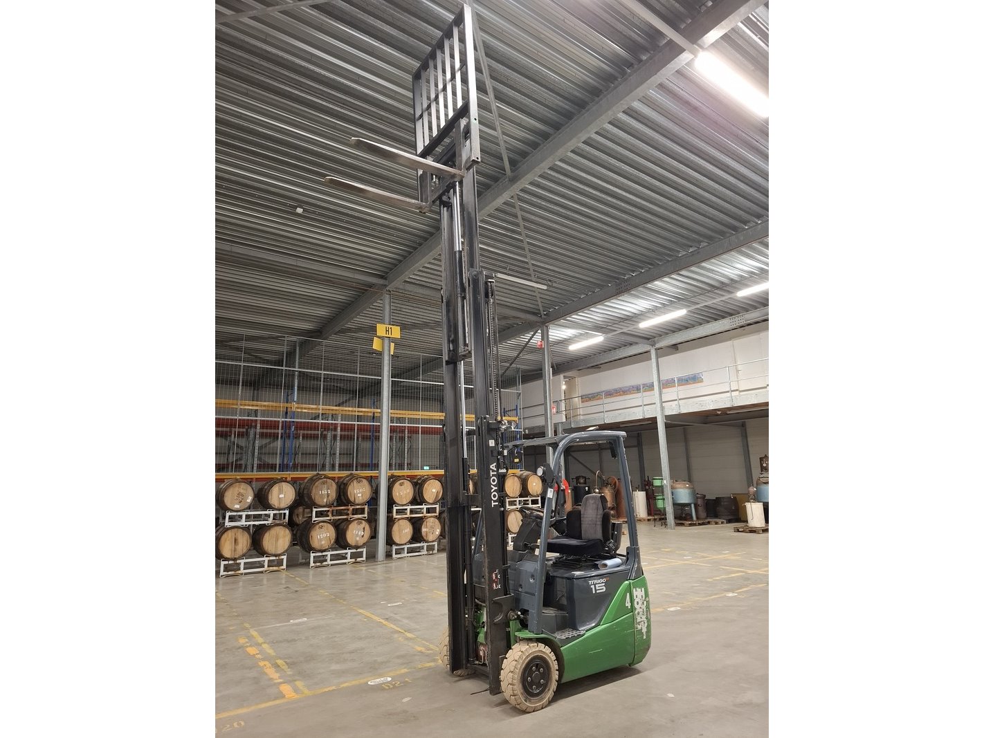 Merk: Toyota Product: Elektrische vorkheftruck BouwJaar: 2018 Specificaties: afgelezen urenstand 11639, max 1500kg, 3-delige hefmast, masthoogte ca 210cm, hefhoogte ca 470cm, freelift, side-shift, lepellengte ca 97cm, 48V, incl. lader