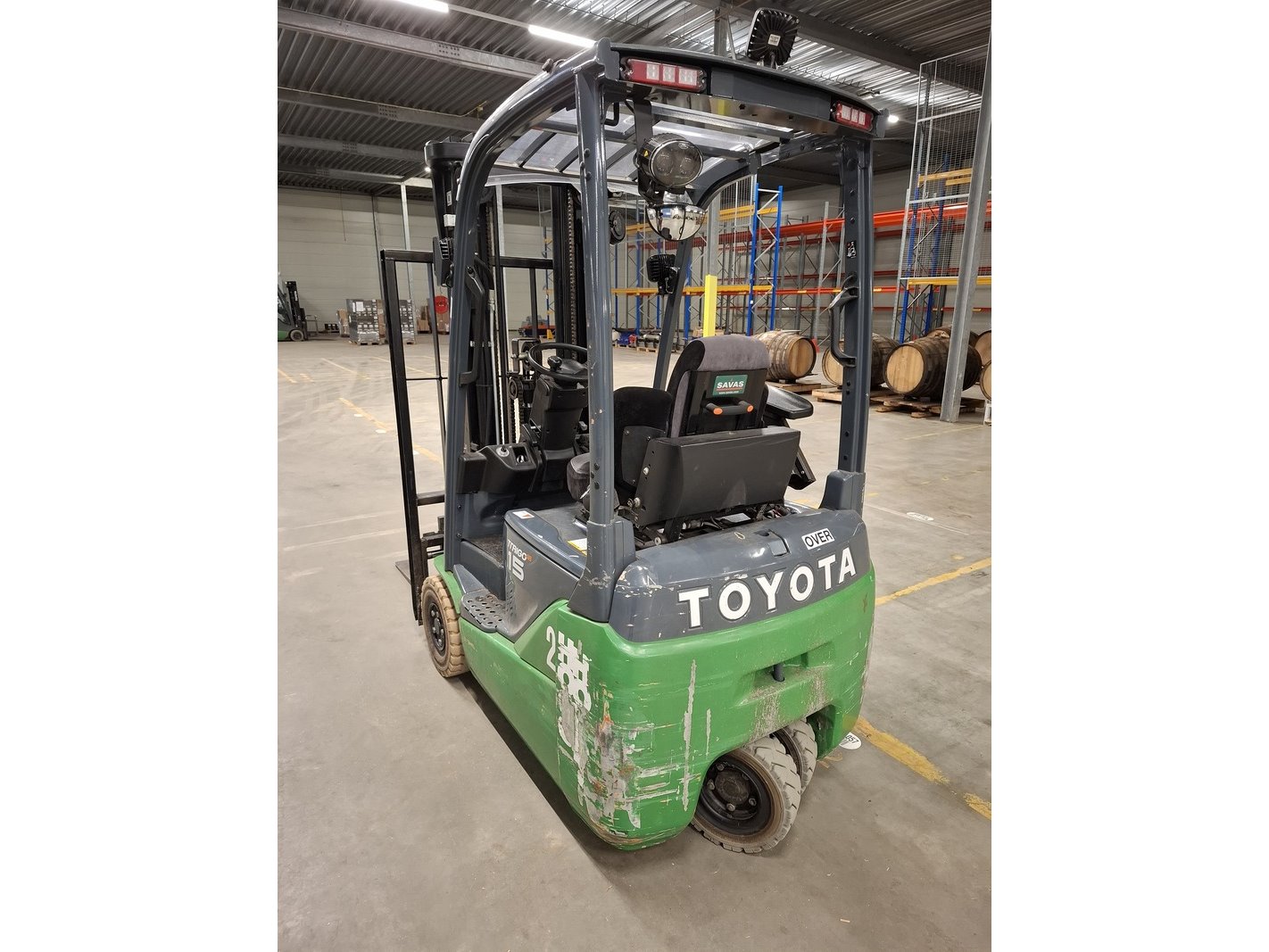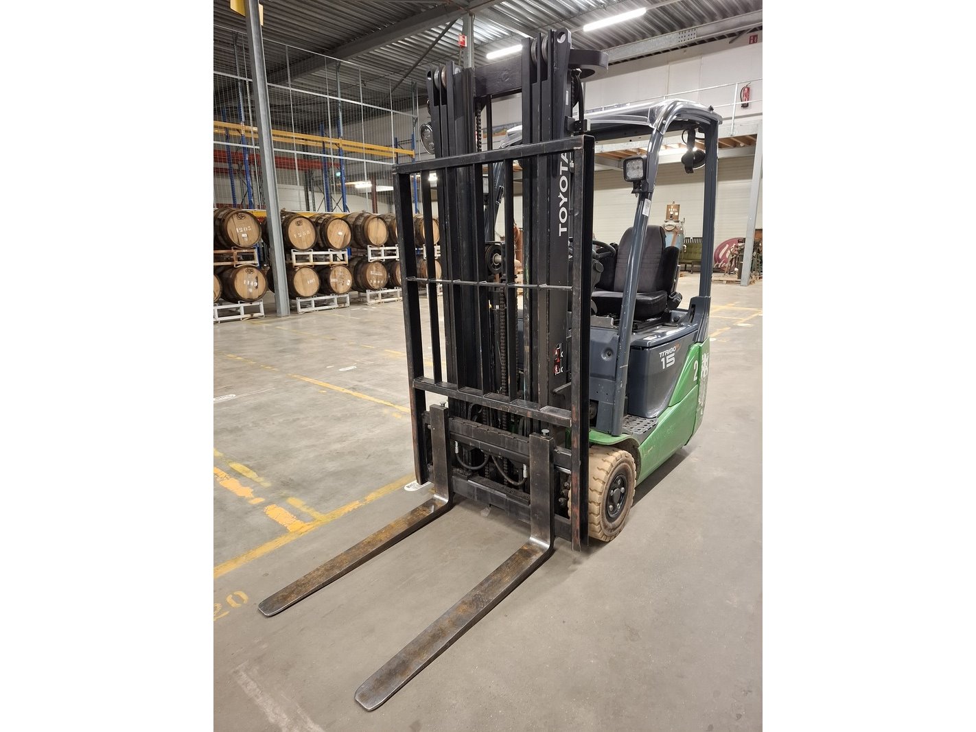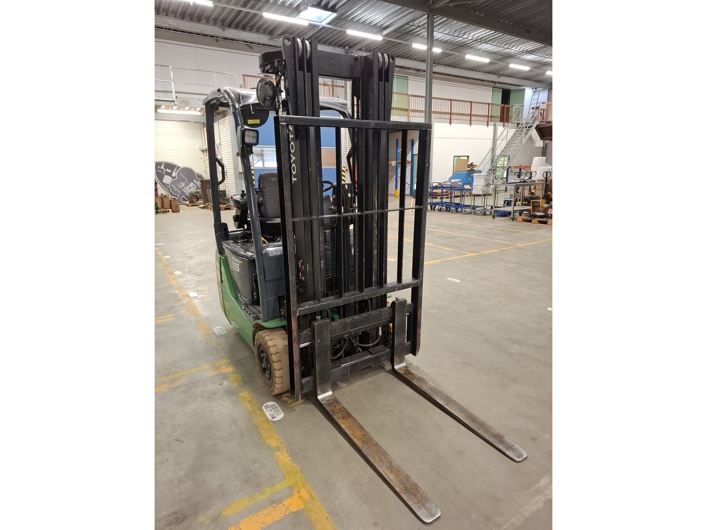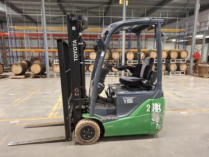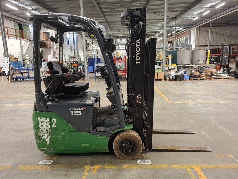 Merk: Toyota Product: Elektrische vorkheftruck Specificaties: afgelezen urenstand 13783, max 1500kg, 3-delige hefmast, masthoogte ca 210cm, hefhoogte ca 470cm, freelift, side-shift, lepellengte ca 97cm, 48V, incl. lader