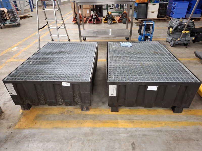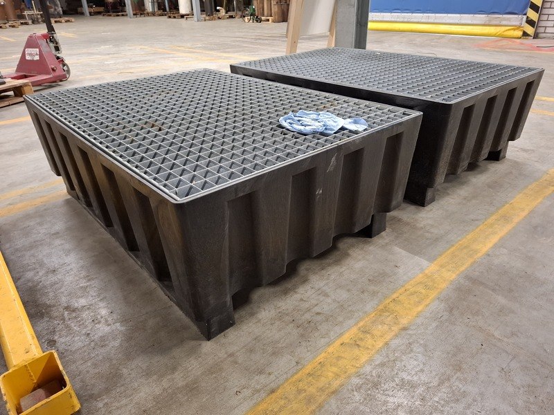 Product: 2x Vloeistof lekbak Materiaal: kunststof/metaal Afmeting: lxbxh ca 123x83x42cm BouwJaar: 2011 Specificaties: ca 200ltr inhoud