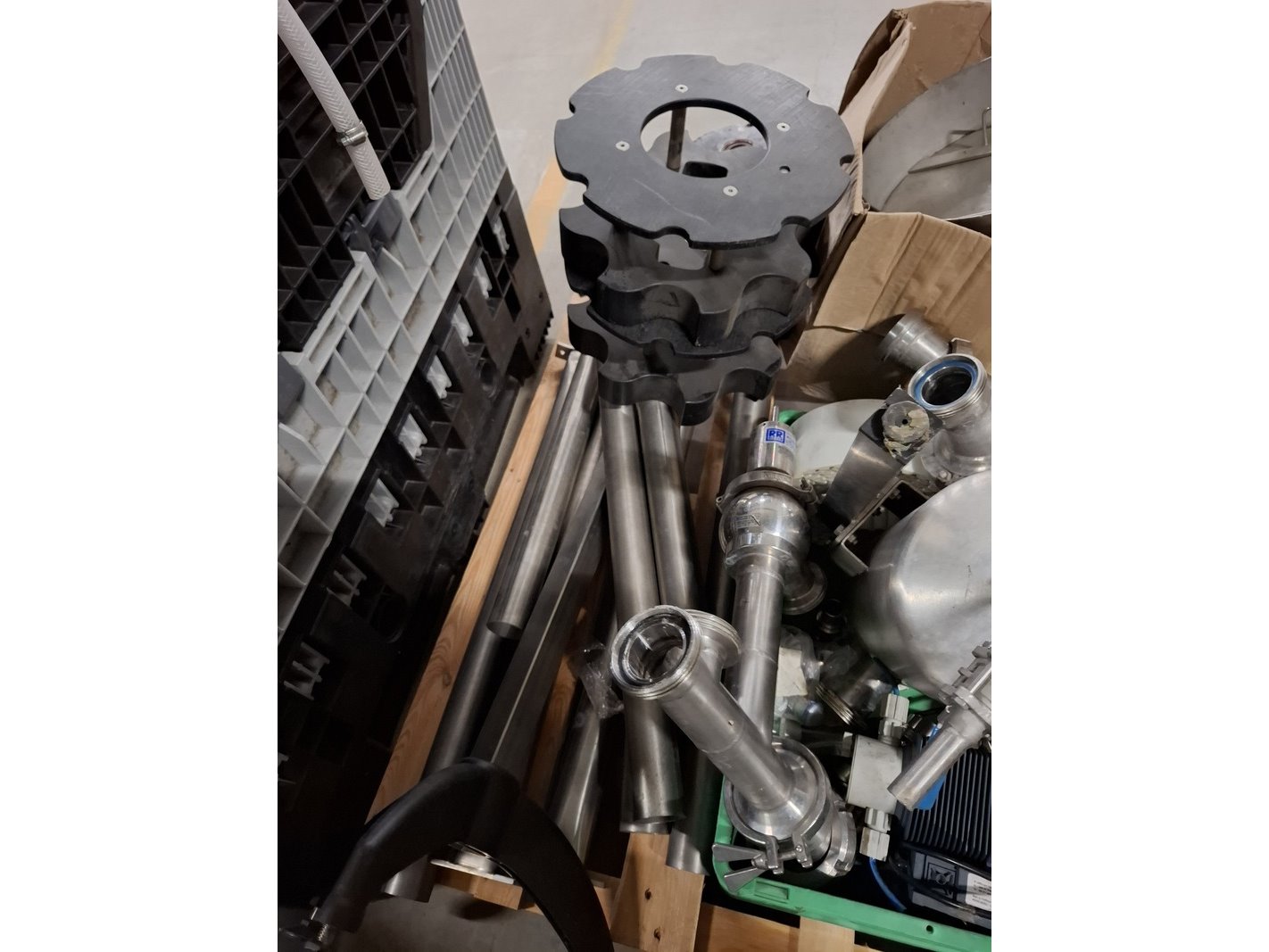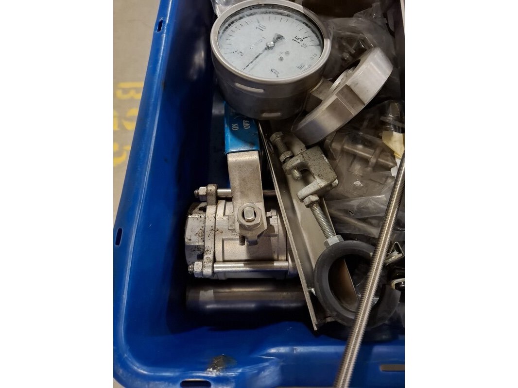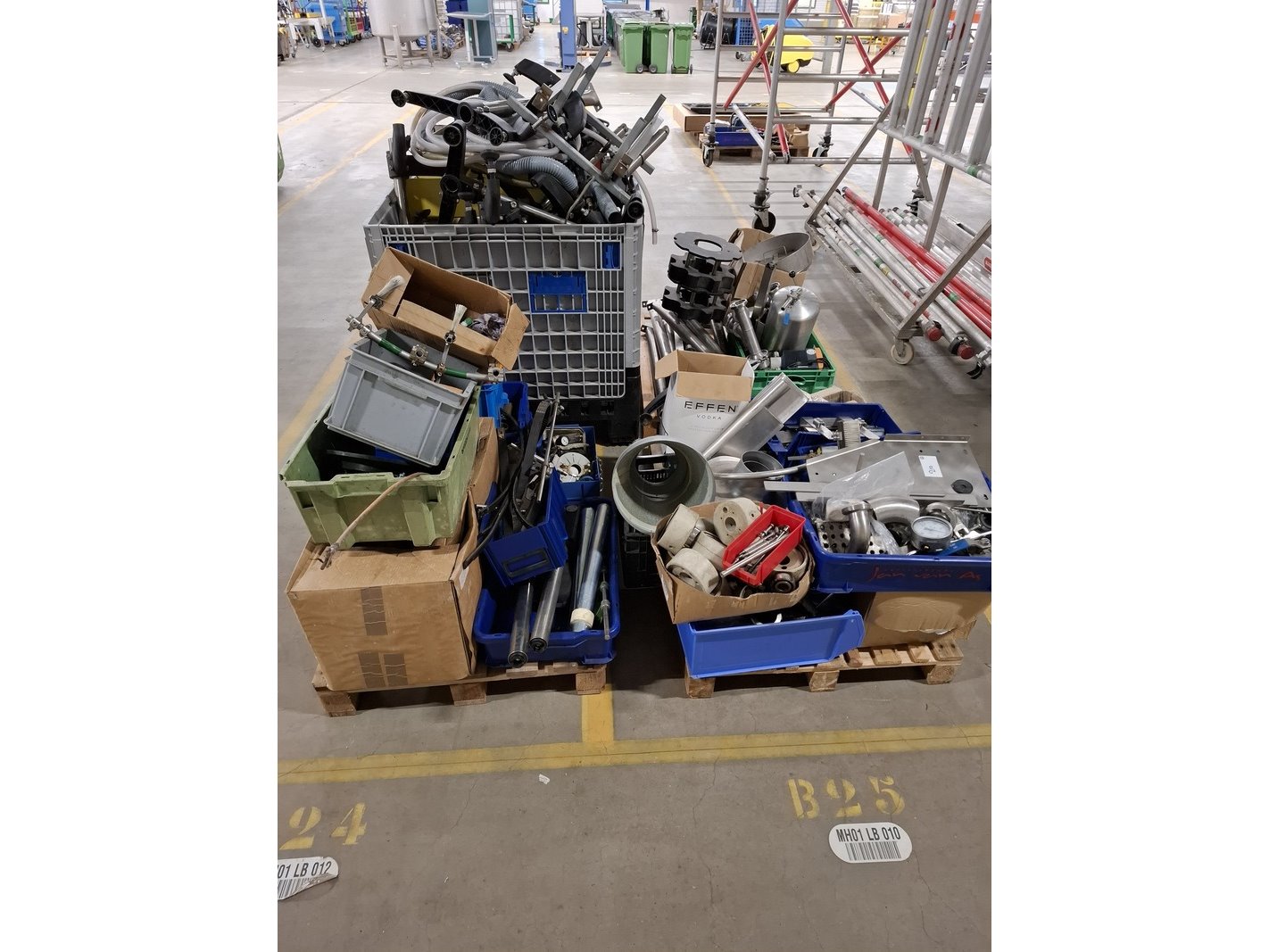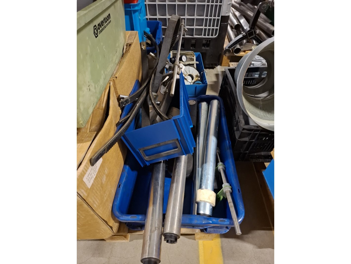 Product: Partij machine onderdelen en toebehoren Specificaties: RVS, kunststof, metaal, etc.; o.a. slang, aanrijbeveiliging palletstelling; looprollen; drukmeters; koppelingen; bevestigingsmateriaal; etc. (op 4x pallet)