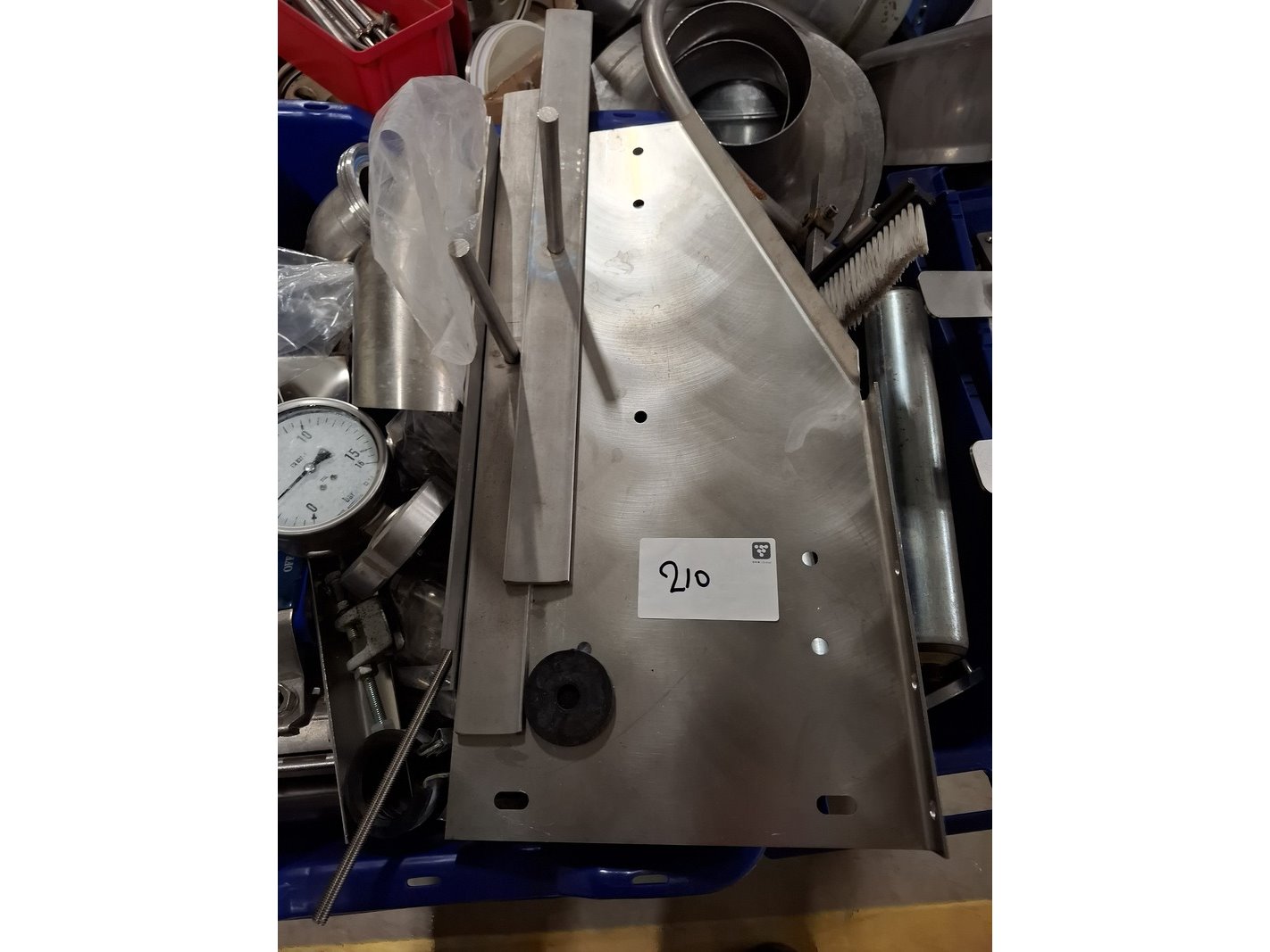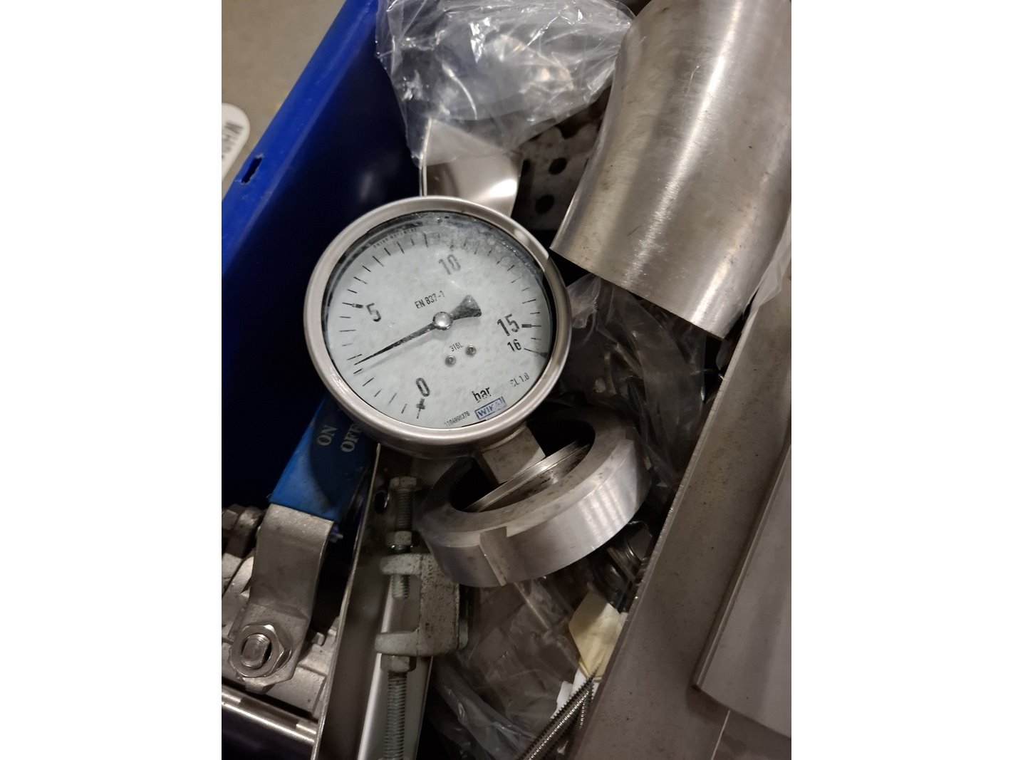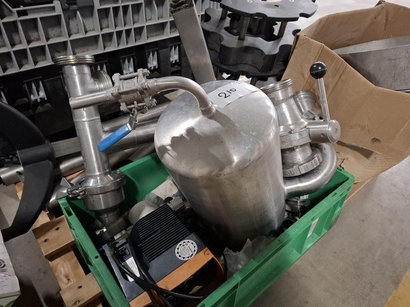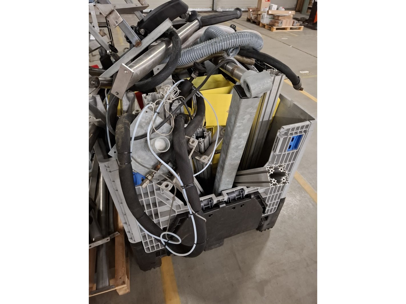 Product: Partij machine onderdelen en toebehoren Specificaties: RVS, kunststof, metaal, etc.; o.a. slang, aanrijbeveiliging palletstelling; looprollen; drukmeters; koppelingen; bevestigingsmateriaal; etc. (op 4x pallet)