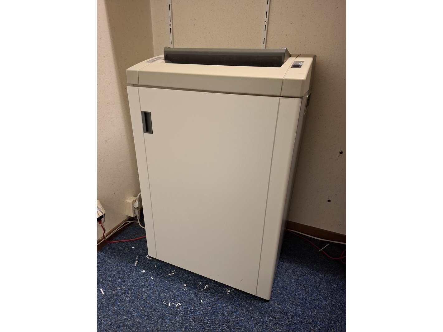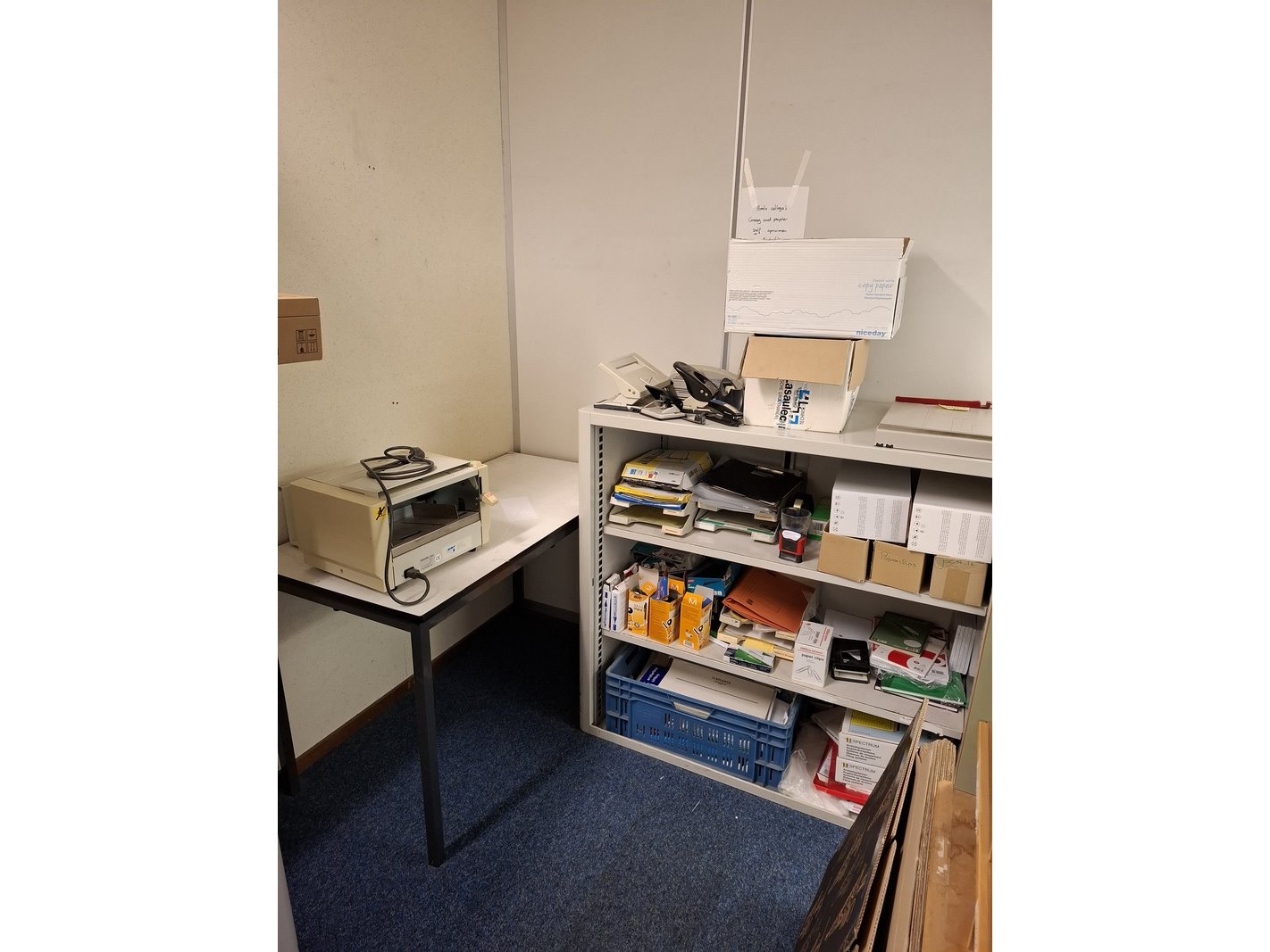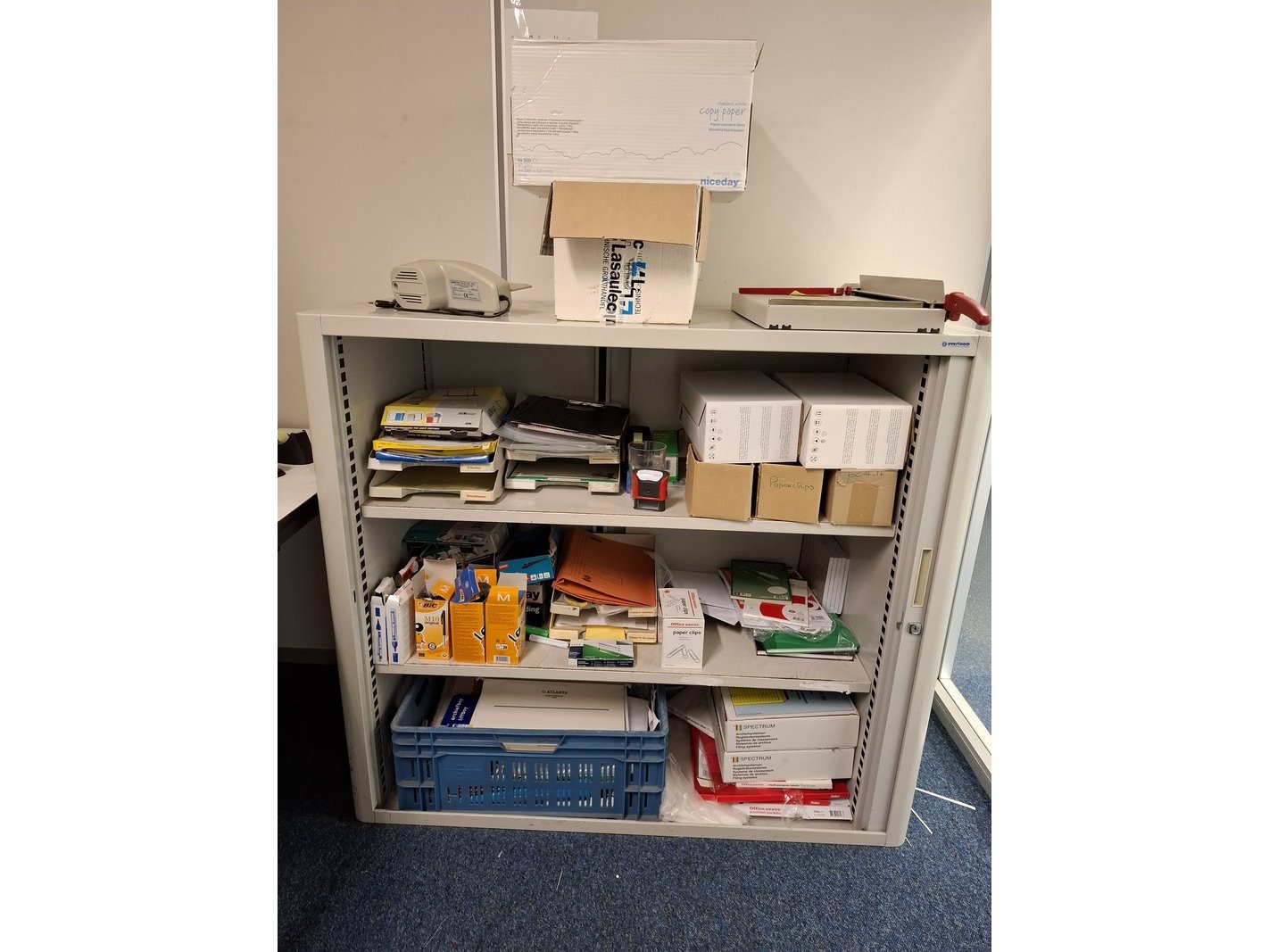 Product: Inhoud printerruimte Specificaties: bestaande uit: papierversnipperaar, lameldeurkast met diverse kantoorgerei, postbakken, etc.