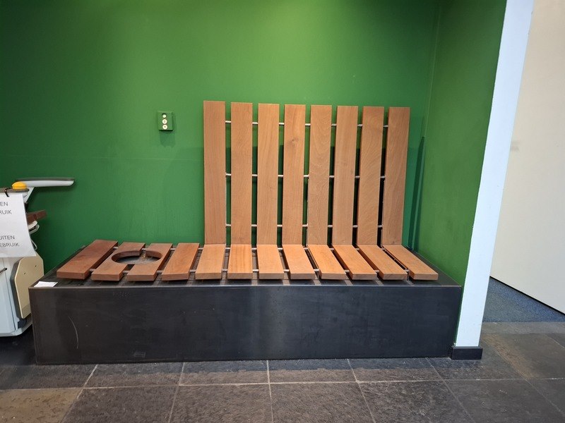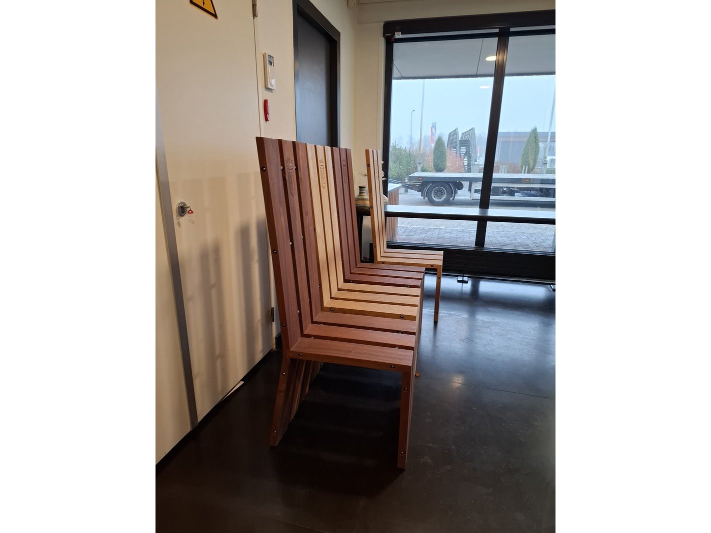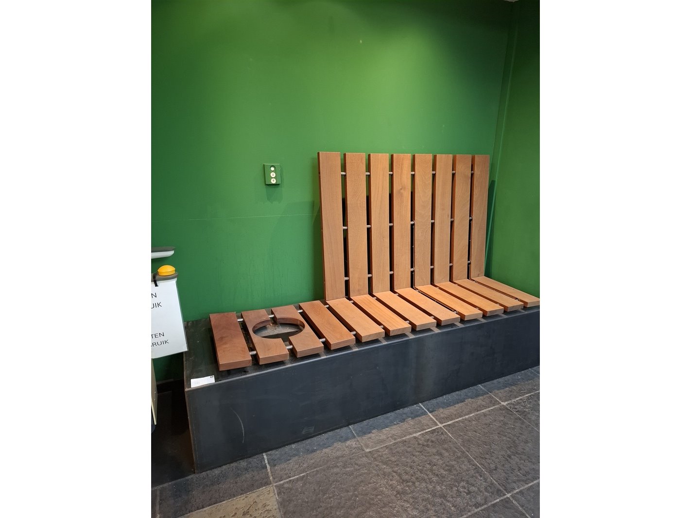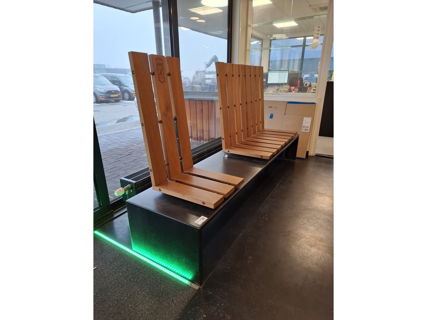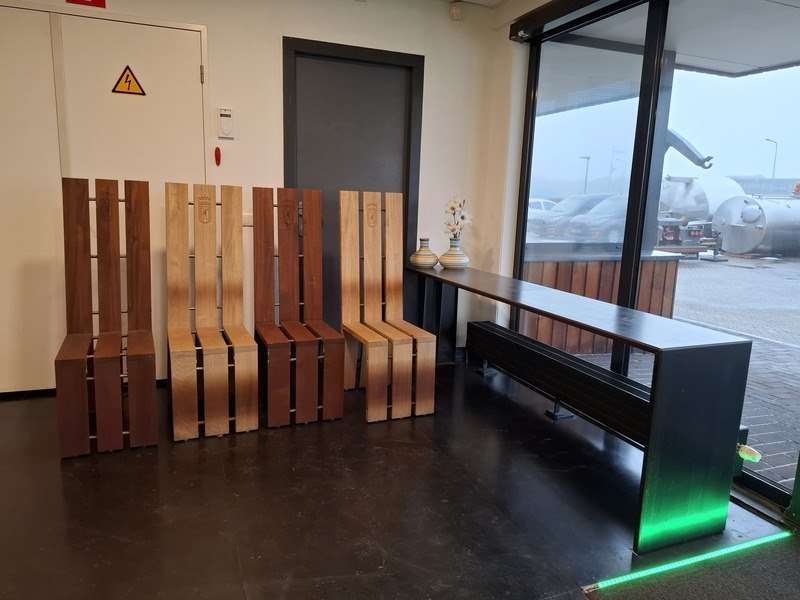 Product: Design wachtruimte opstelling 'Hooghoudt' Specificaties: bestaande uit 1x stoelopstelling lxbxh ca 243x57x125cm; 1x tafel lxbxh ca 221x44x75cm met 4x stoelen,1x stoelopstelling ca 201x62x118cm