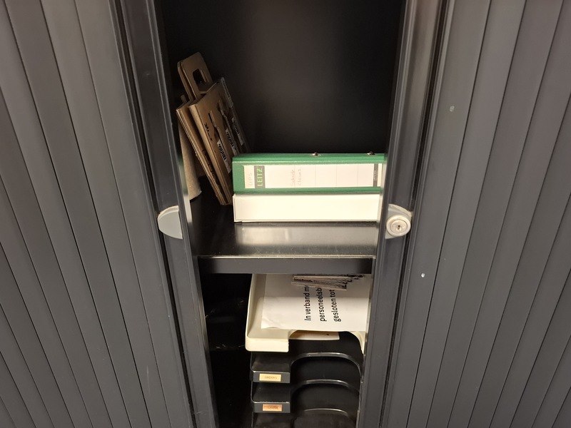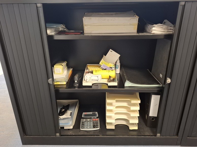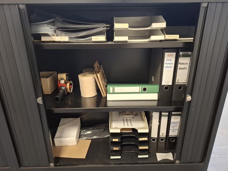 Product: Lameldeurkast met inhoud Afmeting: hxbxd ca. 103x120x43cm Specificaties: exclusief sleutel, inhoud bestaande uit: diverse kantoorgerei enkele mappen zullen verwijderd worden