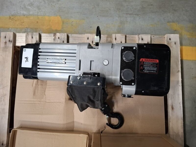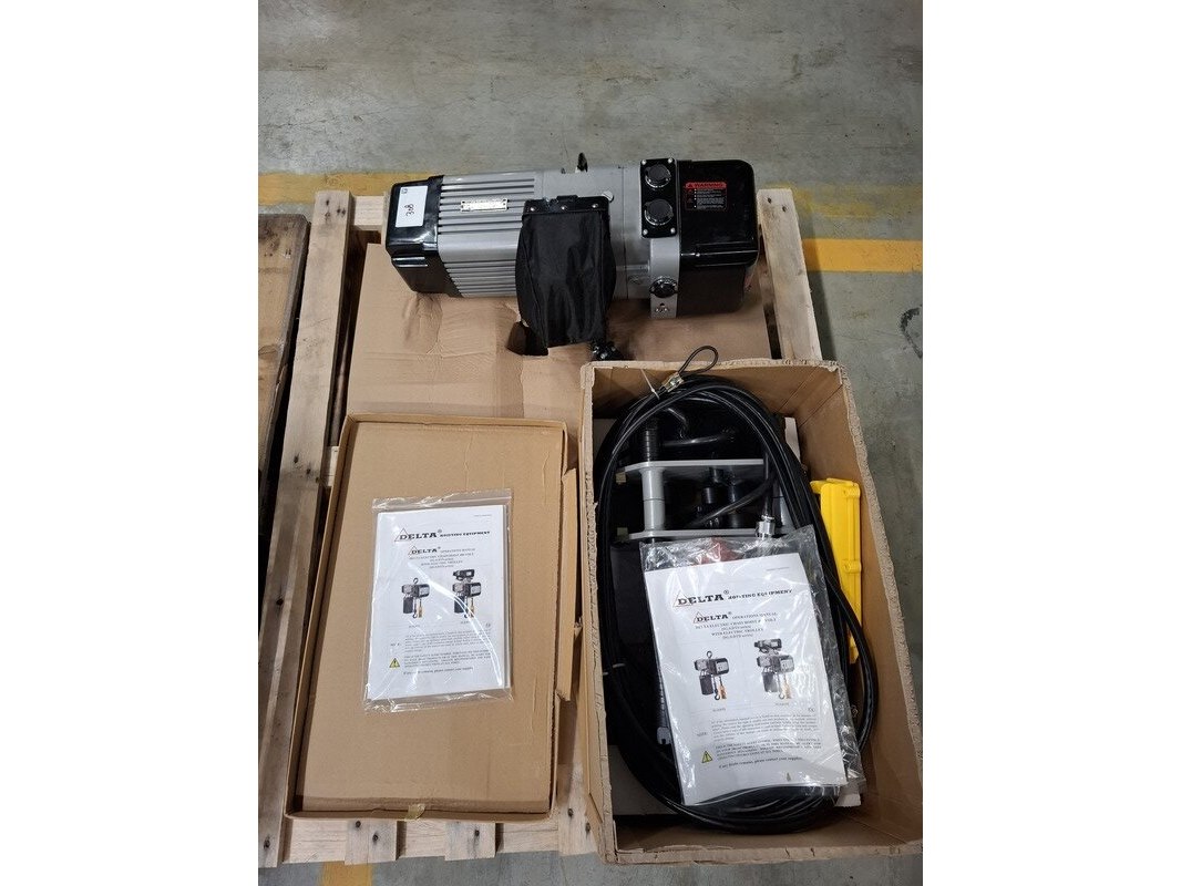 Merk: Delta Product: Elektrische kettingtakel Conditie: nieuw Specificaties: max 1 ton, 400V, incl loopkat
