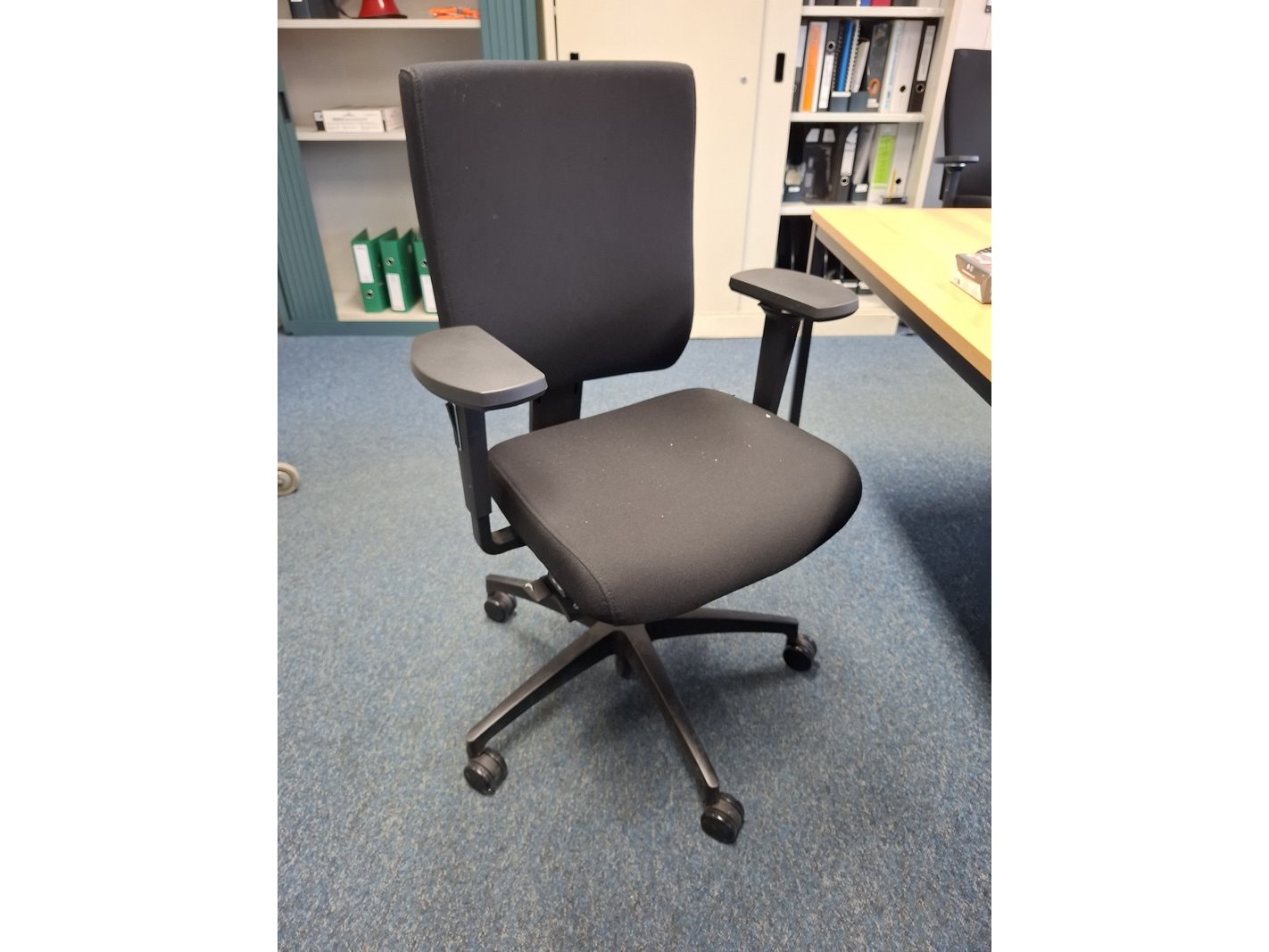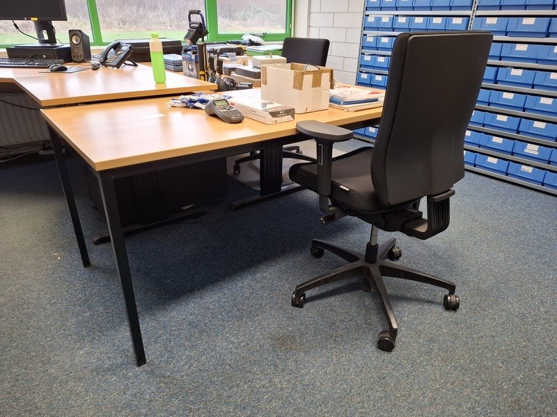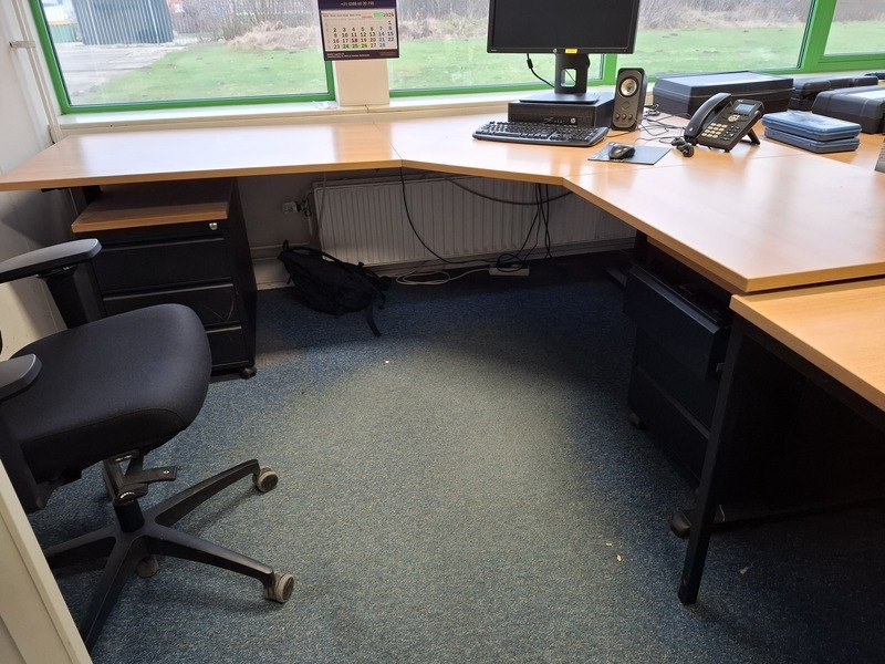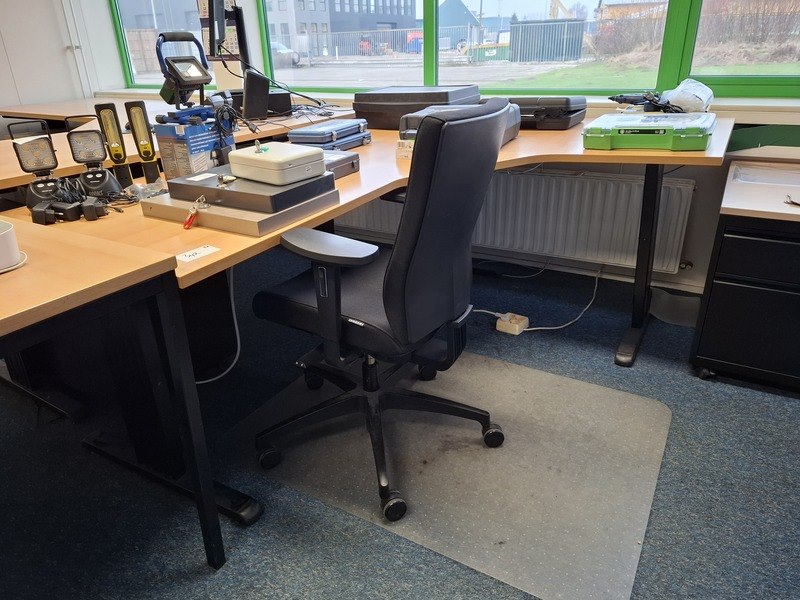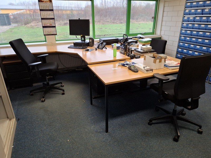 Product: Diverse kantoorinventaris Specificaties: o.a. lameldeurkast met inhoud, afm ca 195x120x40cm; 2x hoekbureau; 1x bureautafel; 3x bureaustoel; 3x ladeblok