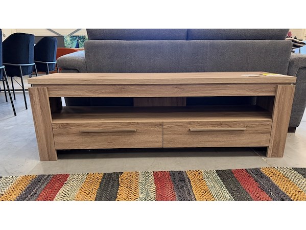 Product: TV meubel Kleur: grijseiken Materiaal: fineer Afmeting: 150x40x50 cm Specificaties: Showmodel Showmodellen kunnen gebruikssporen en/of beschadigingen hebben. Voor een goed beeld kun je gebruik maken van de kijkdag.