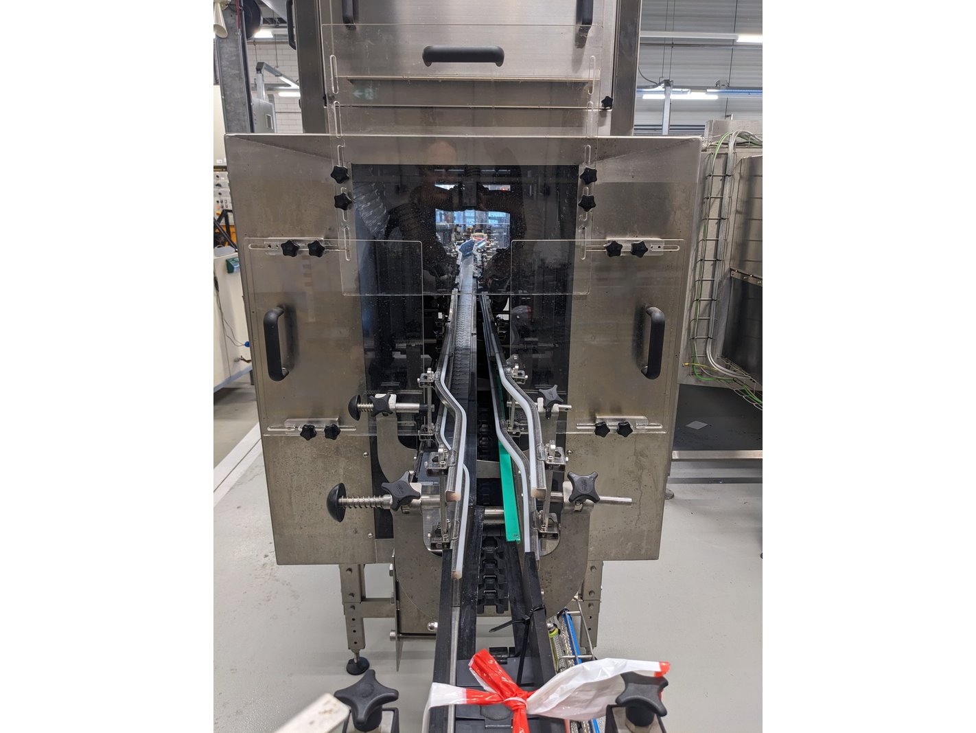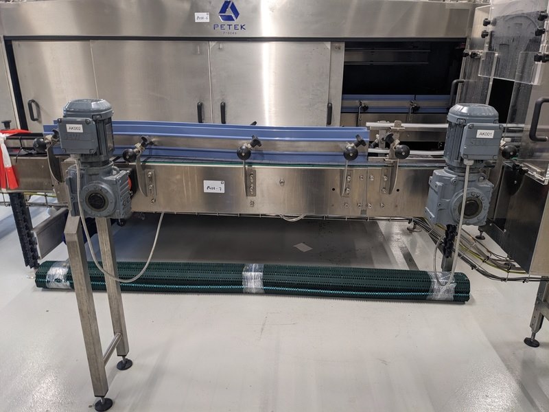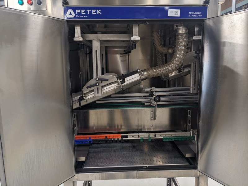 Merk: Petek Product: Drining knife luchtdroger Materiaal: RVS 304 Afmeting: L475cm x B100cm x H250cm BouwJaar: 2021 Conditie: gebruikt Specificaties: geïsoleerde luchtdroger, flessendraaier, uitvoerband met dubbele aandrijving 380V, vermogen 7,5kW, lengte uitvoer circa 170cm, invoerband lengte circa 50cm