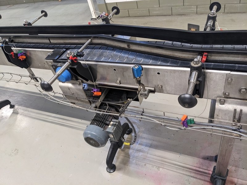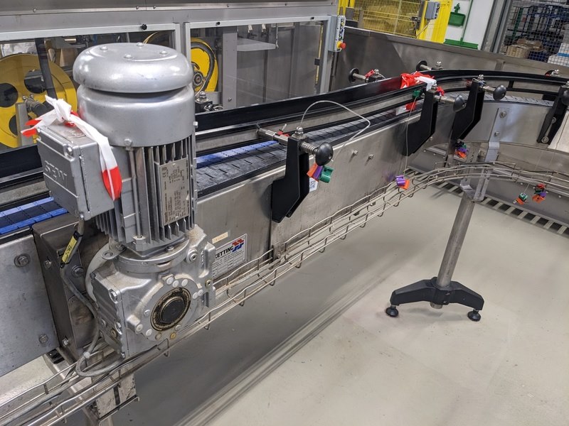Merk: Polyketting Product: 23 Meter flessen baan Kleur: zwart Materiaal: RVS Afmeting: totaal circa 63 meter BouwJaar: 2009 Conditie: gebruikt Specificaties: kunststofband type Movex 82 mm MX820/880 , inclusief 4 elektromotoren 380V, baanhoogte circa 106cm, 4 bochten 90 graden radius inwendig 45cm, 14 verstelbare poten, 3 noodstopknoppen, kabelgoot