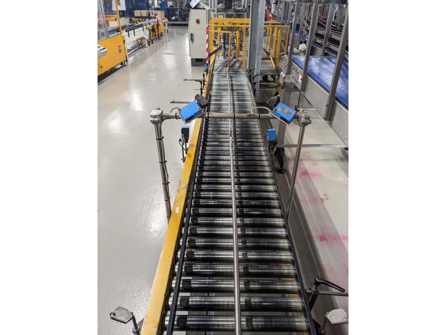 Merk: Beerepoot Product: Rollenbaan met dozenverdeler Kleur: geel Materiaal: staal Afmeting: L1170cm x B38/50cm Conditie: gebruikt Specificaties: rollenbaan met 5 elektromotoren, baanwissel station, diverse sensoren, baanhoogte circa 60cm