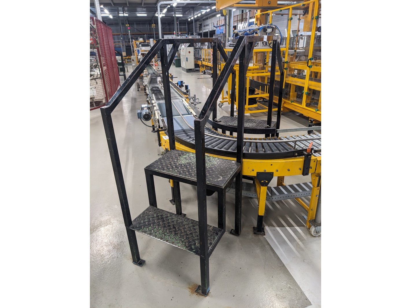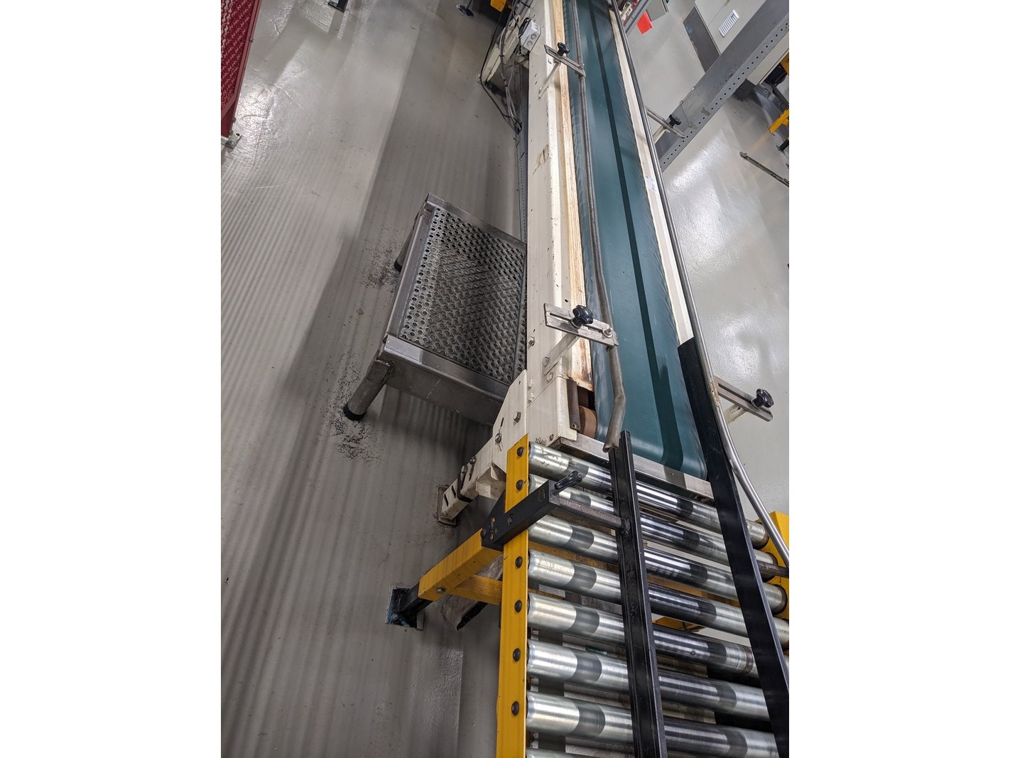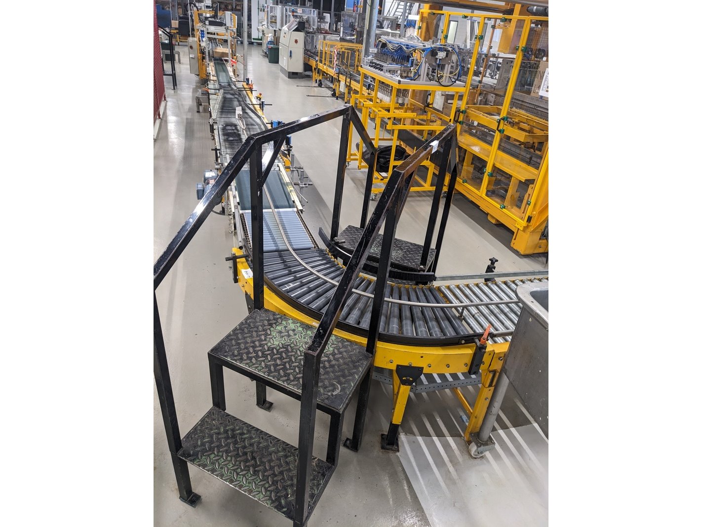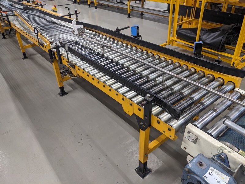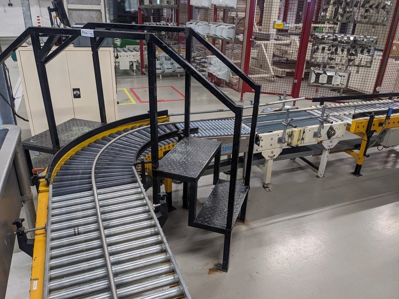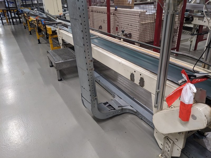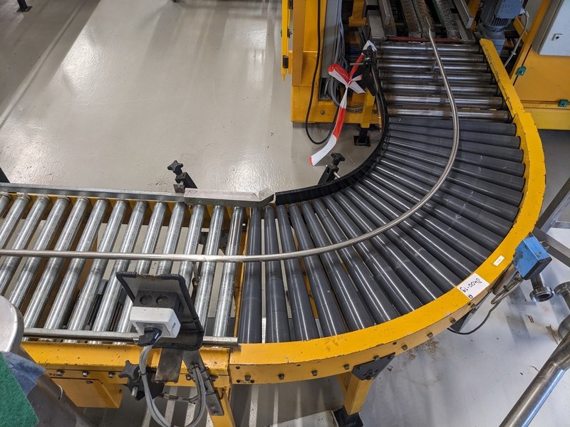Merk: divers Product: Rollenbaan/band divers Kleur: geel / wit Materiaal: staal Afmeting: L1320cm x B30/50cm Conditie: gebruikt Specificaties: rollenbaan met 2 bochten en 2 elektromotoren, Stork rollenbaan kunststof, totaal 8 elektromotoren, inclusief stalen loopbrug, hoogte circa 60cm, diverse sensoren, midden geleider, zijgeleiders, noodknop