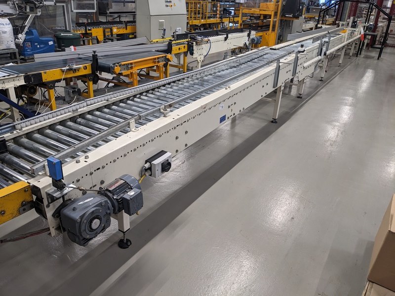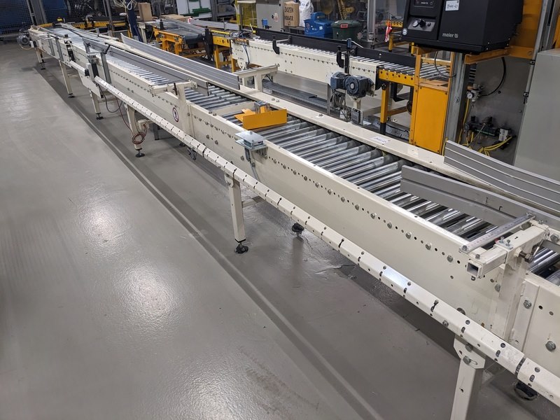 Merk: Ammaraal Beltech Product: Rollenbaan Kleur: geel / wit Materiaal: staal Afmeting: totale lengte ca 12,6 meter, baanhoogte 60cm Conditie: gebruikt Specificaties: 180 graden bocht rollenbaan, L260cm x B50cm x H60cm met aandrijving en noodstop, 1x witte Ammeraal rollenbaan L400cm x B50cm met elektromotor en noodstop, 1x witte Ammeraal rollenbaan L600cm x B33cm netto met elektromotor en dozenstopper en extra baanbegeleiding