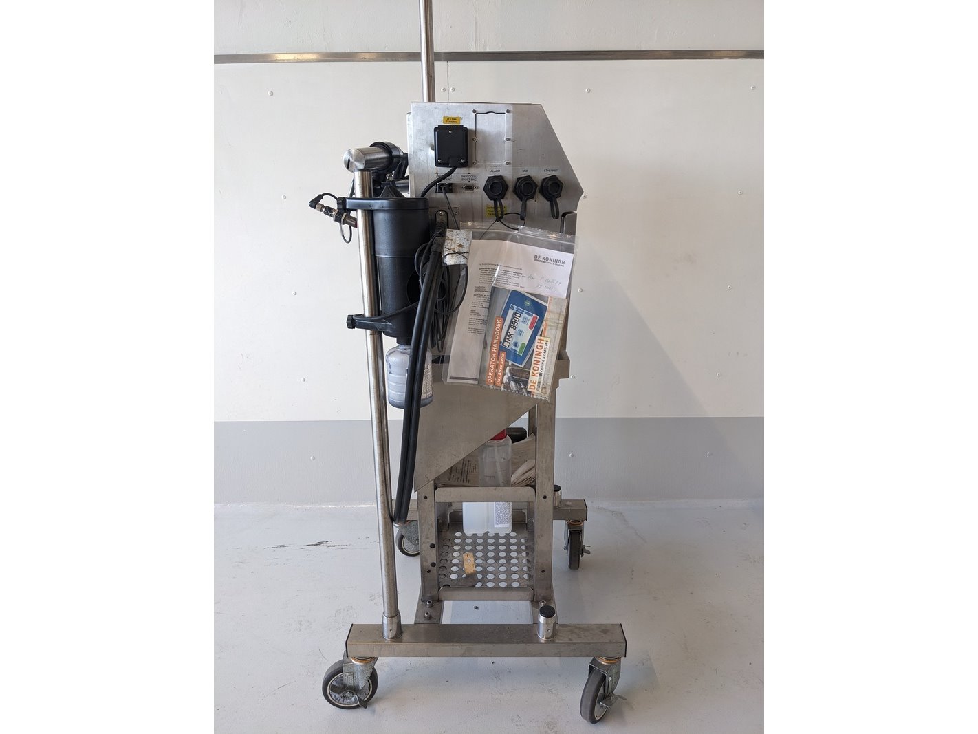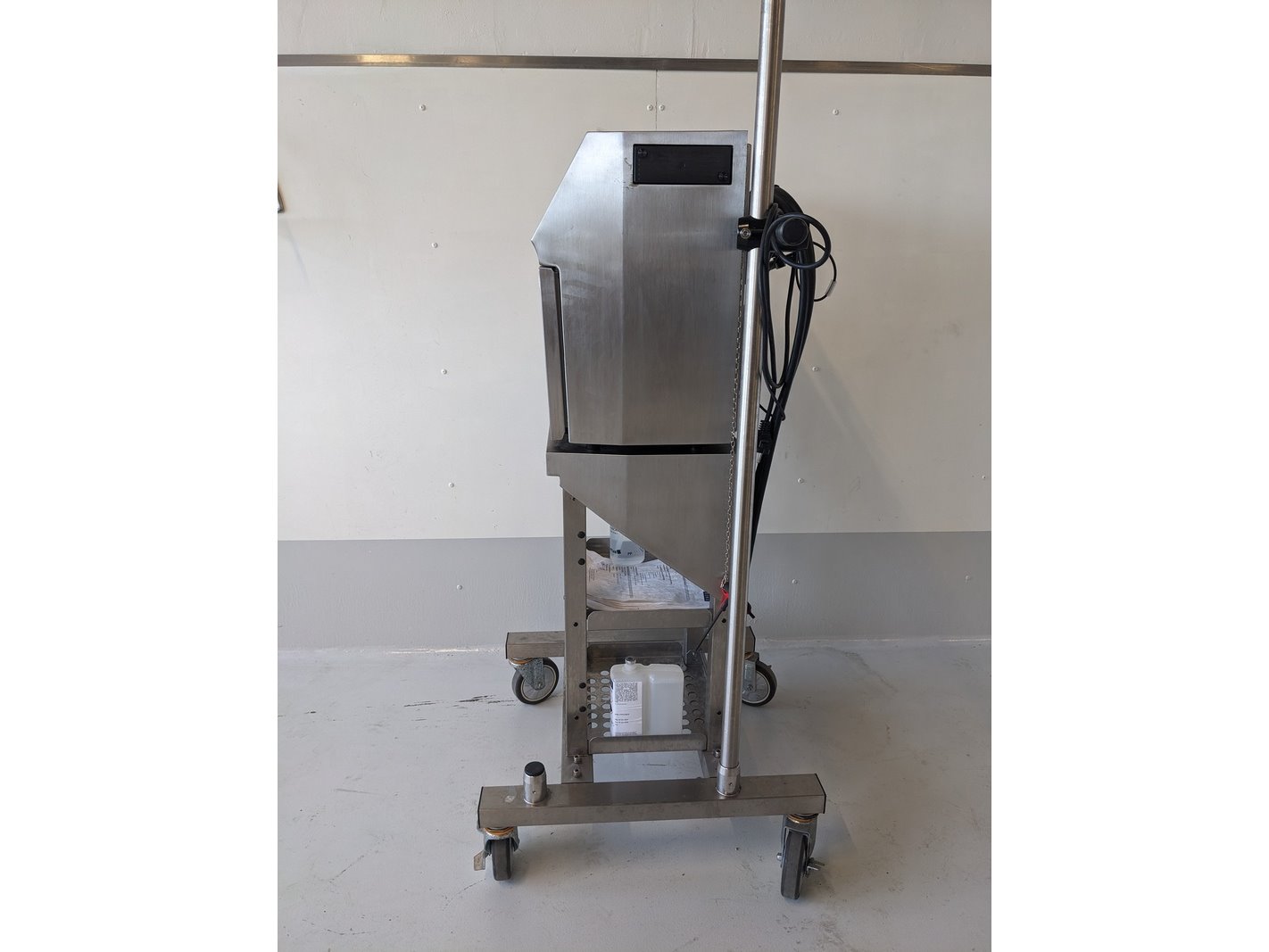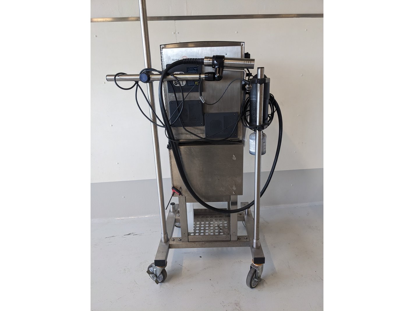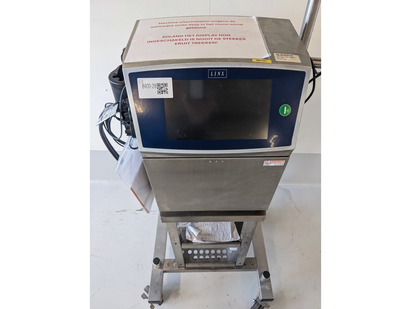 Merk: Linx Product: Intkjet printer Materiaal: RVS Afmeting: L70cm x B60cm x H130cm BouwJaar: 2021 Conditie: gebruikt Specificaties: mobiele intkjet printer, op onderstel, hoogte verstelbaar, klein karakter, met MK11 midi printkop, inclusief 3-Line software, printkop statief, spoelstation