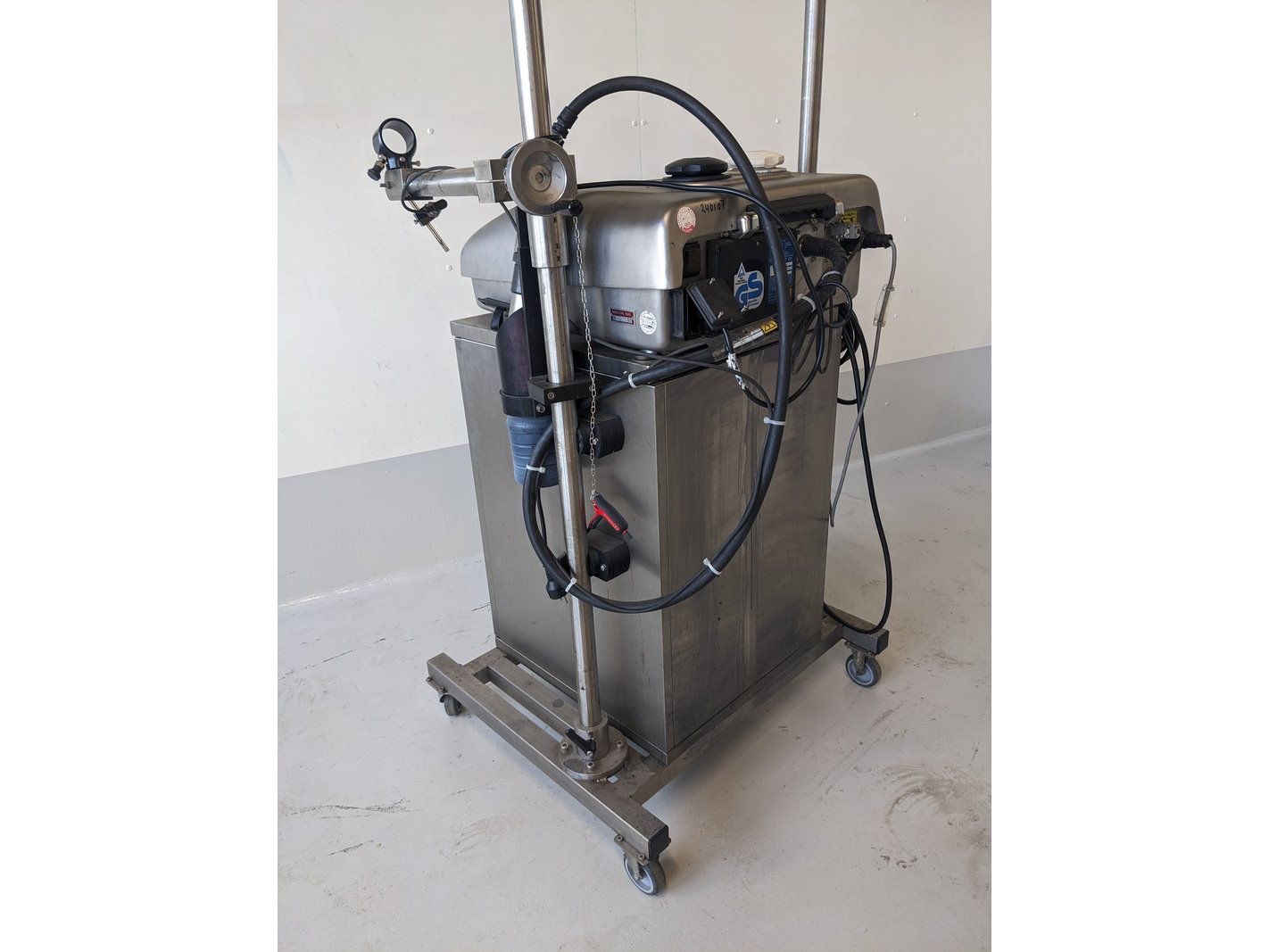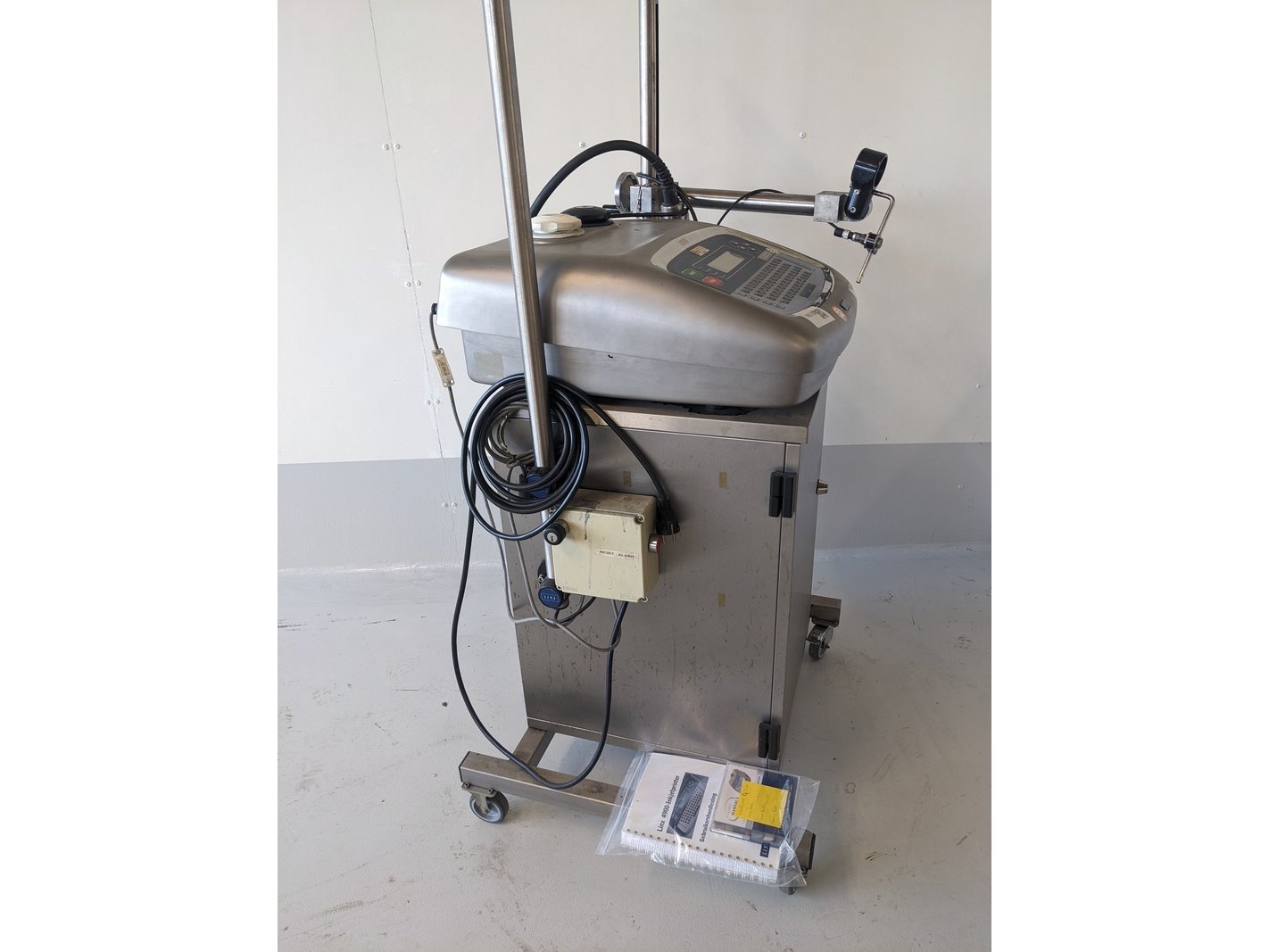 Merk: Linx Product: Inkjet printer Materiaal: RVS Afmeting: L70xcm x B70cm x H110cm BouwJaar: 2008 Conditie: gebruikt Specificaties: mobiele inkjet printer, op onderstel, hoogte verstelbaar, klein karakter, printkop statief, spoelstation, RVS kast met handleiding