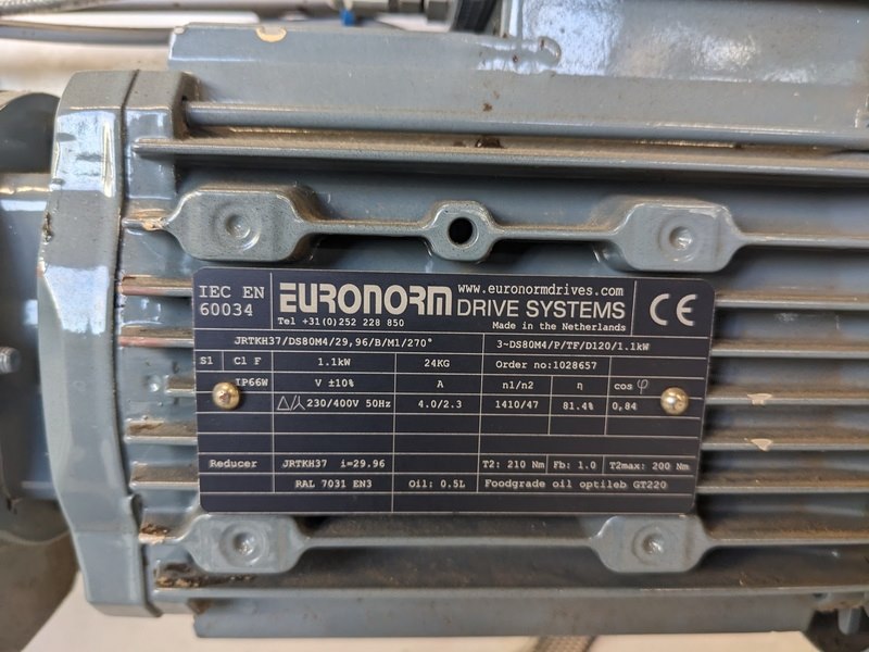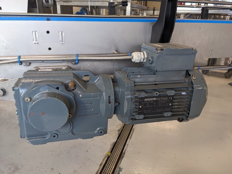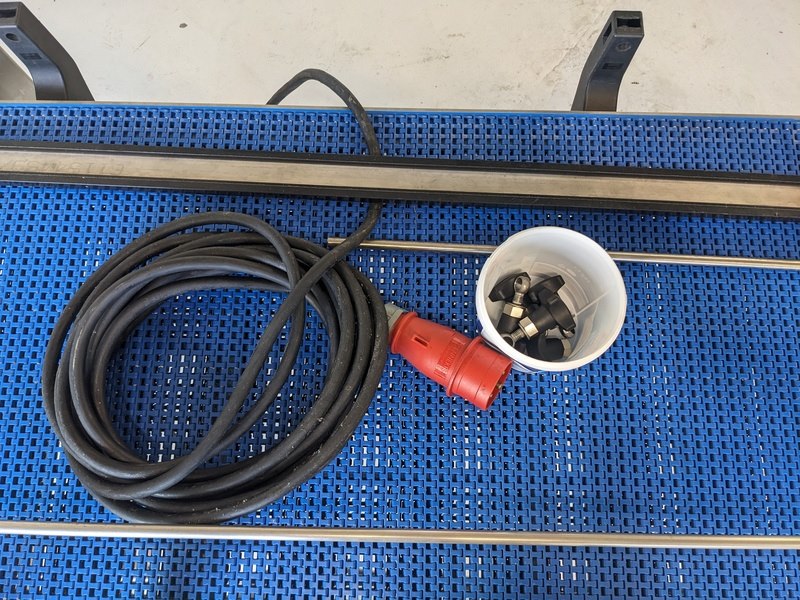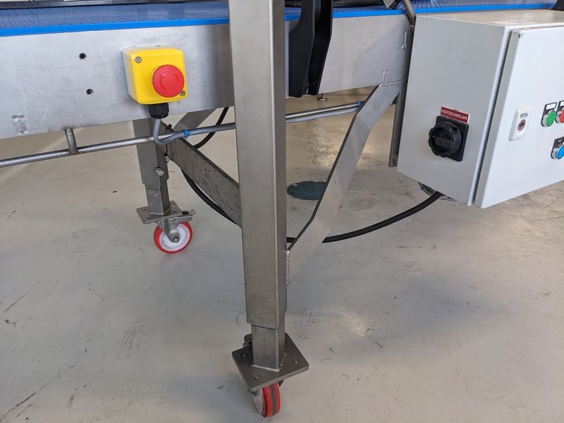 Product: Transportbaan Kleur: blauw Materiaal: RVS Afmeting: L500cm x B80cm x H80cm Conditie: gebruikt Specificaties: transport baan met kunststof schakelband breedte 55cm, variabele snelheid, links en rechtsom draaiend, noodstop, verstelbare zijgeleiding, bedieningskast met frequentie regelaar, op hoogte verstelbare bokwielen, 380V